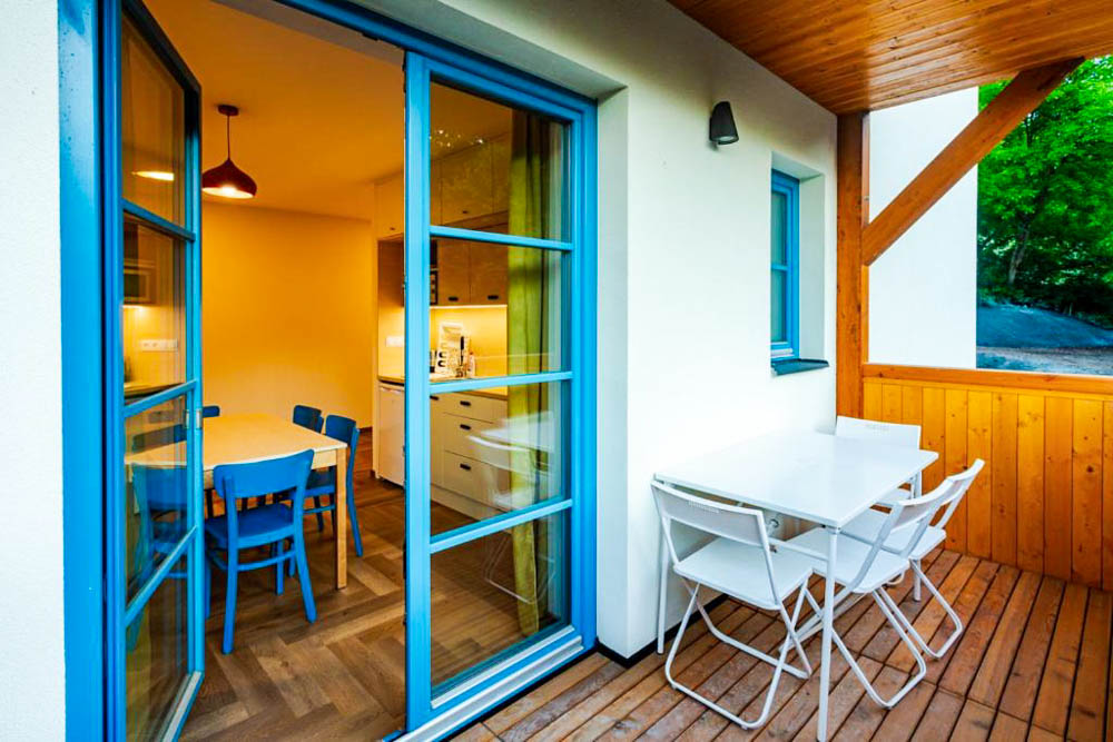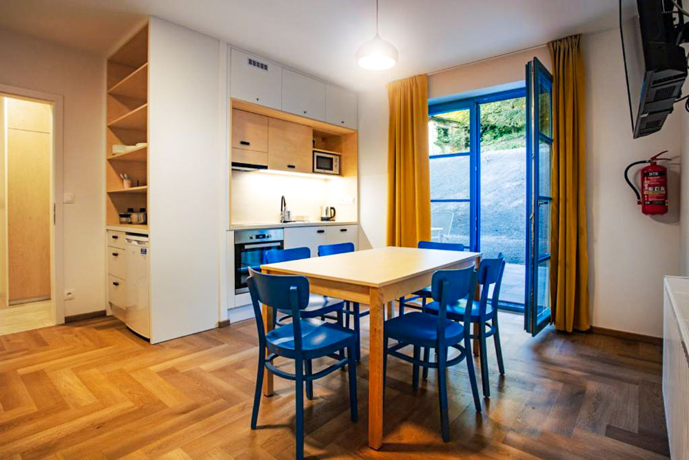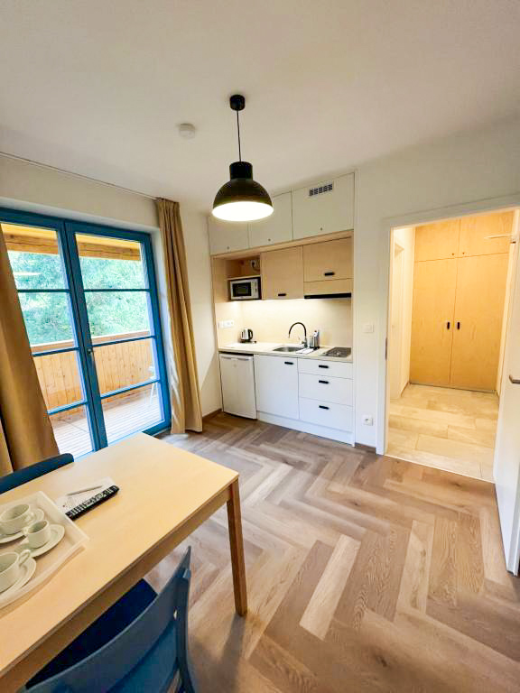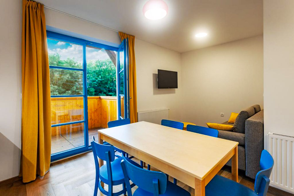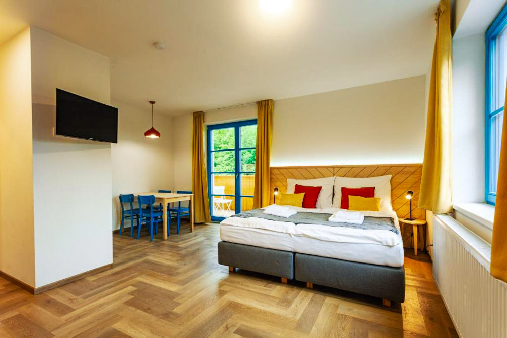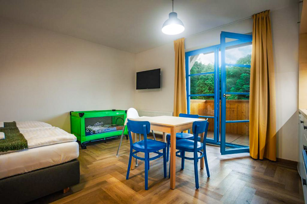 Hosté si mohou vybrat mezi apartmány s oddělenou ložnicí a samostatnou kuchyní, které jsou vhodné především pro rodiny nebo skupiny vyžadující více soukromí, a studii, kde je kuchyňský kout integrován přímo do obytného prostoru. Všechny jednotky bez výjimky disponují vlastním balkonem nebo terasou s venkovním posezením a výhledem do okolních lesů a na beskydské vrcholy.