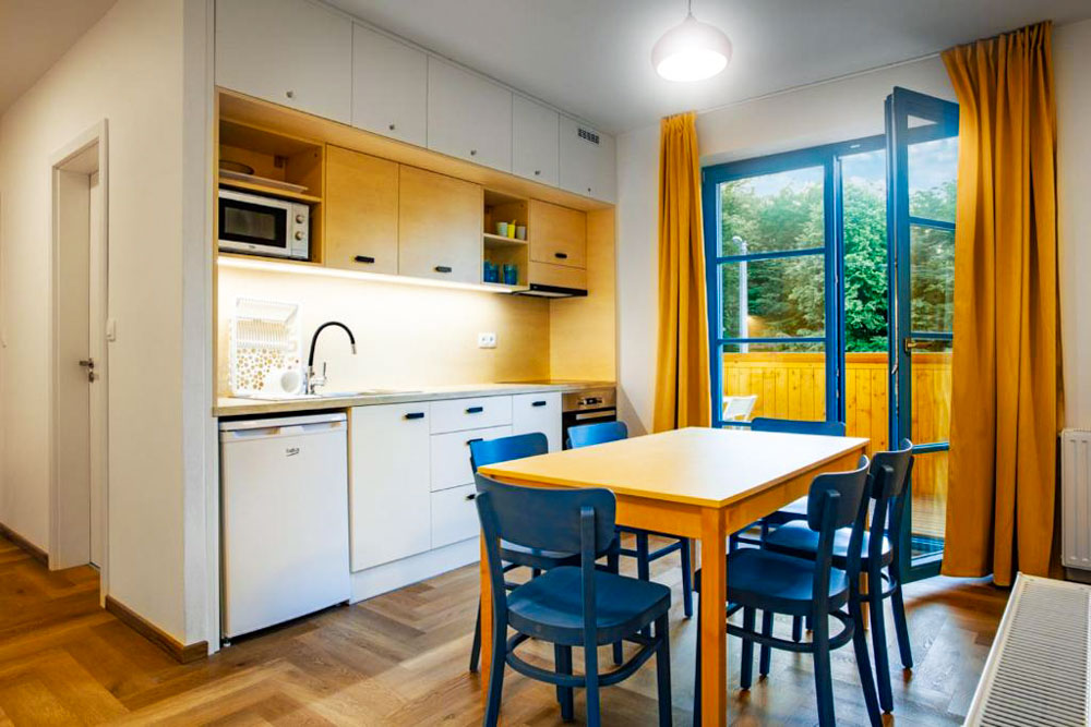 Kuchyně jsou vybaveny nadstandardně a umožňují plnohodnotné vlastní stravování. K dispozici je lednice, varná deska, trouba nebo mikrovlnná trouba s grilem, rychlovarná konvice a kompletní sada nádobí. Samozřejmostí je televizor s plochou obrazovkou, rychlé Wi-Fi připojení a moderní koupelna se sprchovým koutem a fénem.
