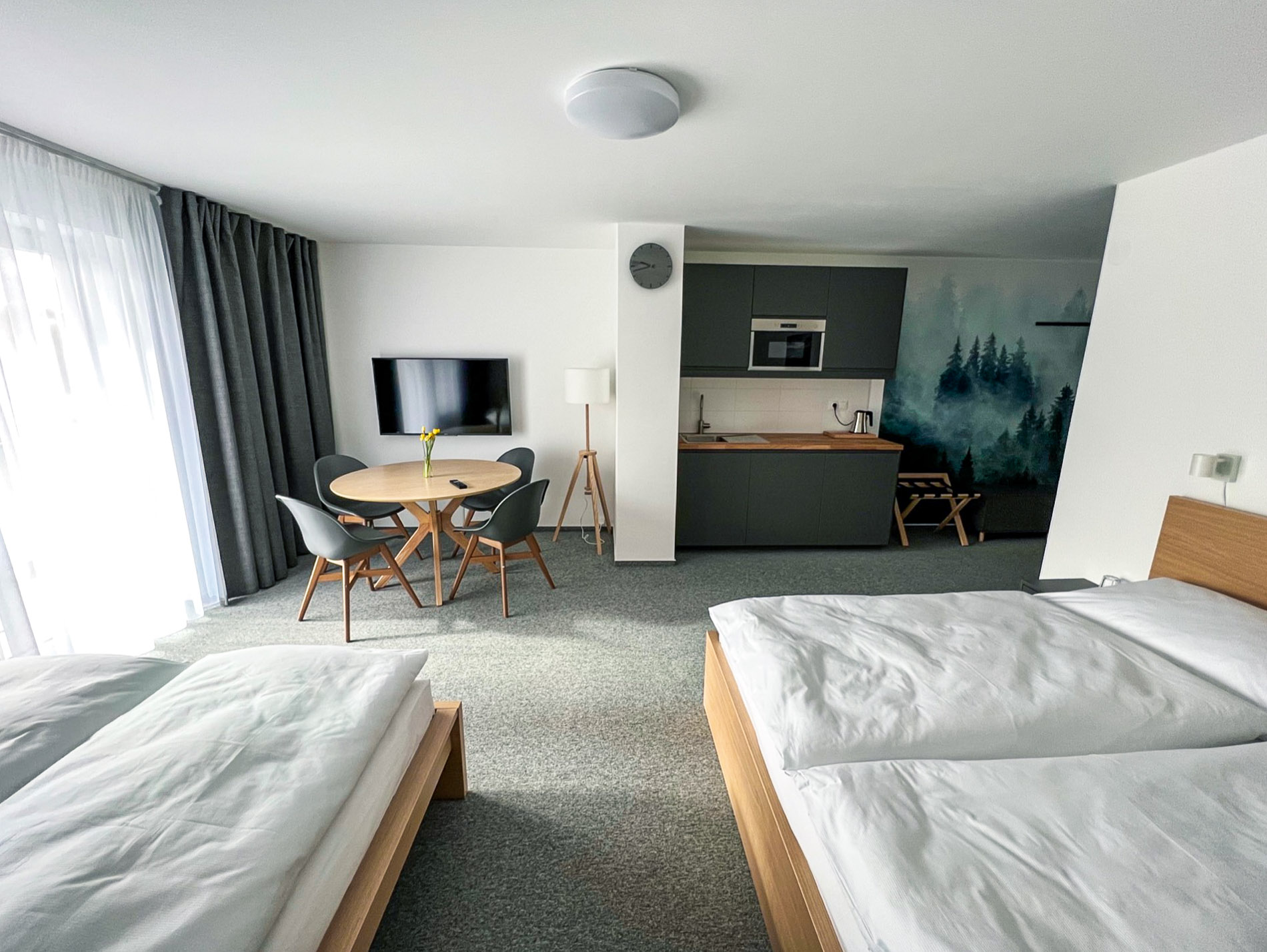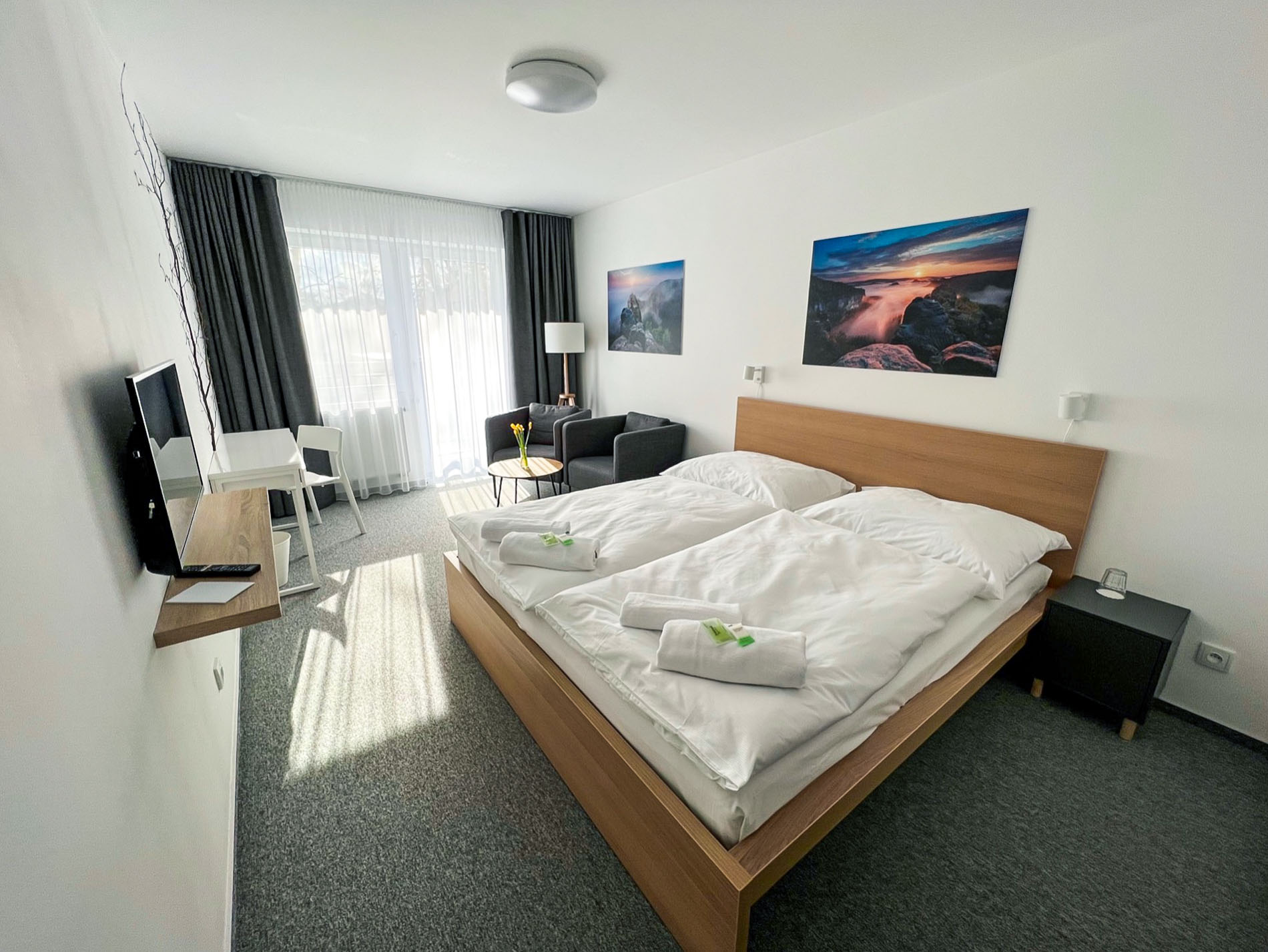Ubytování vám nabízíme v moderně navrženém hotelu v moderním duchu. Celá budova prošla kompletní rekonstrukcí a hotel voní novotou. Ubytovat se můžete v prostorných dvou a třílůžkových pokojích a čtyřlůžkovém apartmán. Všechny pokoje mají vlastní sociální zařízení (sprcha, umyvadlo, fén, wc), televizi, set pro přípravu kávy nebo čaje a apartmá má navíc vybavenou kuchyňku. V hotelu vám bude k dispozici recepce, lobby bar s kavárnou a velká společenská místnost. Pro děti je zajištěn dětský koutek a venkovní hřiště. Na udržované zahradě je možnost si pronajmout venkovní vířivku a dopřát si relaxu. Samozřejmostí je WIFI připojení k internetu a monitorované parkoviště. Od hotelu se můžete vydat na procházku na zdejší Rozhlednu Hrádek nebo opačný směrem je vyhlášený pivovar Kocour. Za výlety se můžete vydat jak do Českého Švýcarska, tak i Lužických hor. Obě tyto nádherné lokality jsou vzdáleny pouhých 9,5 km od hotelu. Rovněž vám přijde vhod blízký hraniční přechod do Německa.