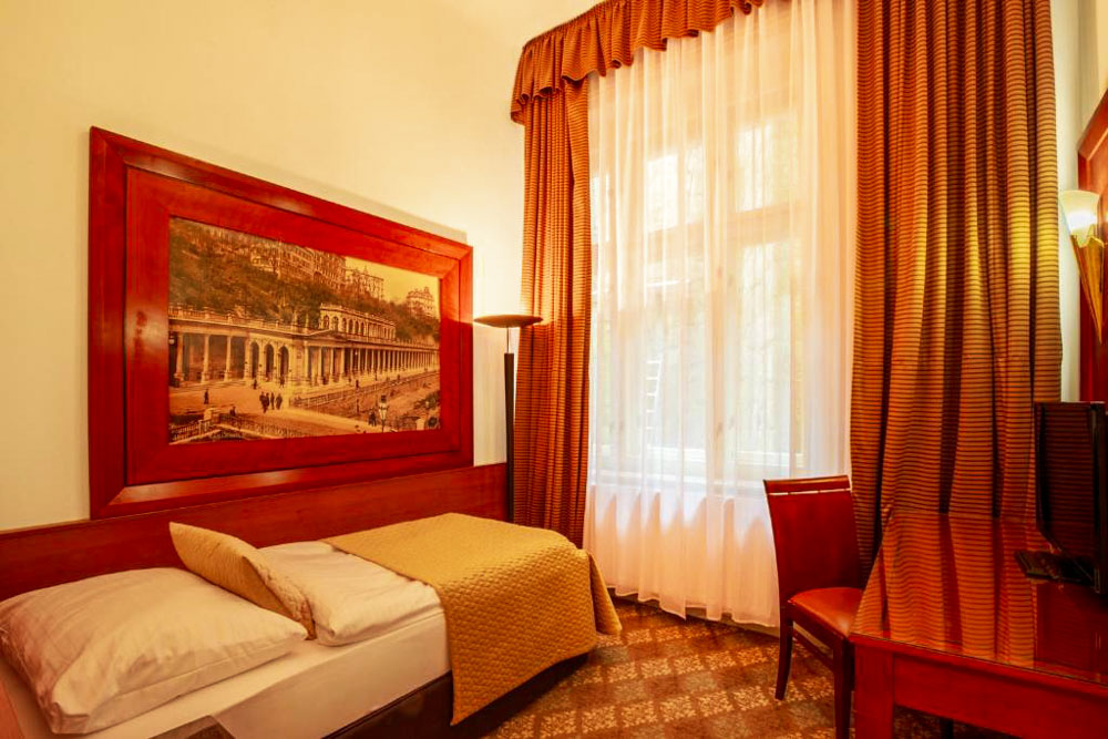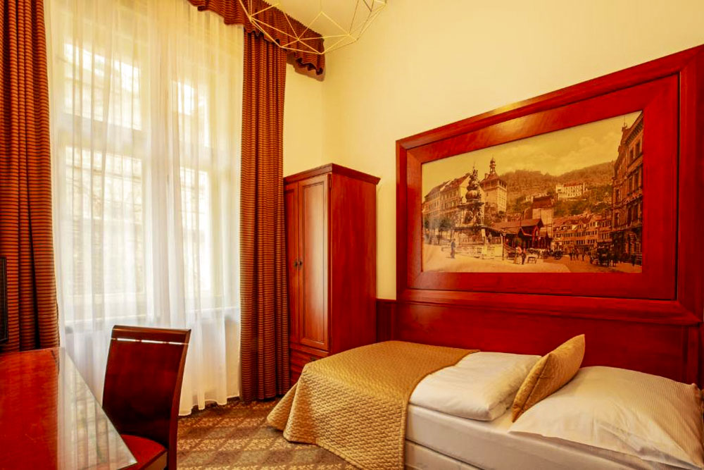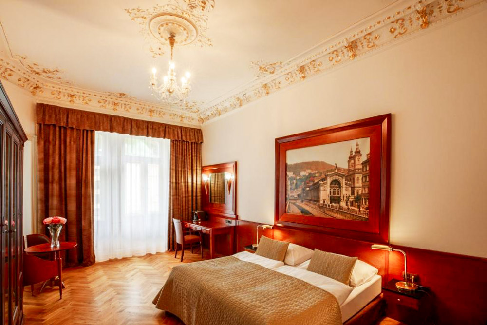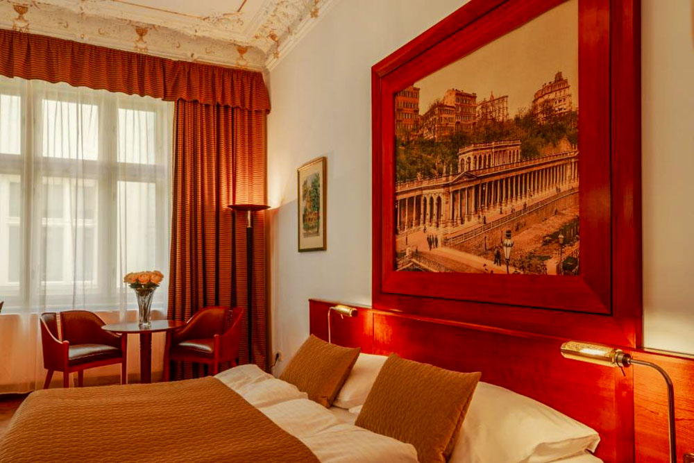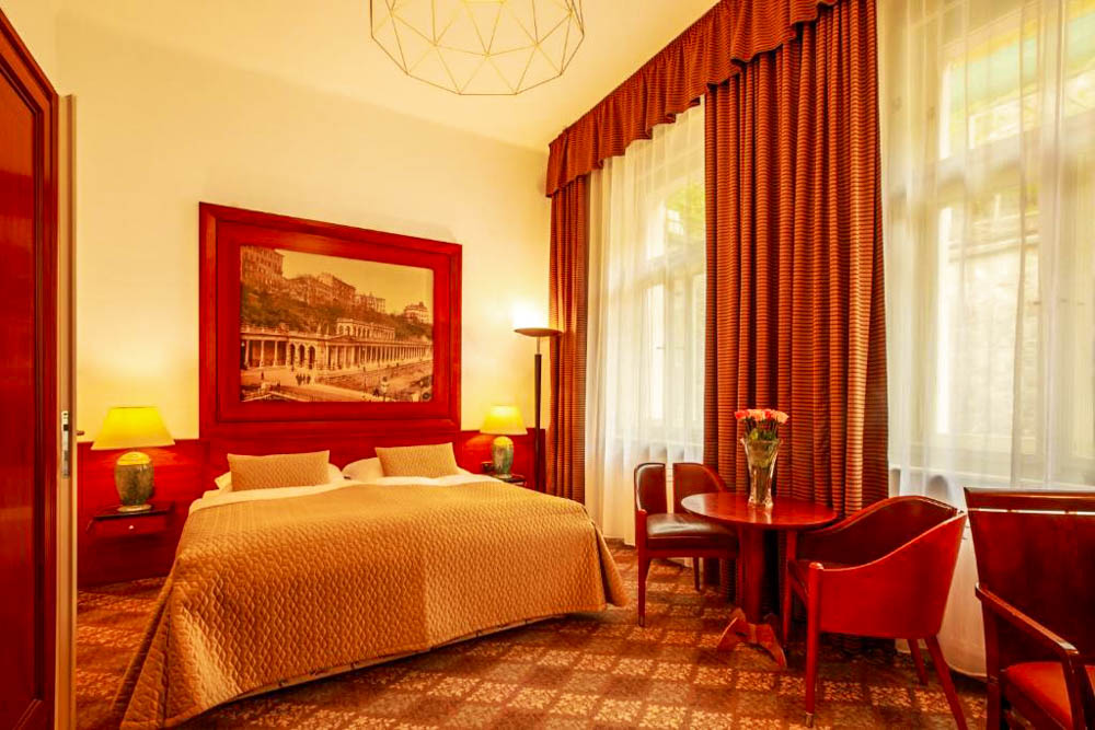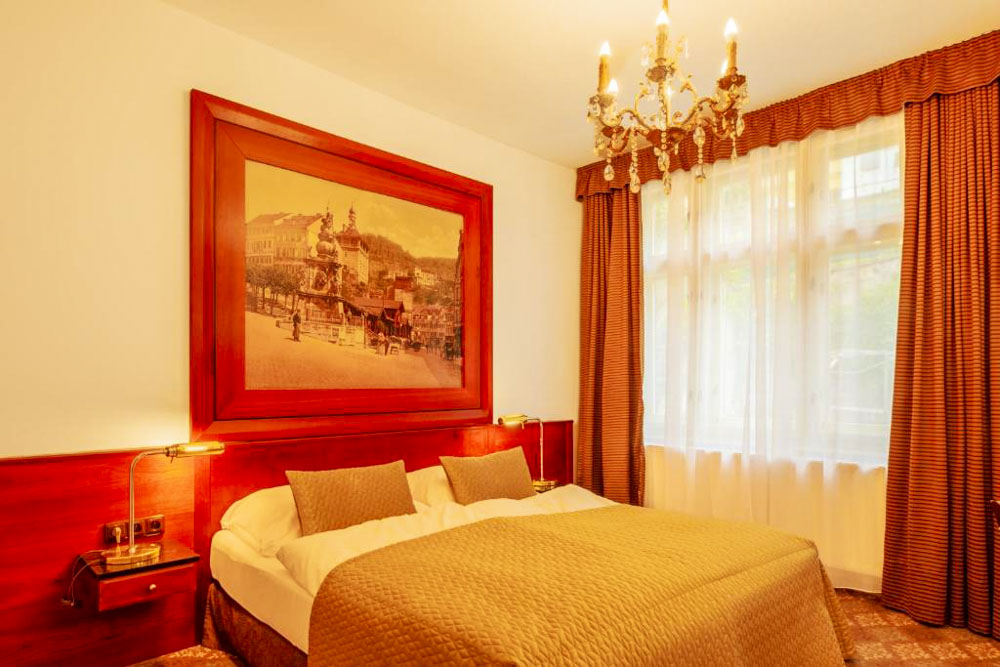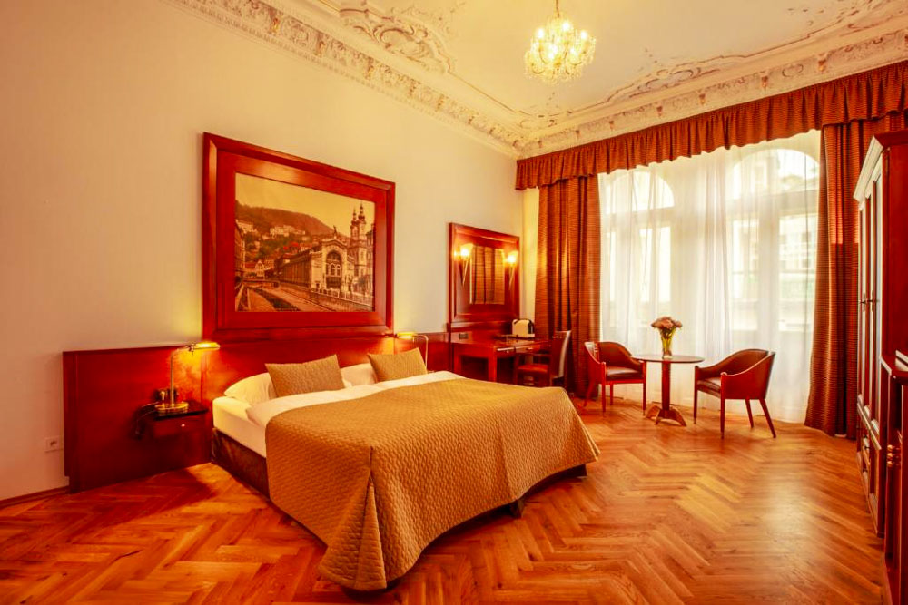 Hosté si mohou vybrat z pokojů Deluxe s balkonem a výhledem na město, apartmánu s dvěma ložnicemi a kuchyňským koutem a klidných pokojů Comfort s orientací do dvora. Pokoje Deluxe (cca 35 m²) mají vysoké stropy, historický štuk a klasický dřevěný nábytek, dominantu tvoří manželská postel doplněná pohodlným posezením; část pokojů je připravena jako třílůžková varianta s dalším jednolůžkem. Apartmán (cca 50 m²) nabízí hlavní ložnici s manželskou postelí, druhou ložnici se dvěma oddělenými lůžky a obývací prostor s jídelním stolem a plně vybaveným kuchyňským koutem, takže je vhodný pro rodiny či delší pobyty; k dispozici je varianta s výhledem na Vřídlo a promenádu i klidnější varianta do vnitrobloku. Pokoje Comfort (cca 25 m²) jsou laděny v elegantním stylu Art Deco a nabízejí dvoulůžkové uspořádání s manželskou postelí, variantu se dvěma oddělenými lůžky v samostatných místnostech i jednolůžkové pokoje pro hosty, kteří preferují maximální klid.