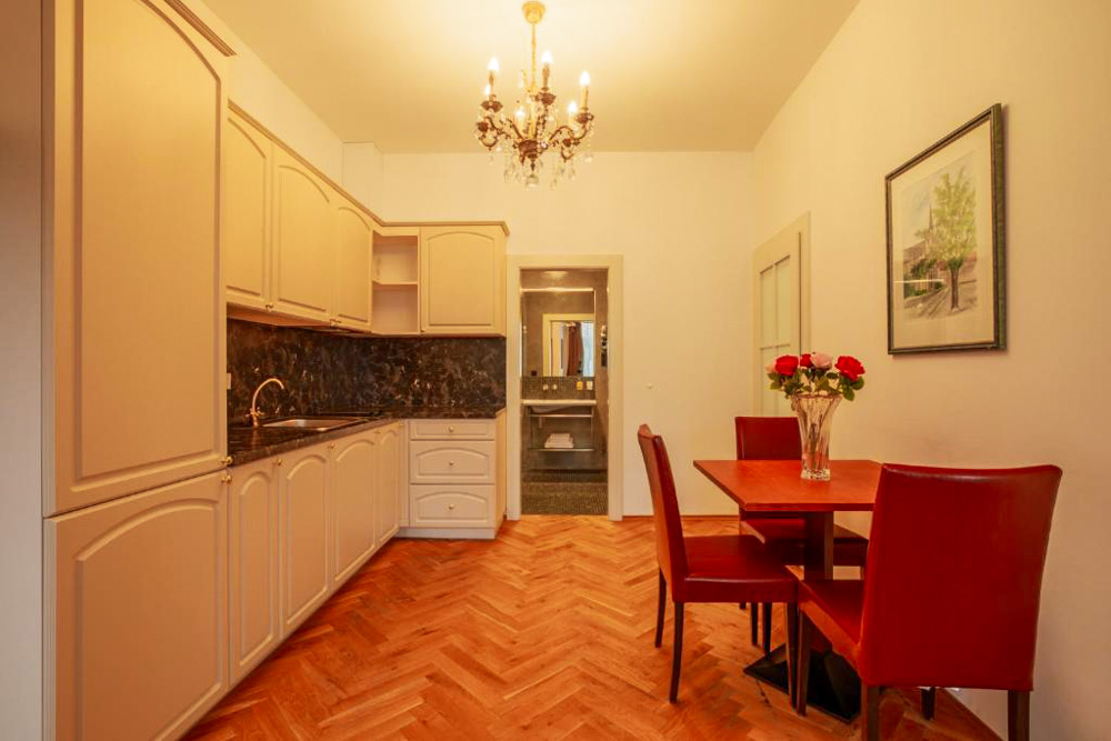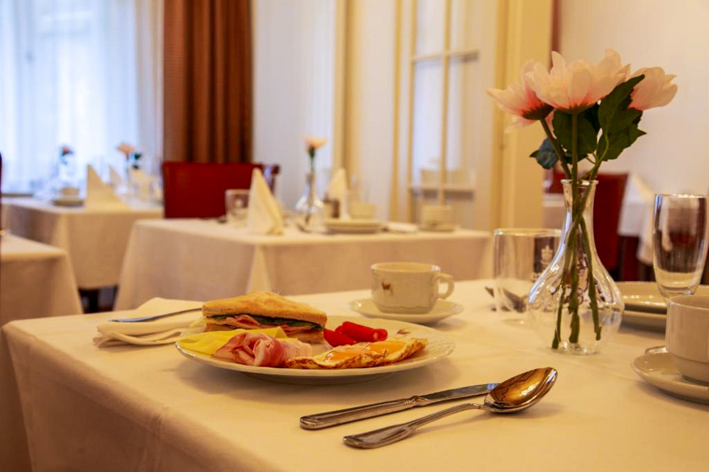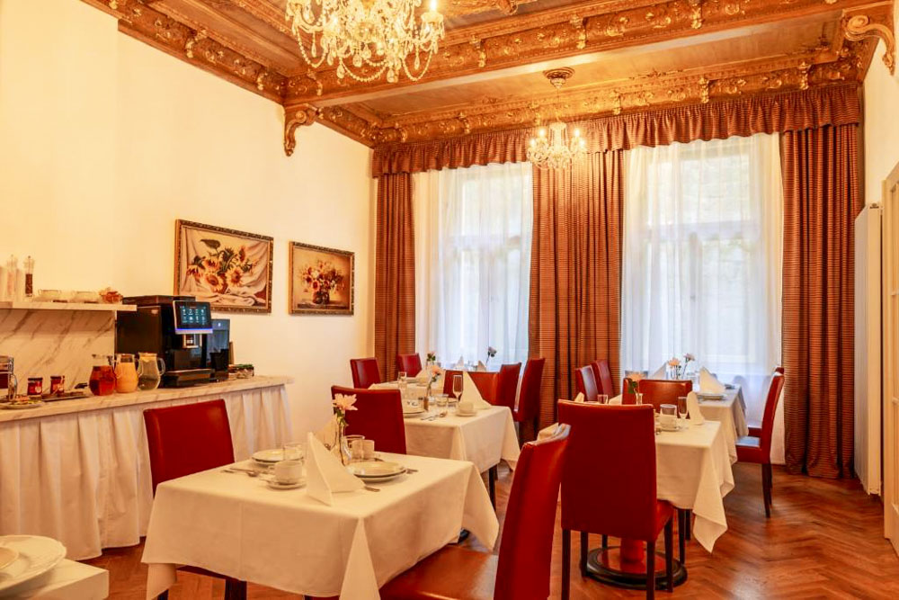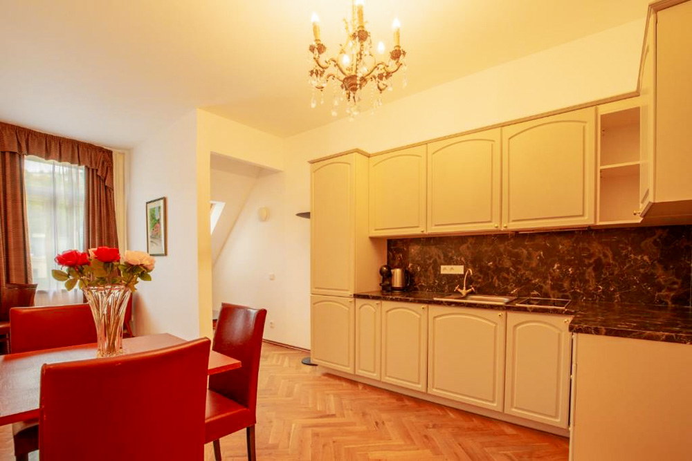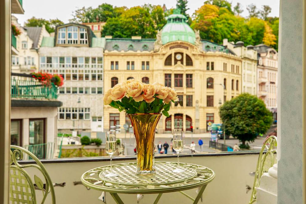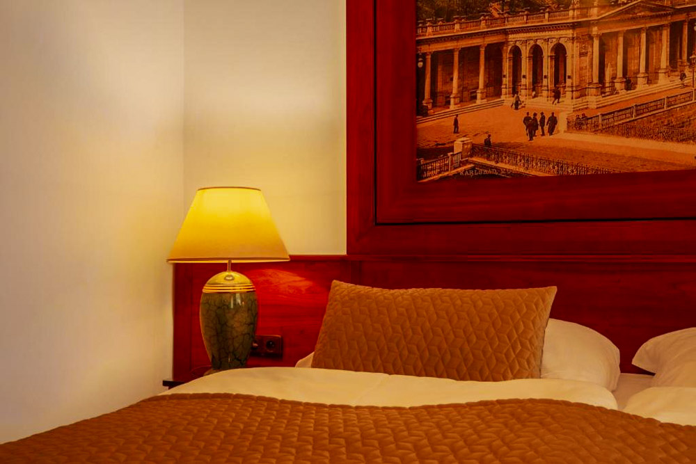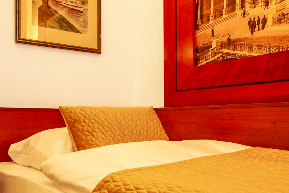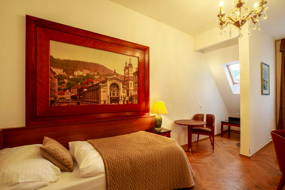 Hosté si mohou vybrat z pokojů Deluxe s balkonem a výhledem na město, apartmánu s dvěma ložnicemi a kuchyňským koutem a klidných pokojů Comfort s orientací do dvora. Pokoje Deluxe (cca 35 m²) mají vysoké stropy, historický štuk a klasický dřevěný nábytek, dominantu tvoří manželská postel doplněná pohodlným posezením; část pokojů je připravena jako třílůžková varianta s dalším jednolůžkem. Apartmán (cca 50 m²) nabízí hlavní ložnici s manželskou postelí, druhou ložnici se dvěma oddělenými lůžky a obývací prostor s jídelním stolem a plně vybaveným kuchyňským koutem, takže je vhodný pro rodiny či delší pobyty; k dispozici je varianta s výhledem na Vřídlo a promenádu i klidnější varianta do vnitrobloku. Pokoje Comfort (cca 25 m²) jsou laděny v elegantním stylu Art Deco a nabízejí dvoulůžkové uspořádání s manželskou postelí, variantu se dvěma oddělenými lůžky v samostatných místnostech i jednolůžkové pokoje pro hosty, kteří preferují maximální klid.