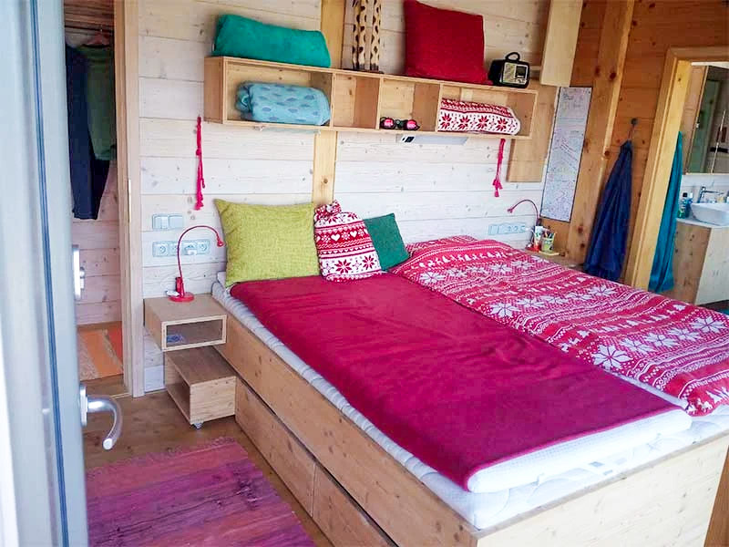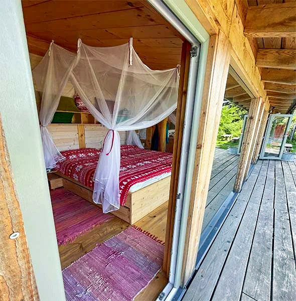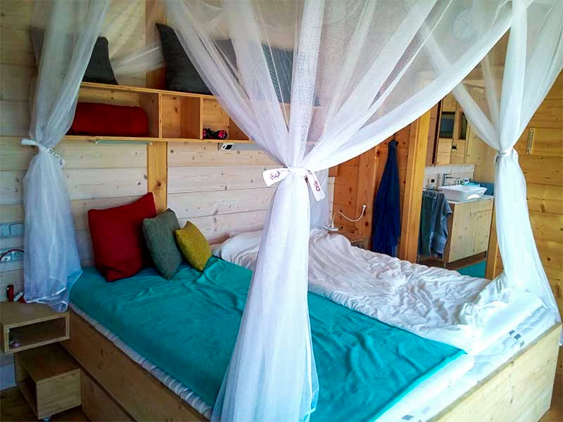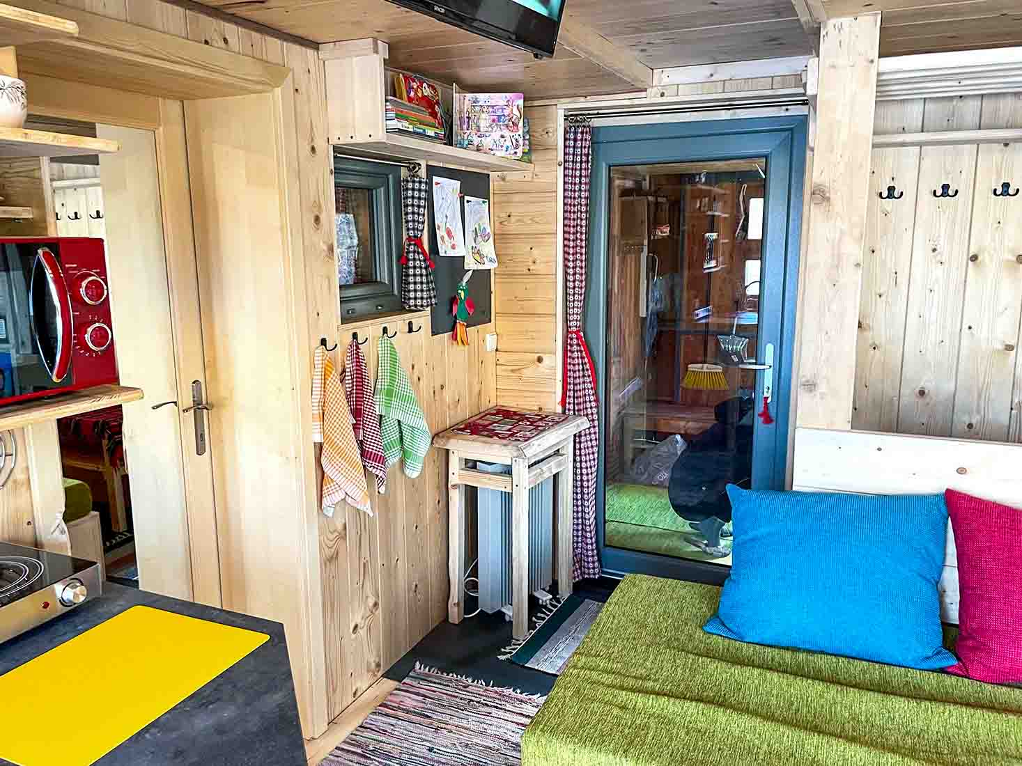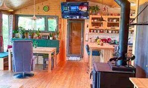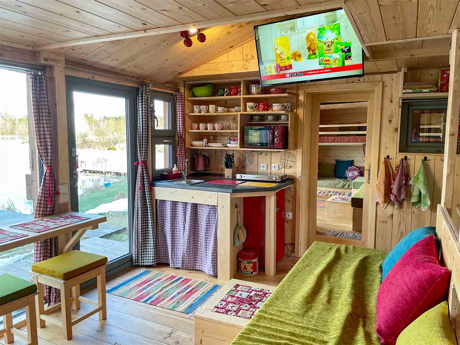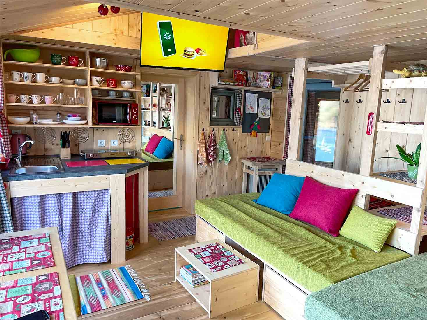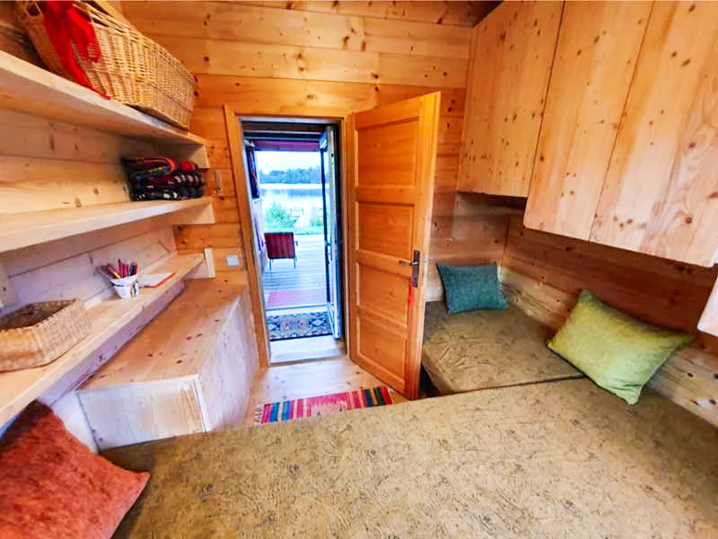 Zadní menší část nabízí 4 lůžka a 1 přistýlku v jedné místnosti, vlastní kuchyňský kout, koupelnu, tři samostatné vstupy, terasu se sezením a vlastní molo. Kuchyň je vybavena základními spotřebiči jako indukční vařič, mikrovlnka, lednice, kávovar, topinkovač či rýžovar. Nechybí Wi-Fi, televize, rádio s bluetooth, pračka se sušičkou, dostatek úložných prostor ani vybavení pro děti včetně postýlky, vaničky či nočníku.