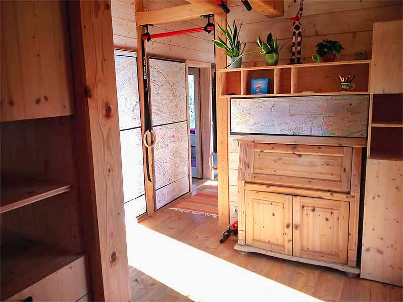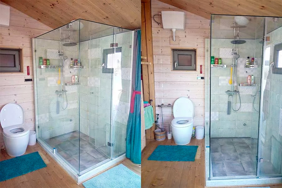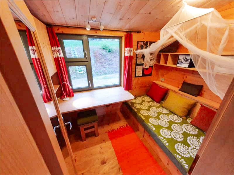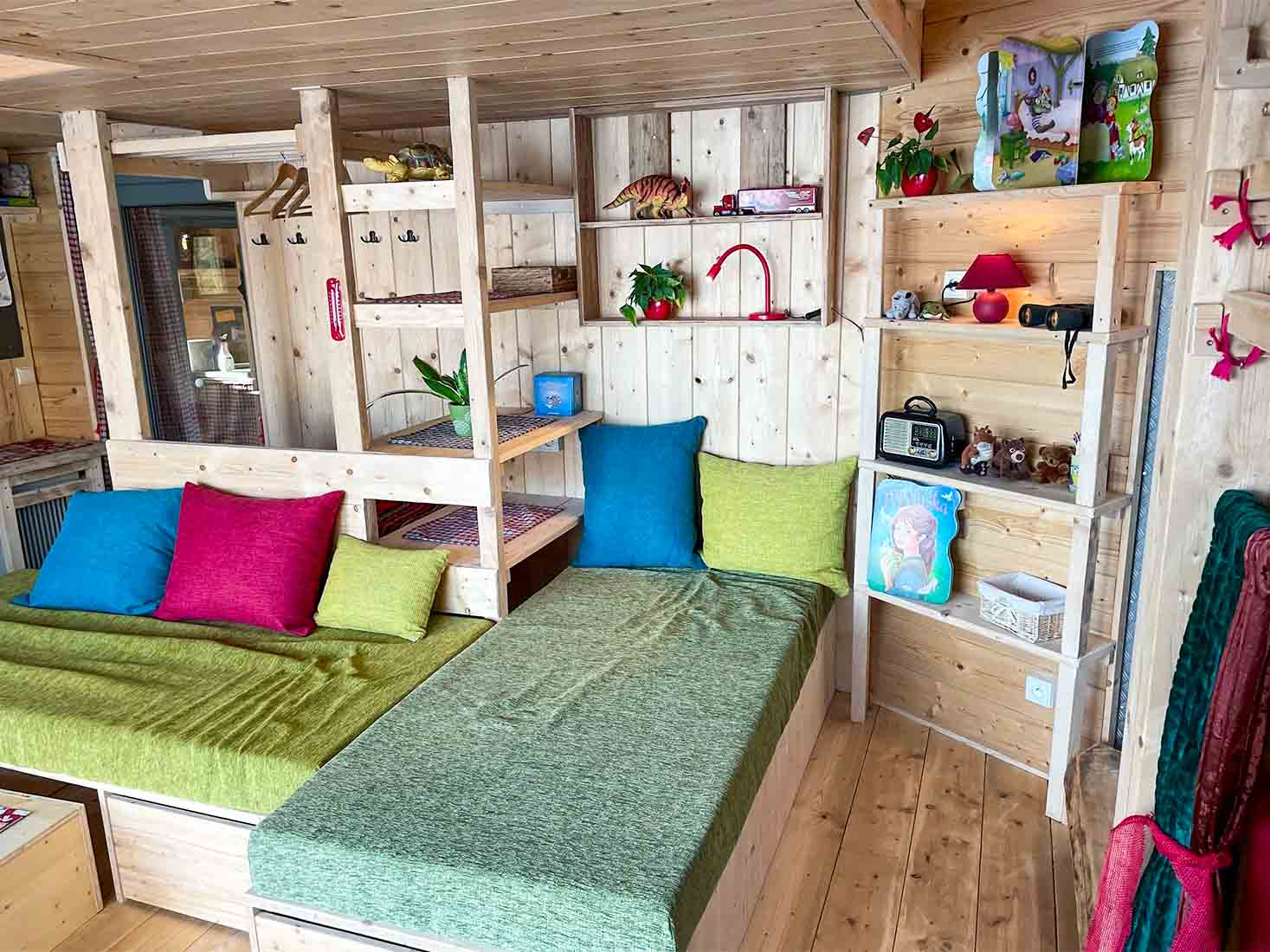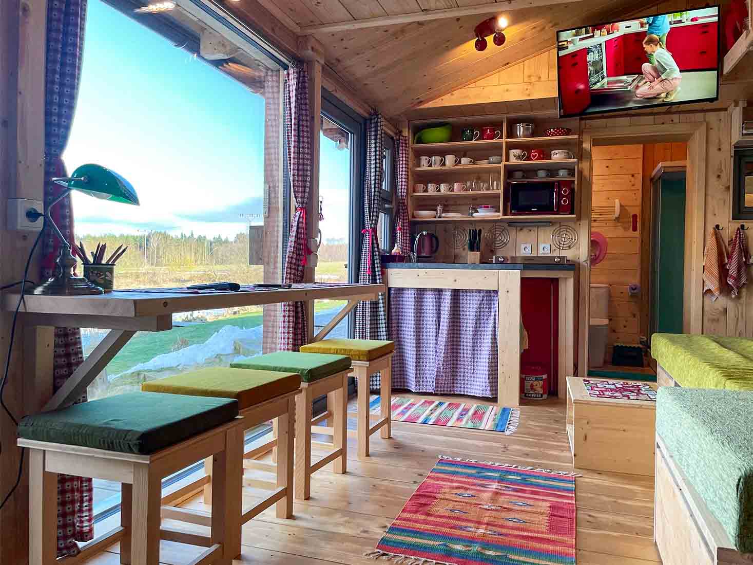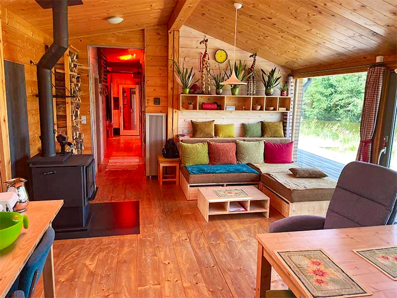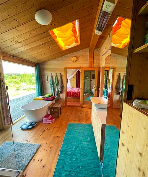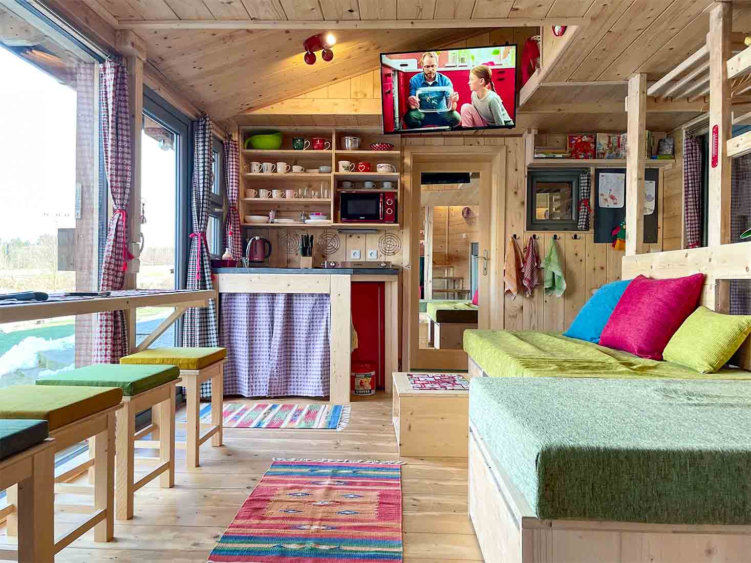 Zadní menší část nabízí 4 lůžka a 1 přistýlku v jedné místnosti, vlastní kuchyňský kout, koupelnu, tři samostatné vstupy, terasu se sezením a vlastní molo. Kuchyň je vybavena základními spotřebiči jako indukční vařič, mikrovlnka, lednice, kávovar, topinkovač či rýžovar. Nechybí Wi-Fi, televize, rádio s bluetooth, pračka se sušičkou, dostatek úložných prostor ani vybavení pro děti včetně postýlky, vaničky či nočníku.