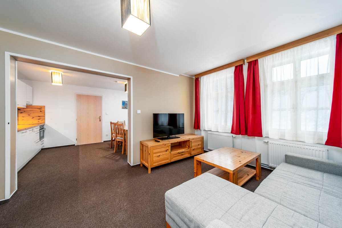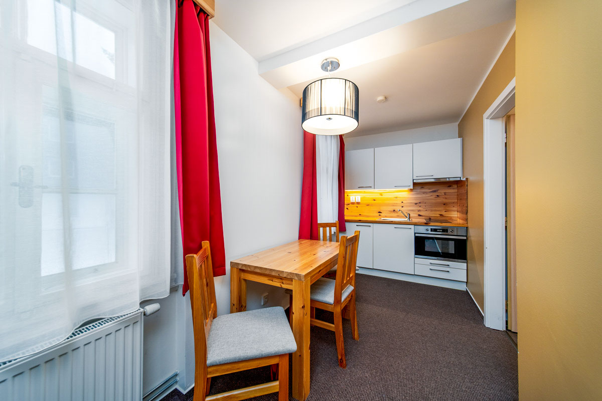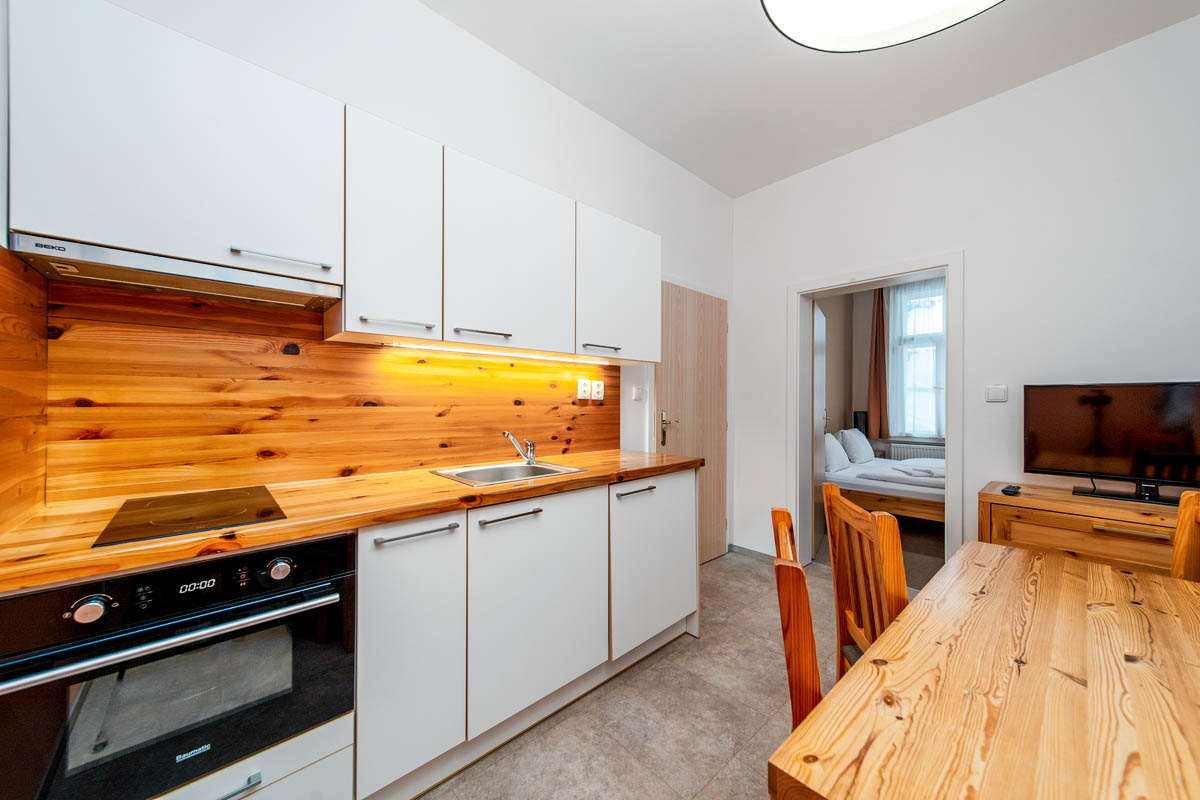Apartmány jsou zařízeny v jednotném moderním stylu s důrazem na praktičnost a pohodlí při delších i kratších pobytech. Díky vlastní kuchyni si hosté mohou připravovat jídlo podle svých potřeb, což ocení zejména rodiny s dětmi nebo hosté preferující flexibilitu během dne. Nechybí ani ručníky a základní hygienické vybavení, takže ubytování je připravené k okamžitému využití bez nutnosti dalších starostí.