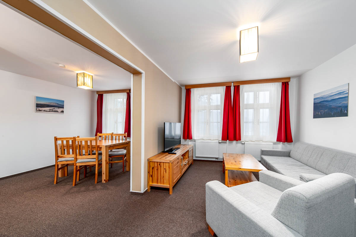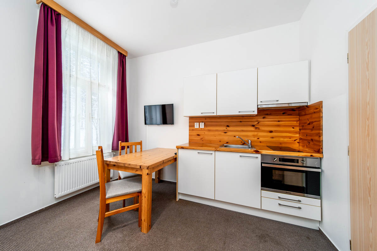Pension Janský Potok I. disponuje několika typy apartmánů s kapacitou od 2 do 6 osob. K dispozici jsou studia pro dvě osoby, bezbariérové studio, apartmány s jednou ložnicí pro 3–4 osoby, větší apartmány se dvěma ložnicemi až pro 6 osob a také prostorné superior apartmány. Všechny jednotky jsou vybaveny vlastní koupelnou (se sprchou nebo vanou), plně vybavenou kuchyní s troubou, indukční deskou, mikrovlnnou troubou a jídelním koutem, televizí, dostatkem úložných prostor a Wi-Fi připojením.