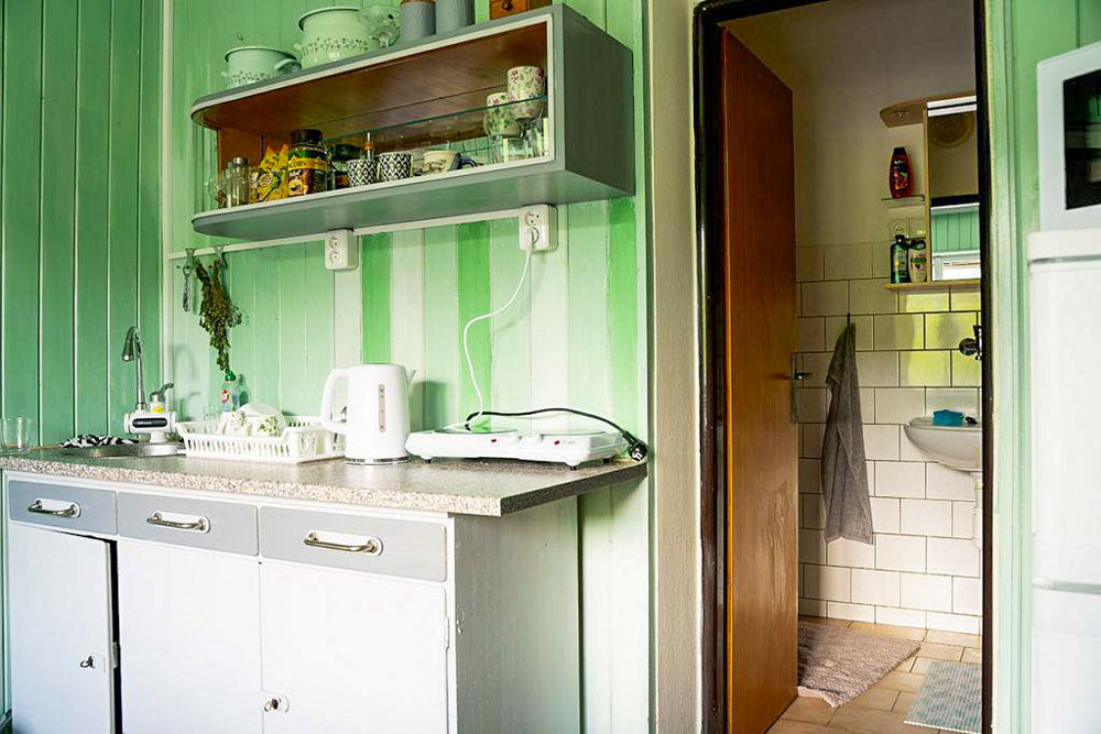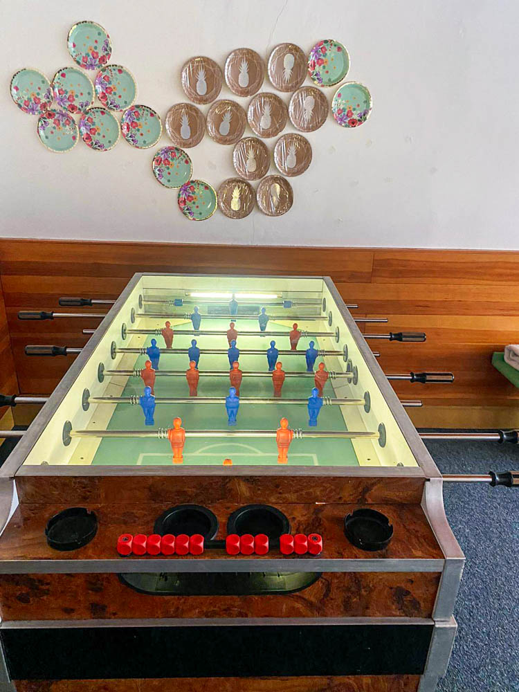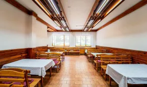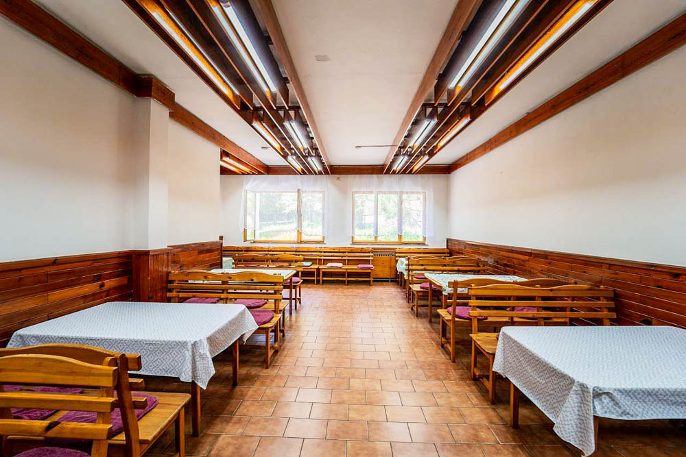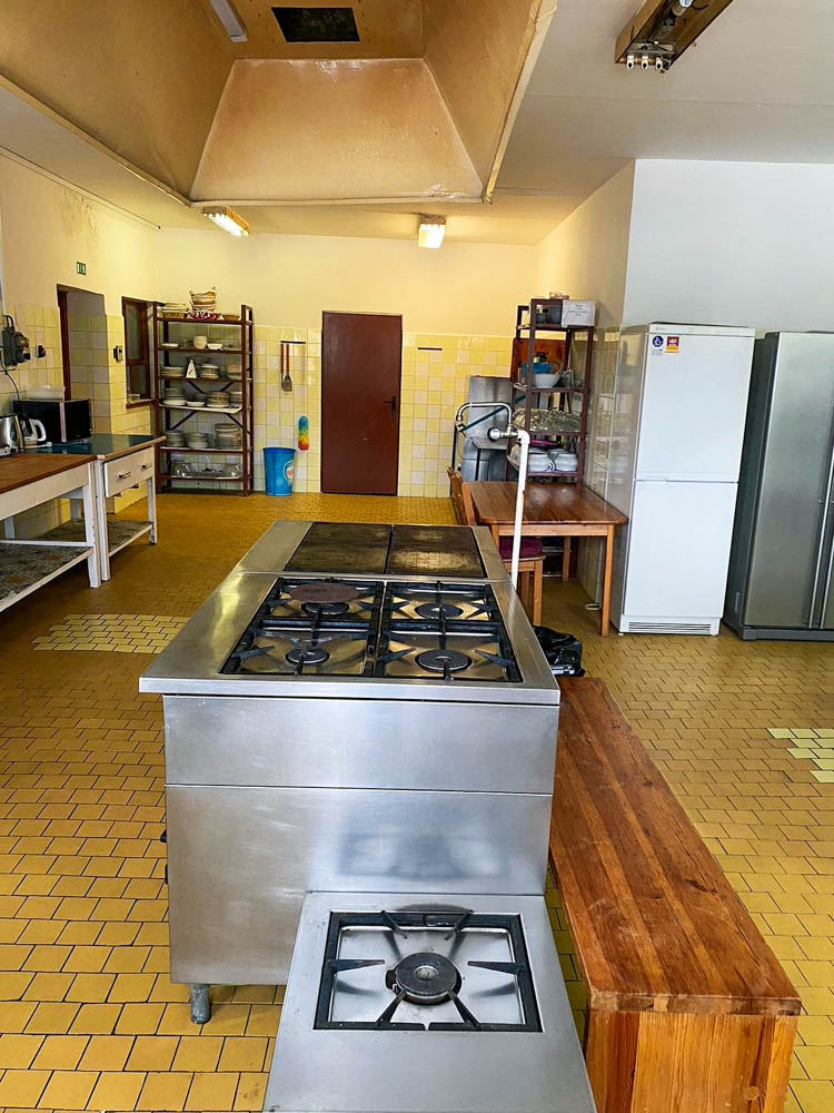 Hosté mohou využívat plně vybavenou profesionální kuchyni s několika sporáky, troubami, lednicemi, mikrovlnnými troubami i rychlovarnými konvicemi. Vedle kuchyně se nachází prostorná jídelna s barovým pultem a televizí, která slouží i jako společenská místnost. K dispozici je také dětská herna se sedacími vaky, hračkami a dalším zázemím, kterou lze využít i jako menší společenský salonek.