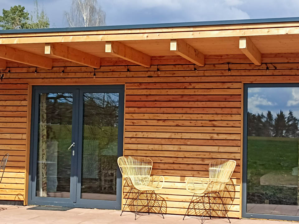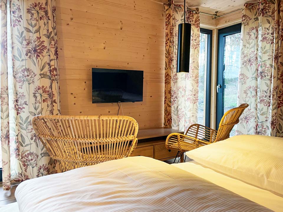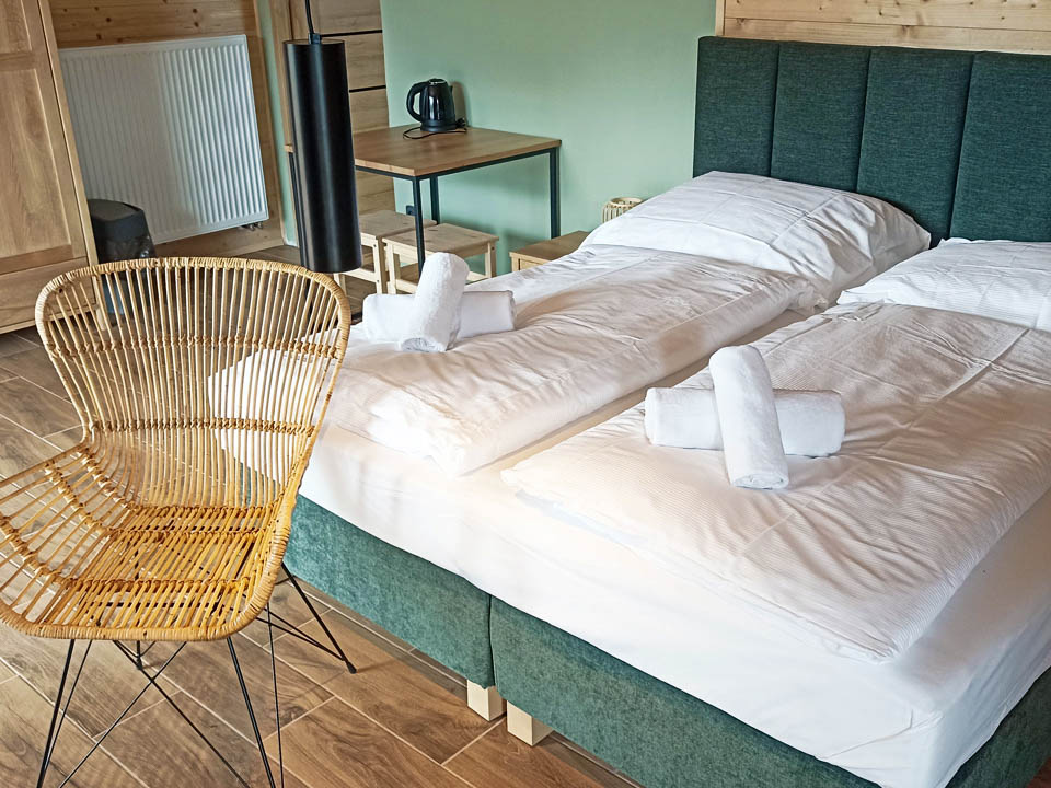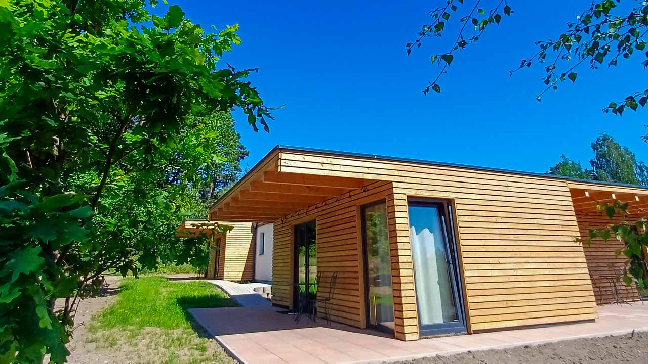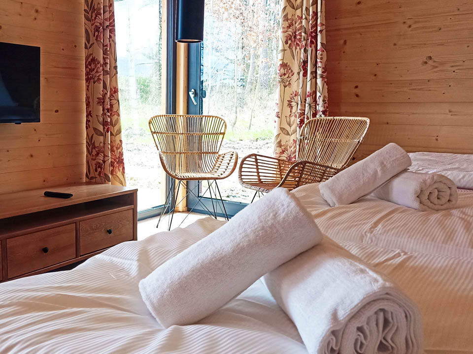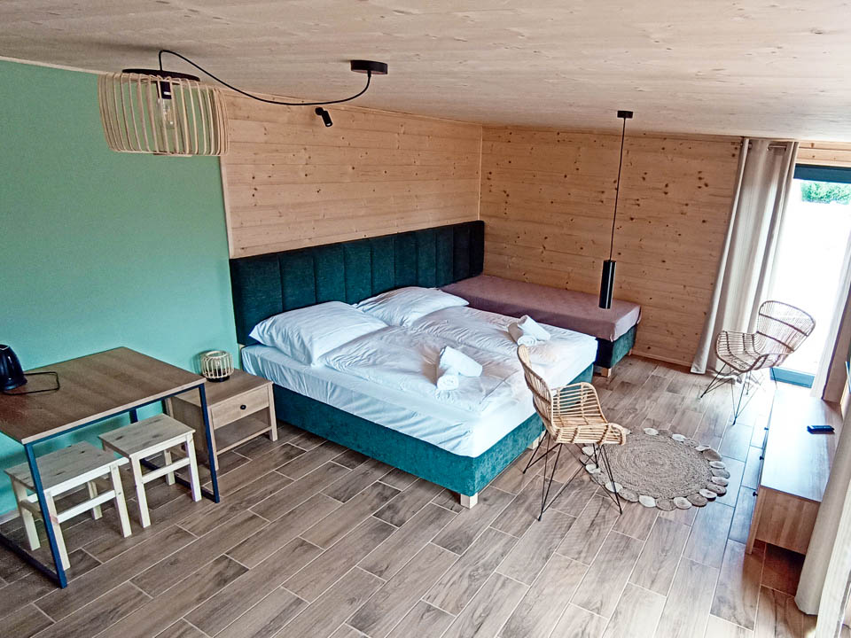 Součástí areálu jsou také moderní glampingové chaty Polojasno pro 2–4 osoby. Tyto luxusní dřevěné chaty mají vlastní koupelnu, WC, terasu, Wi-Fi, ložní prádlo, ručníky, kávovar, ohniště a gril. Hosté mohou využívat veškeré služby penzionu včetně restaurace, bazénu, sauny a dalších aktivit. Chaty jsou situovány na klidné louce u lesa s vlastním parkováním. Minimální délka pobytu je 3 noci v hlavní sezóně (červenec a srpen) a 2 noci mimo sezónu; v případě pobytu na jednu noc je účtován příplatek 800 Kč.