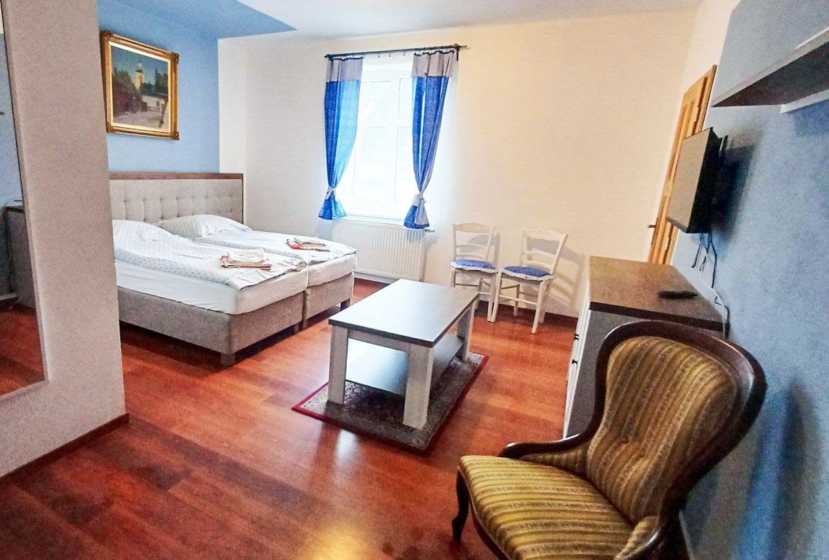 Penzion disponuje deseti plně vybavenými pokoji s celkovou kapacitou 46 lůžek. Každý pokoj má vlastní koupelnu, TV a některé také kuchyňku. Dva pokoje v přízemí mají samostatné vchody a jsou vhodné i pro hosty s omezenou pohyblivostí. Hosté mohou využít ubytování se snídaní, polopenzí nebo si vařit ve vlastní kuchyňce. Restaurace v retro stylu 20. let nabízí českou klasiku i speciality a čepuje piva z Malého Rohozce a Pilsner Urquell. Součástí areálu je také pískovcový vinný sklípek s příjemnou stálou teplotou.