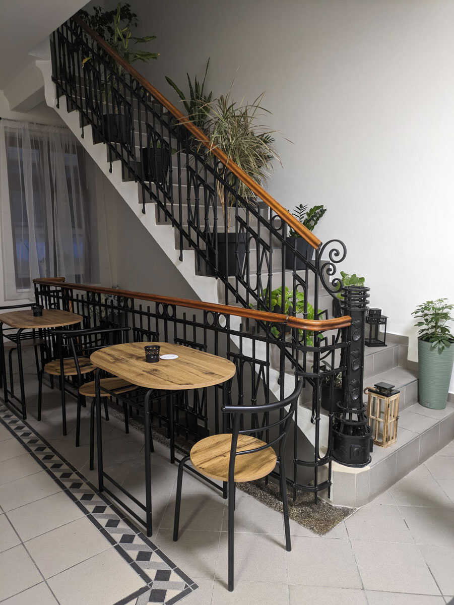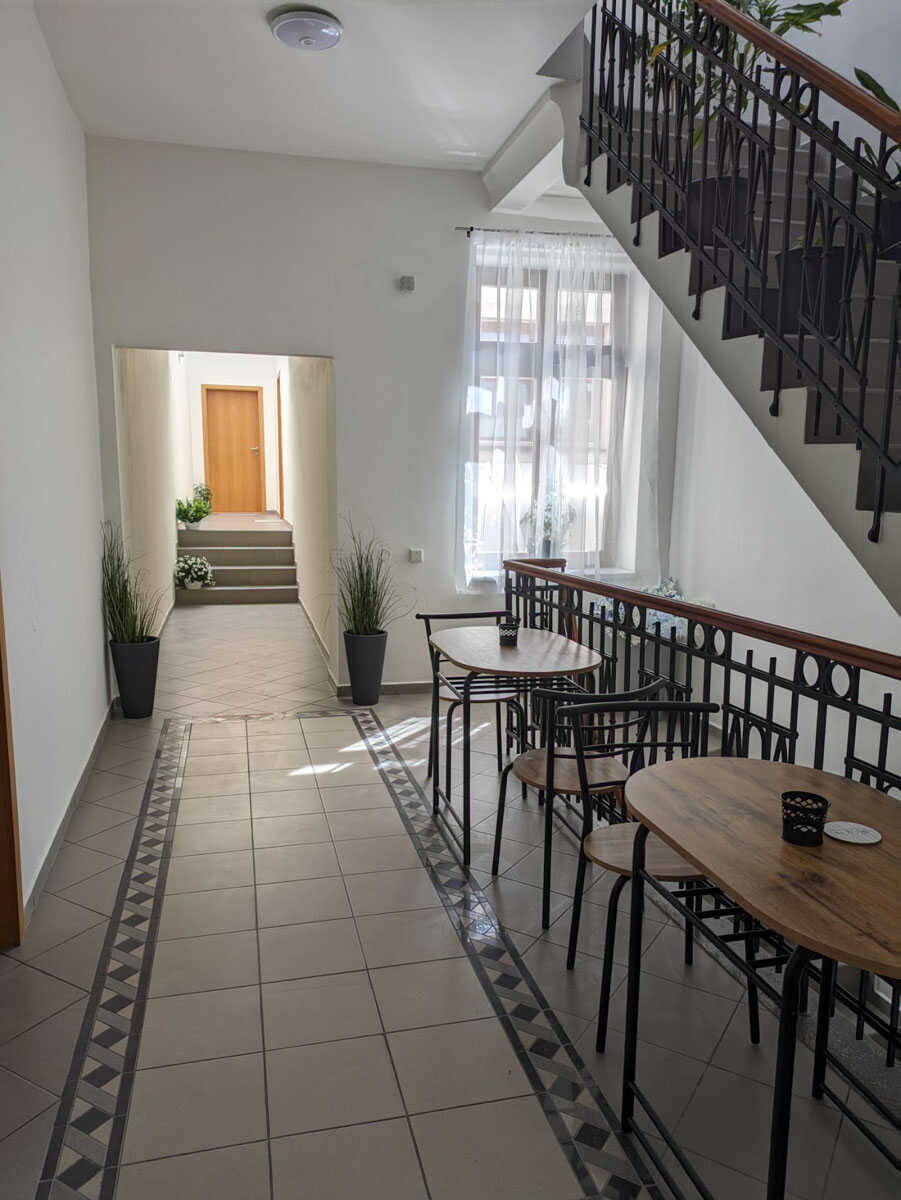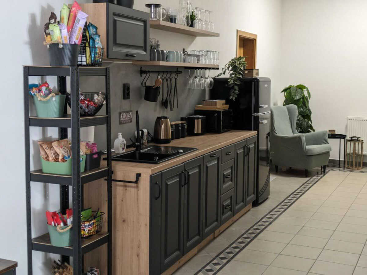Ve společných prostorách penzionu najdete útulné posezení a plně vybavenou kuchyňskou linku s lednicí, mikrovlnnou troubou, rychlovarnou konvicí, myčkou, indukční plotýnkou i nádobím. K dispozici je také káva, čaj a samoobslužný bar s nápoji a občerstvením. Na přání si hosté mohou objednat bohatou snídani z nedalekého bistra, která může být donášena přímo do penzionu.