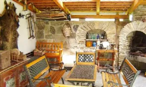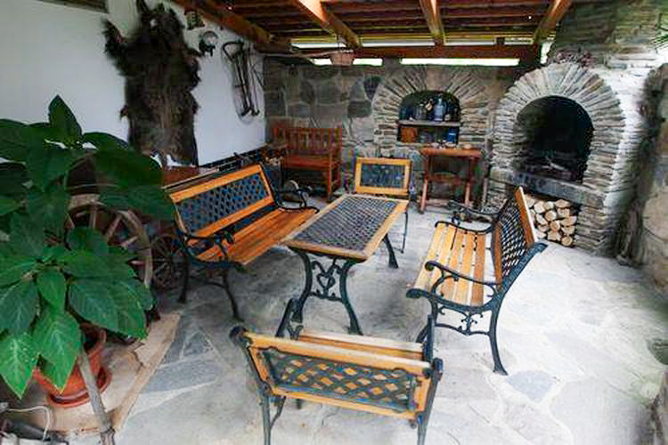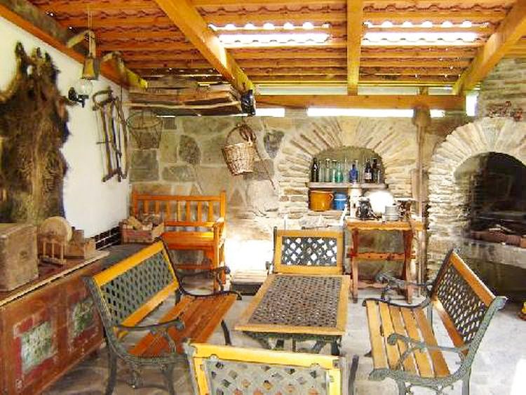 Krytá pergola s krbem pro grilování a venkovní posezení.