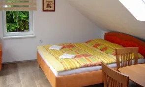 Apartmán 4 (pro 3–4 osoby): Dvě ložnice, vlastní koupelna a kuchyňský kout.