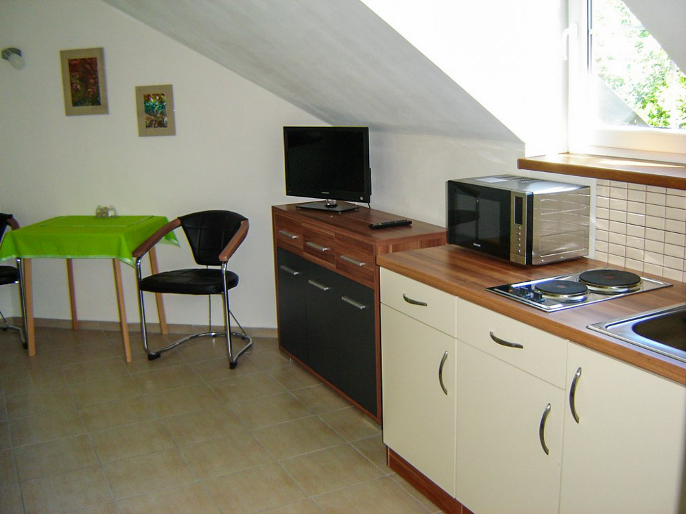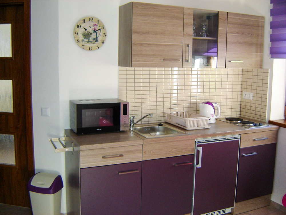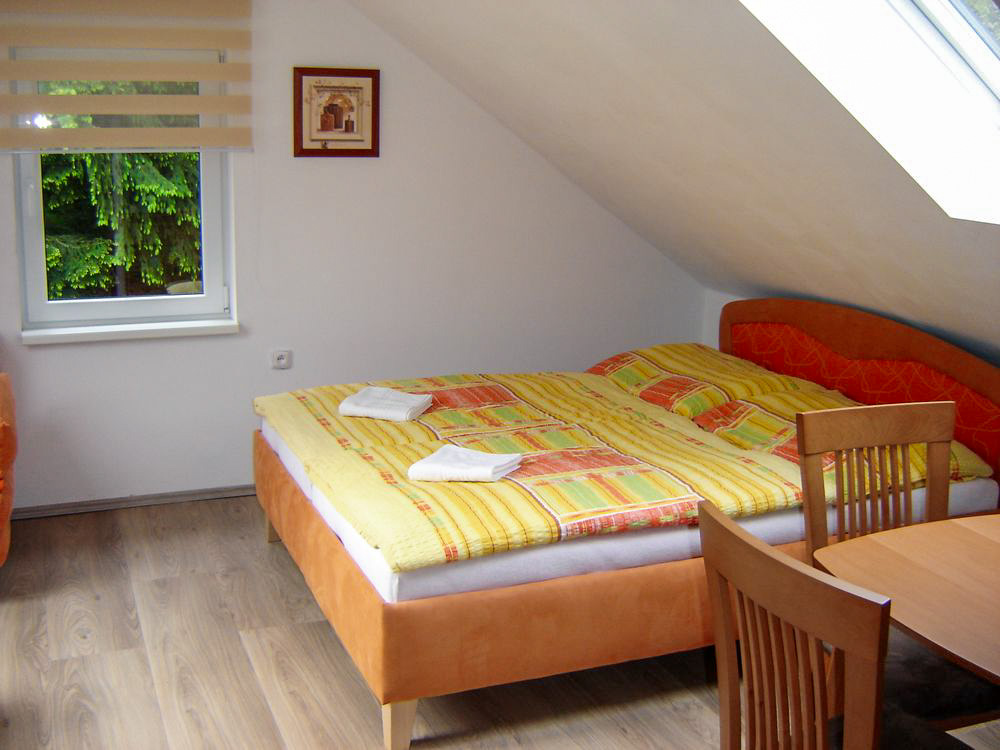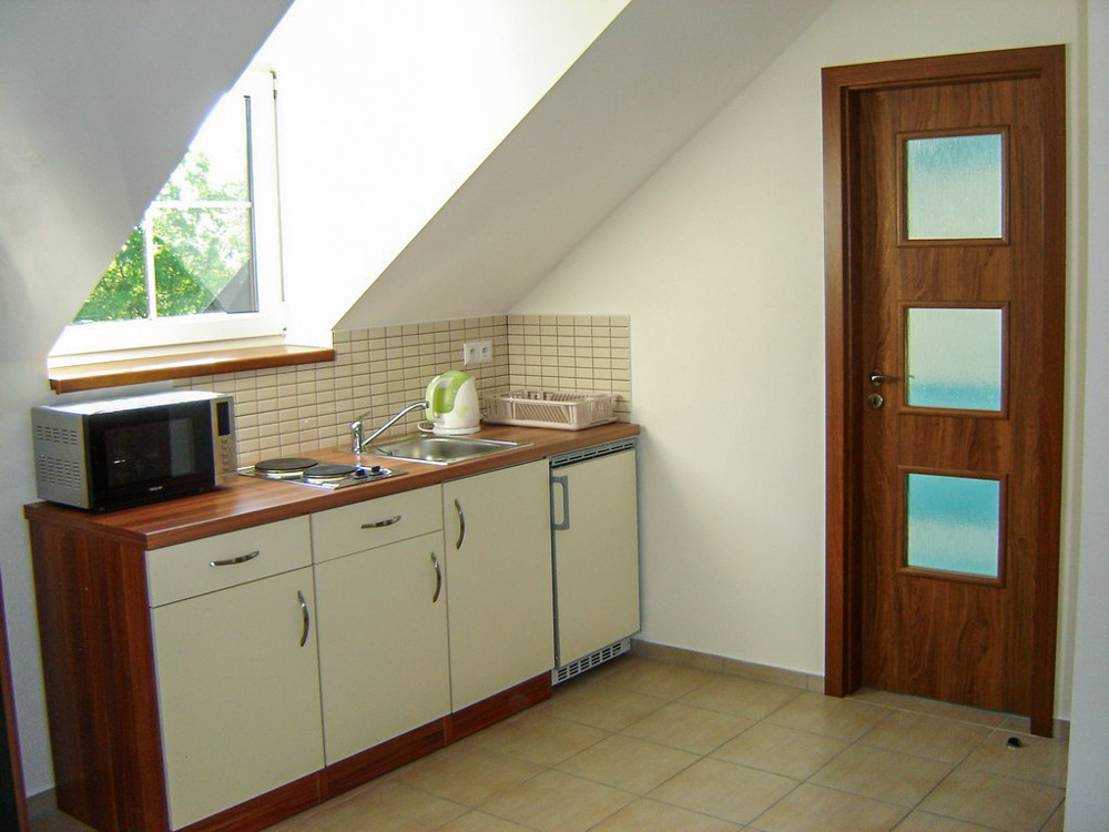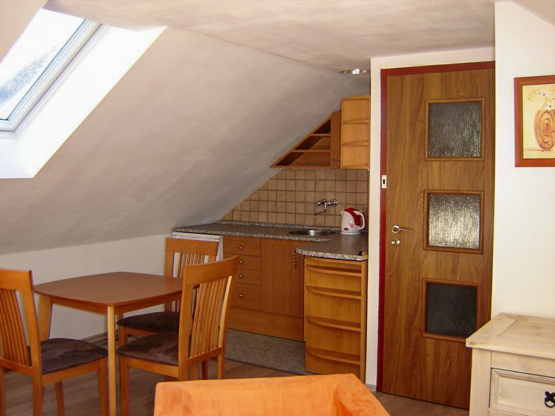Apartmán 3 (pro 2 osoby): Jedna ložnice, vlastní koupelna a kuchyňský kout.