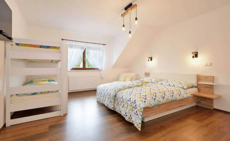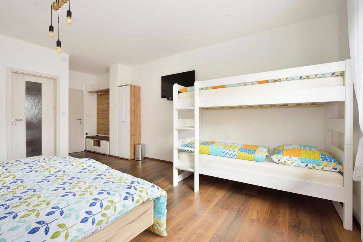 První a druhý pokoj jsou čtyřlůžkové – mají manželskou postel a palandu, jeden z nich navíc umožňuje přidání přistýlky. Třetí pokoj je třílůžkový s manželským a samostatným lůžkem a možností přistýlky i dětské postýlky.