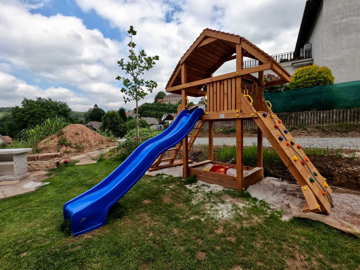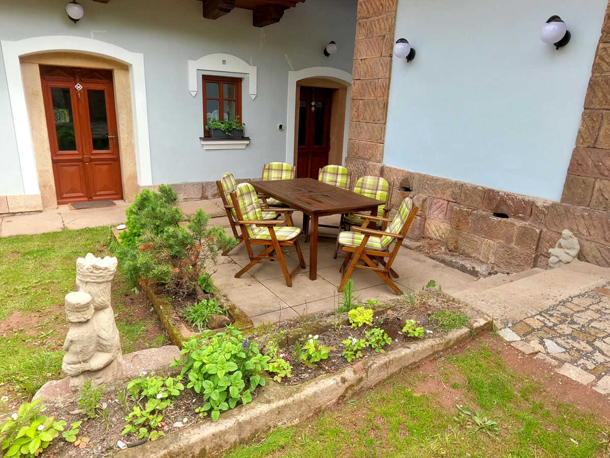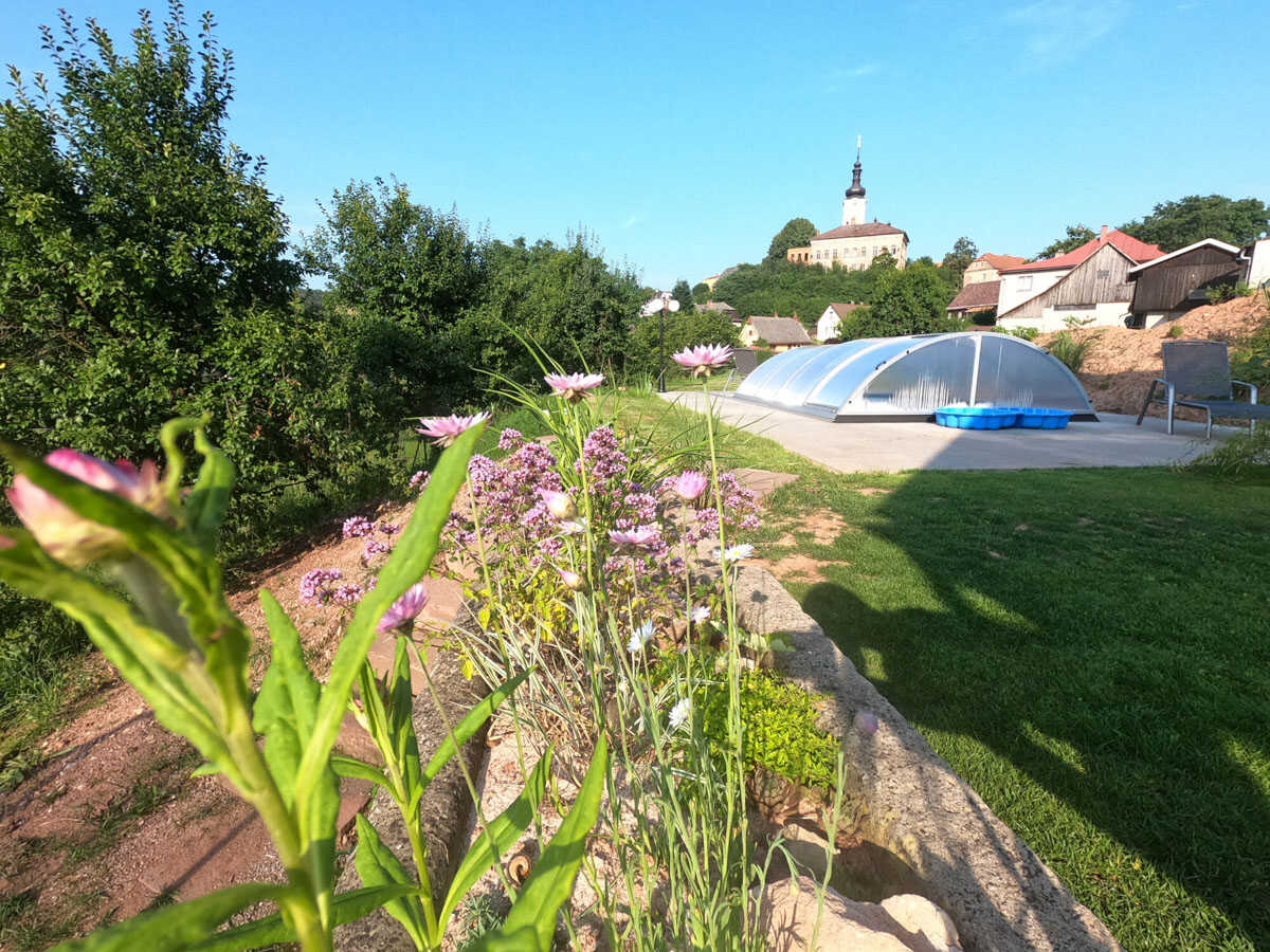 K penzionu náleží rozlehlá zahrada, která je celá oplocená, a nabízí bazén, koupací sud, gril, ohniště, pergolu a dětské hřiště. V letních měsících zde najdete klidné zázemí pro odpočinek, koupání i večerní posezení.