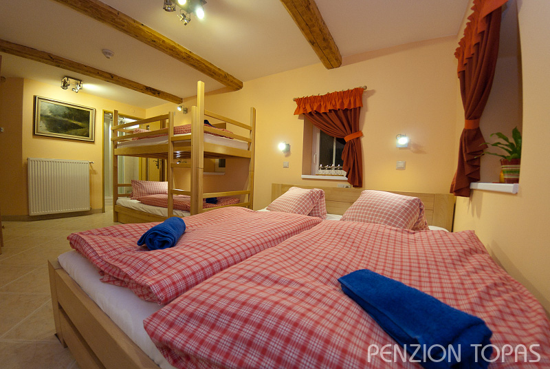 V interiéru penzionu dominuje dřevo, také proto je celý objekt nekuřácký. Ubytování se nabízí ve dvou až šestilůžkových útulných pokojích s vlastním sociálním zařízením (sprcha, wc), Tv a WiFi připojením k internetu. Příjemná restaurace je určena pouze pro ubytované hosty, čímž je zajištěn klid a pohodlí po celou dobu Vaší dovolené. Během špatného počasí nebo dlouhých večerů si můžete zahrát stolní fotbálek nebo využít saunu. K penzionu náleží také letní terasa s krásným výhledem do údolí a možností grilování. Nedaleko objektu je možné si pronajmout tenisový kurt, zajít na bowling, kulečník nebo novou bobovou dráhu. Penzion Topas má ideální polohu přímo na uměle zasněžované sjezdovce Portášky se sedačkovou lanovkou a večerním lyžováním. Naprostý luxus, stačí nasadit lyže a jste na sjezdovce. Pokud si budete chtít během dne odpočinout a dát si něco dobrého, určitě Vás potěší Skibar, který k penzionu náleží. Pro děti je připravena lyžařská škola. V letních měsících je Velká Úpa a její okolí vhodná pro cyklisty a turisty. Kromě výšlapu na naši nejvyšší horu Sněžku, můžete vyrazit na mléčnou farmu Sosna nebo golf v nedalekých Mladých Bukách.