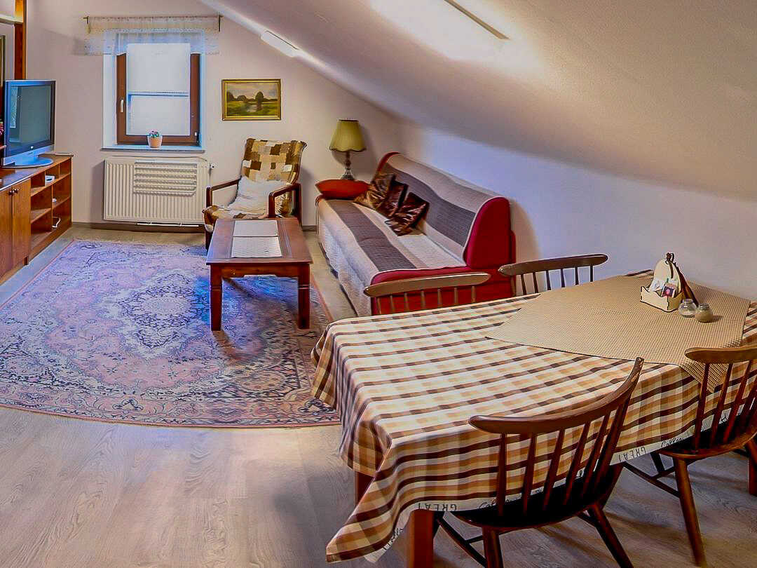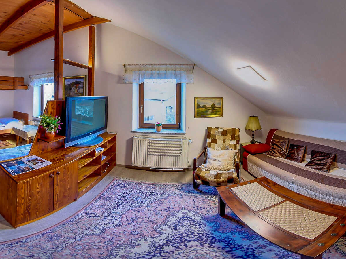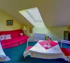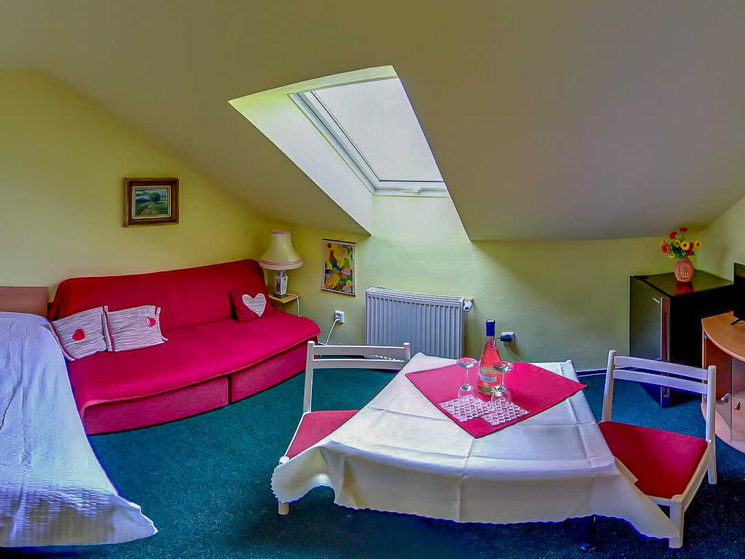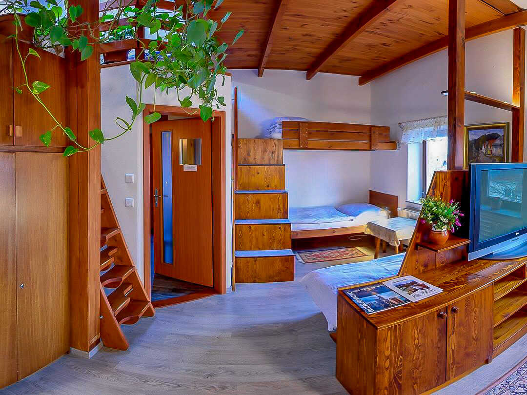 V podkroví je apartmán pro 3-10 osob. Velký prostor zahrnuje část na spaní, obývací část, plnohodnotnou kuchyni, koupelnu a dětskou hernu s možností přespání.