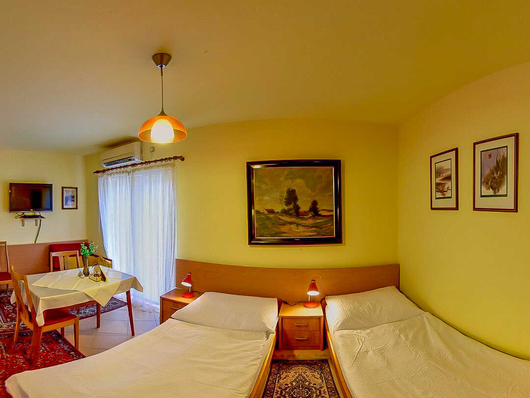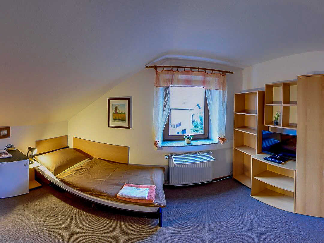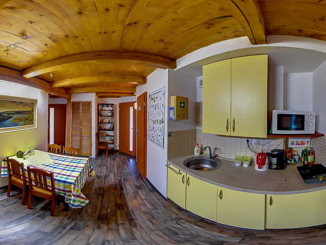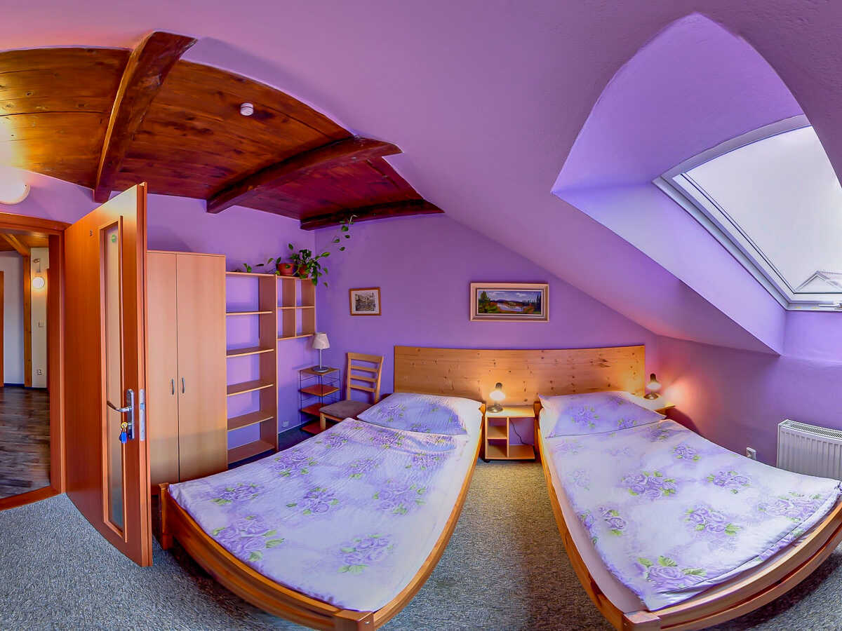 Pokoje jsou umístěny v podkroví a mají sdílenou koupelnu a kuchyň. Na výběr je jednolůžkový pokoj pro 1-3 osoby s jedním samostatným lůžkem a dvěma rozkládacími křesly využitelnými jako přistýlka, dvoulůžkový pokoj s oddělenými postelemi, nebo dvoulůžkový pokoj s manželskou postelí a dvěma přistýlkami na rozkládacích křeslech. Na každém pokoji je lednička, TV a dostupný WIFI internet. Ve sdílené koupelně je wc, umyvadlo a sprcha. Ve sdílené kuchyni je mikrovlnná trouba, sklokeramická deska, rychlovarná konvice, kávovar, kuchyňské nádobí a náčiní a také jídelní kout s jídelním stolem a židlemi.