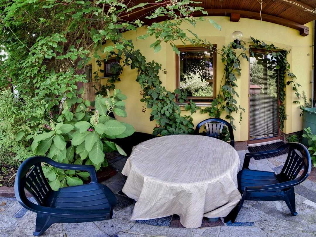 V přízemí je dvoulůžkový apartmán pro 2-3 osoby (2x samostatné lůžko, 1x rozkládací křeslo), který má přímý vstup na zahradu a vlastní terasu s posezením. V koupelně je kromě wc a umyvadla i vana.