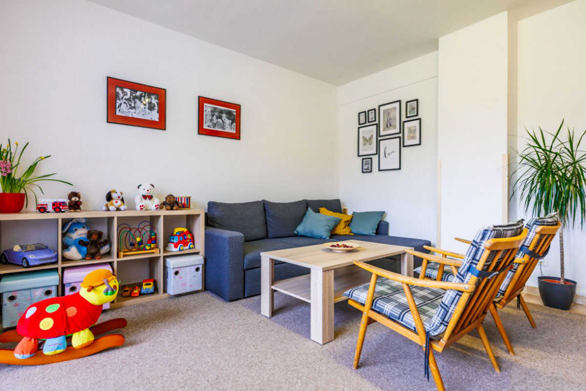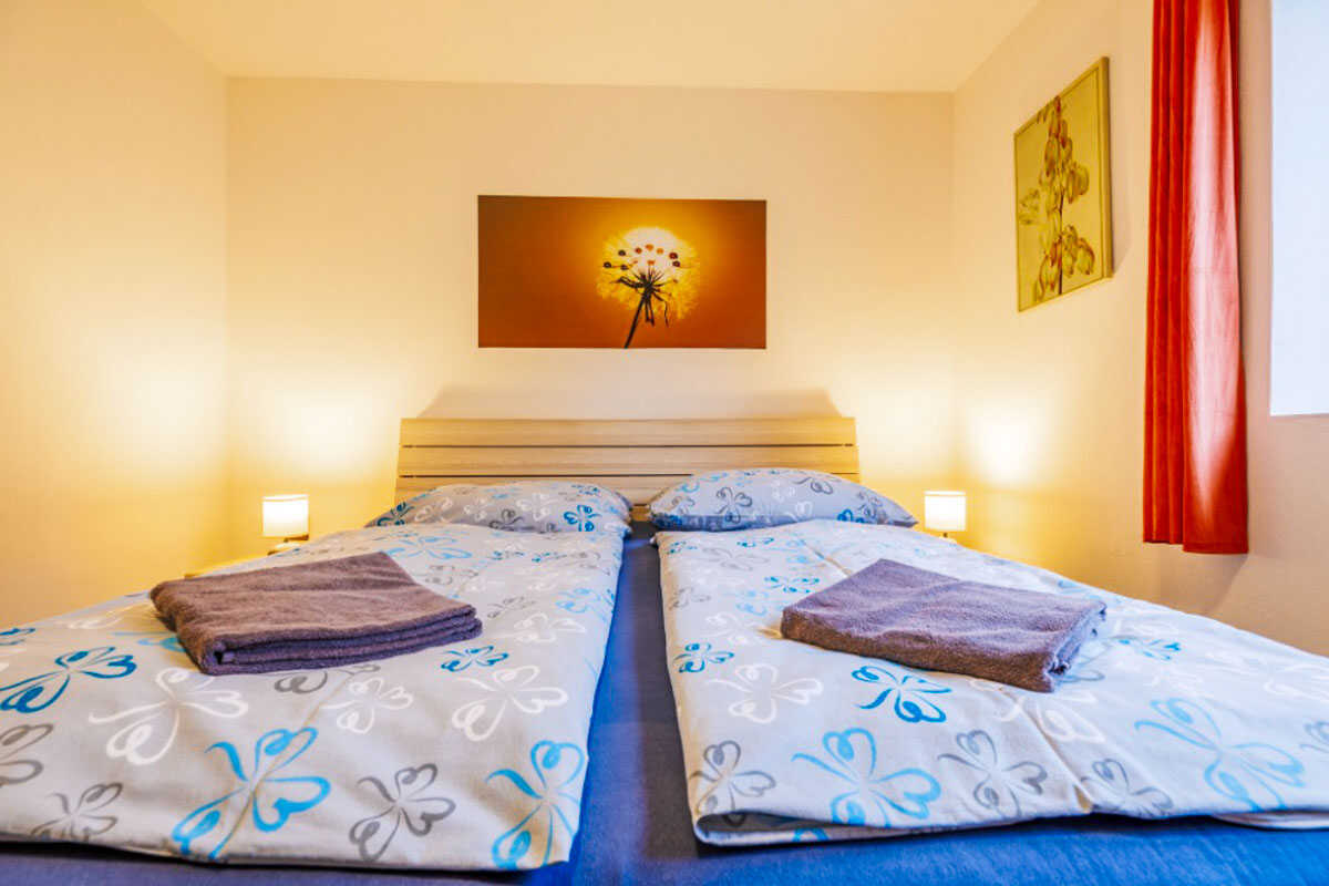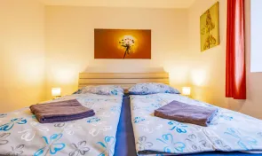 Apartmán č. 2 tvoří dva pokoje pro 4 osoby – jeden s manželskou postelí a kuchyňským koutem, druhý se dvěma samostatnými lůžky, křesly a TV.