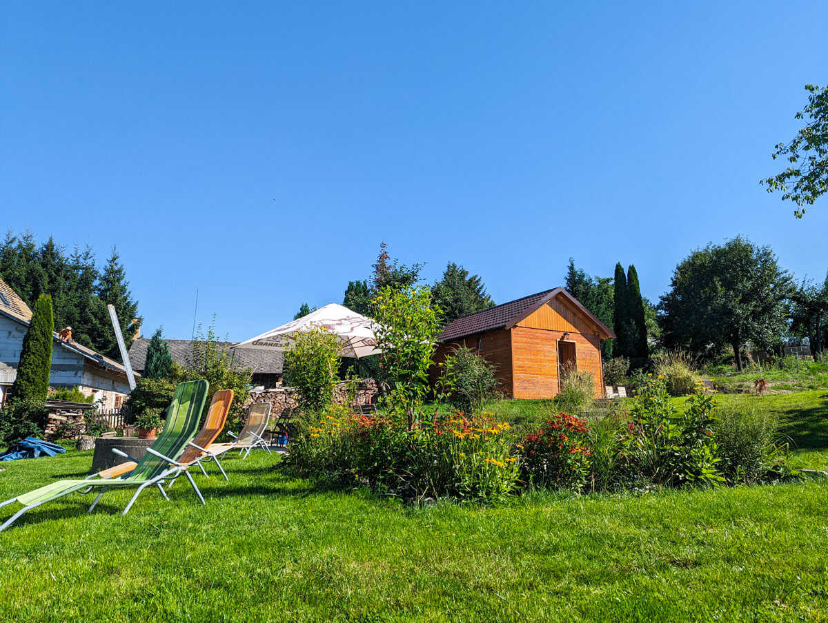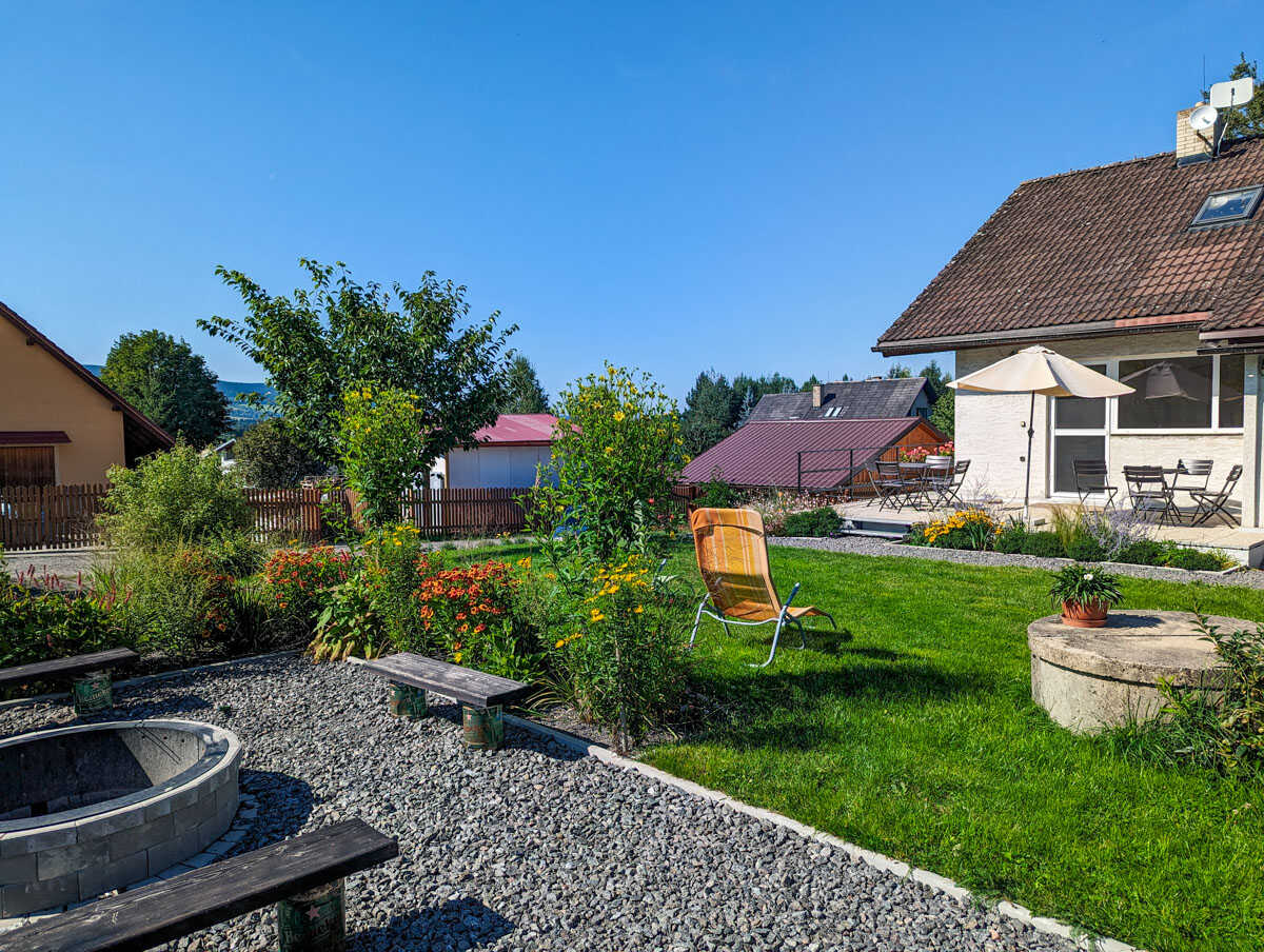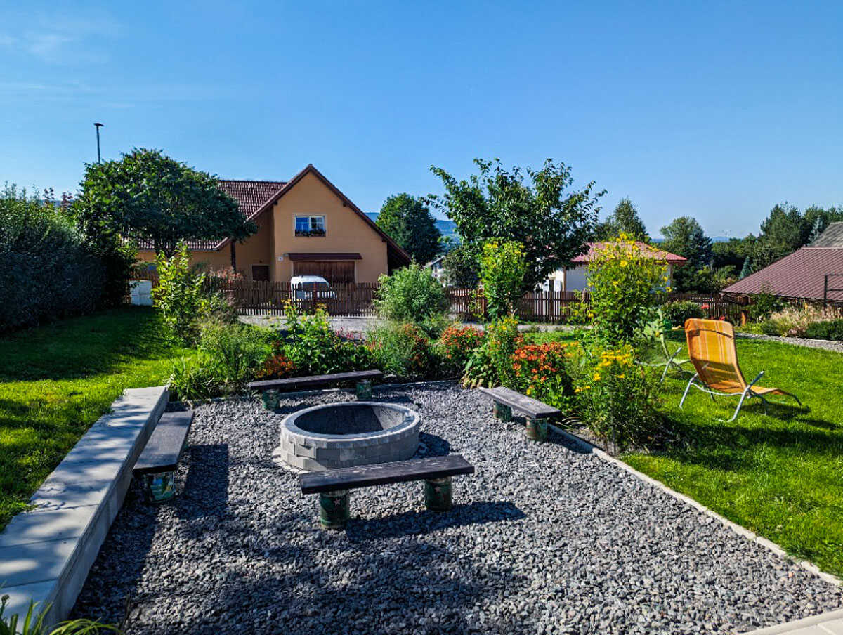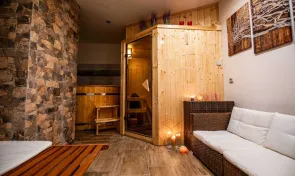 Hosté mohou odpočívat na zahradě s posezením, využít venkovní bazén (5,5 × 1,2 m), nebo si užít klidný večer u krbu v baru v suterénu. Pro dokonalý relax nechybí finská sauna, ideální po dni stráveném na sjezdovce či výletě. Děti potěší pískoviště, trampolína, houpačky i rozlehlý travnatý pozemek.