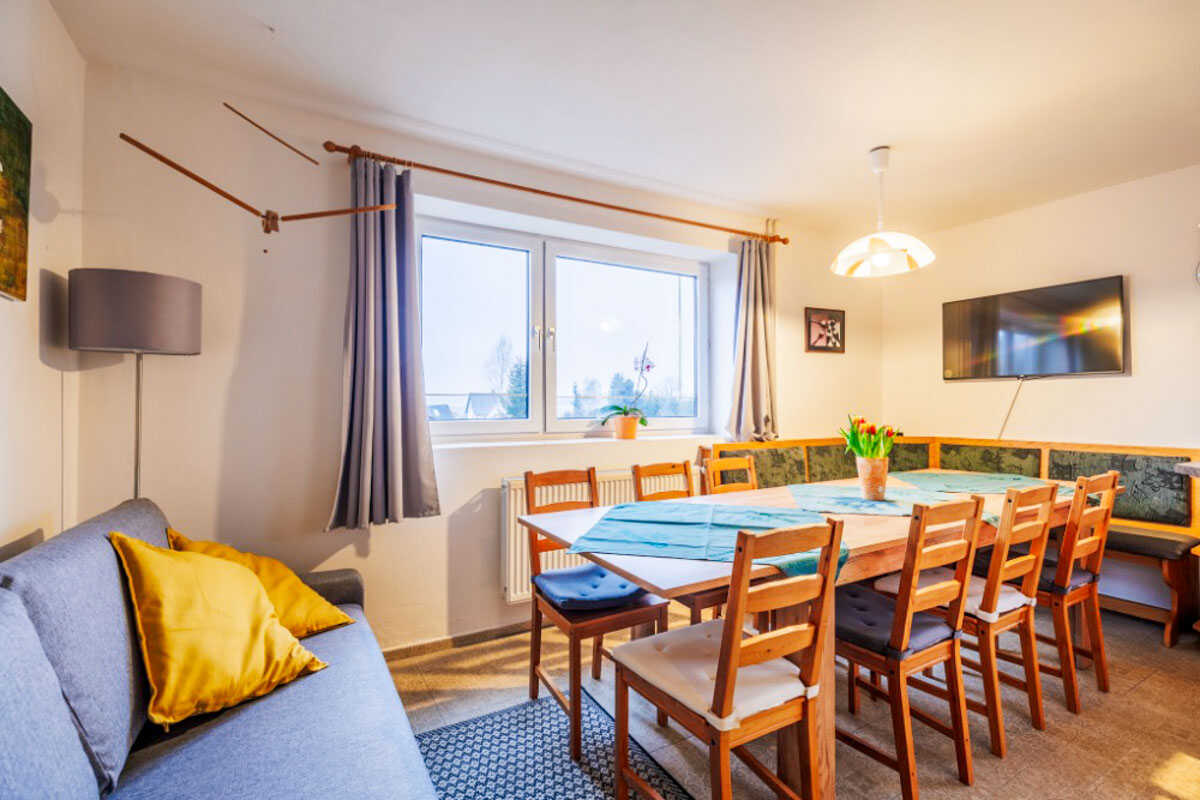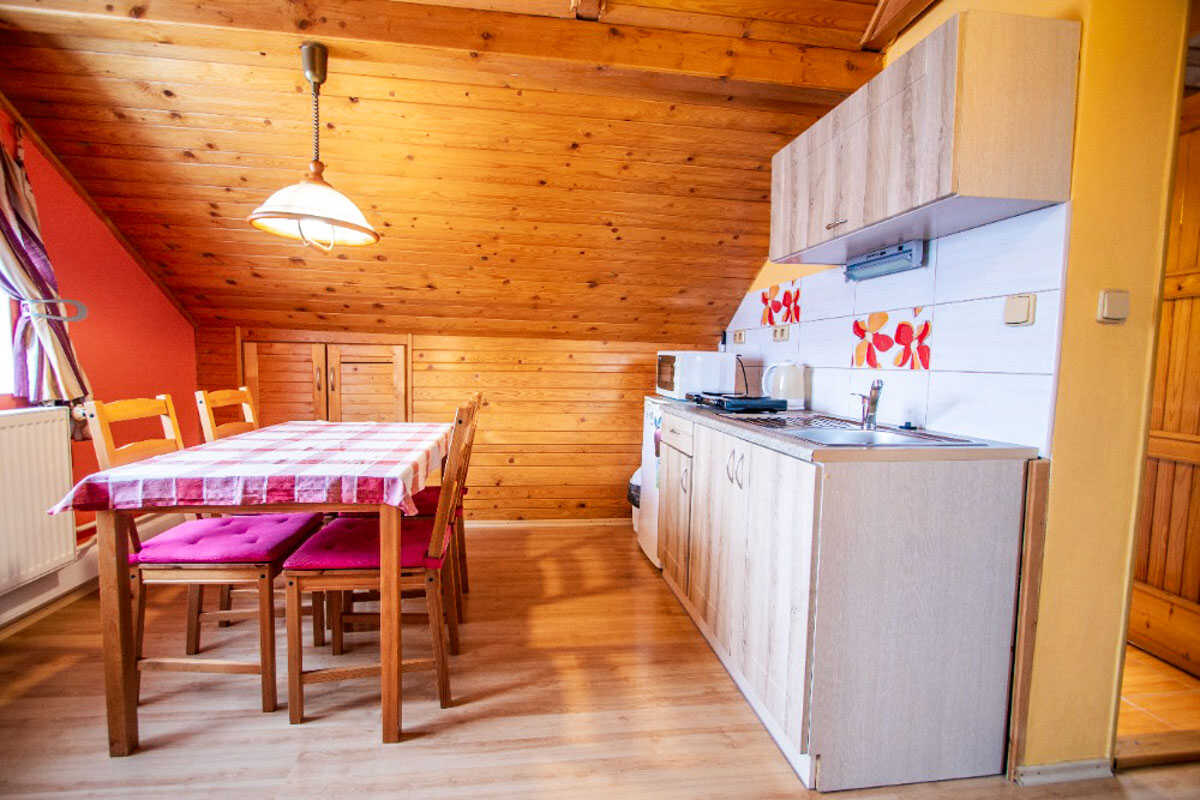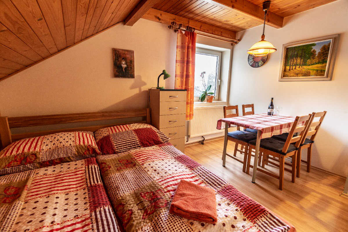 Apartmán č. 1 je útulný jednopokojový prostor pro 4 osoby s kuchyňským a jídelním koutem a koupelnou.