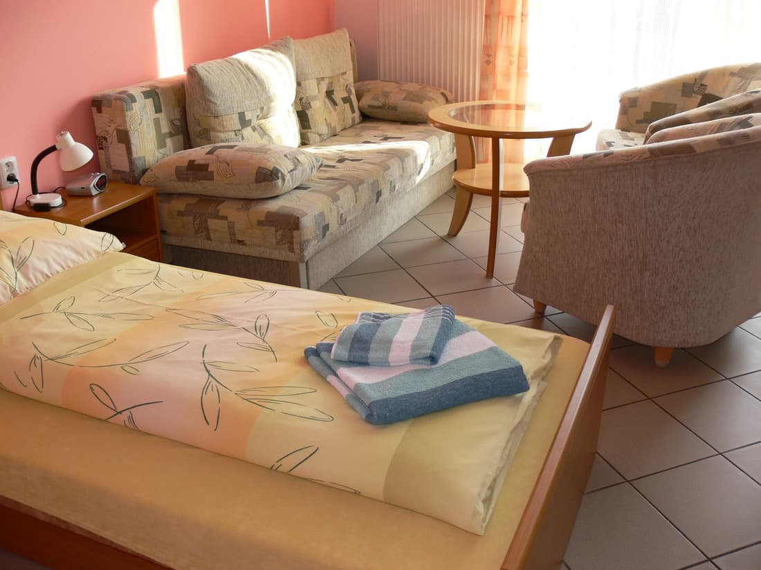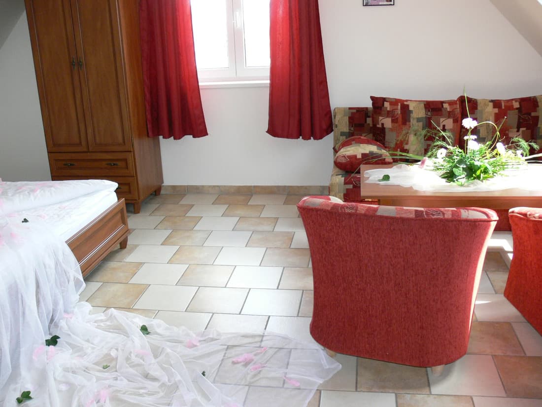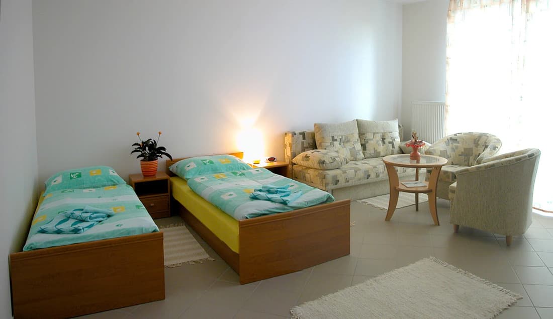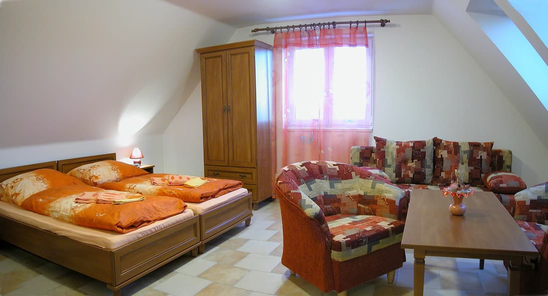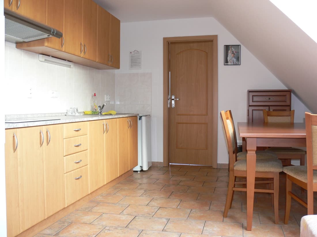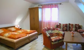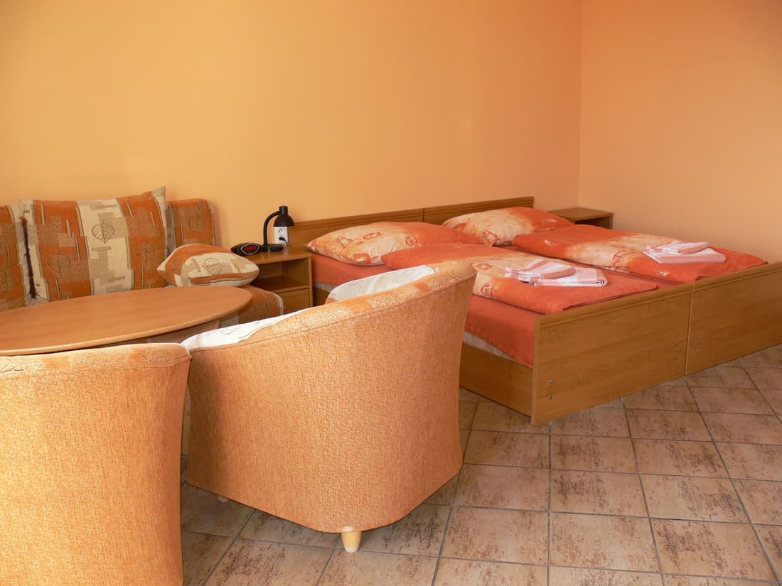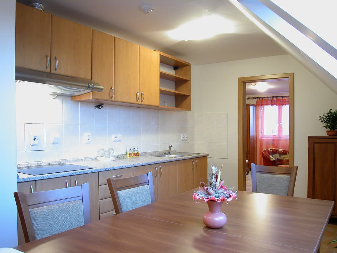 Pro hosty, kteří preferují více prostoru a možnost vlastního vaření, je k dispozici apartmán s kapacitou až 6 osob. Ten nabízí ložnici s manželskou postelí, možnost přistýlek a plně vybavenou samostatnou kuchyň s jídelní částí. Nechybí vlastní sociální zařízení, TV ani WiFi připojení, takže si můžete užít maximální pohodlí i soukromí.