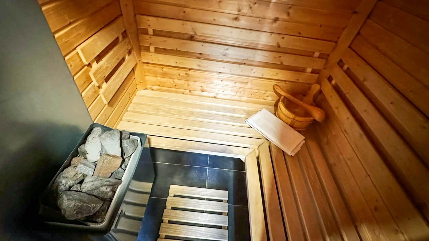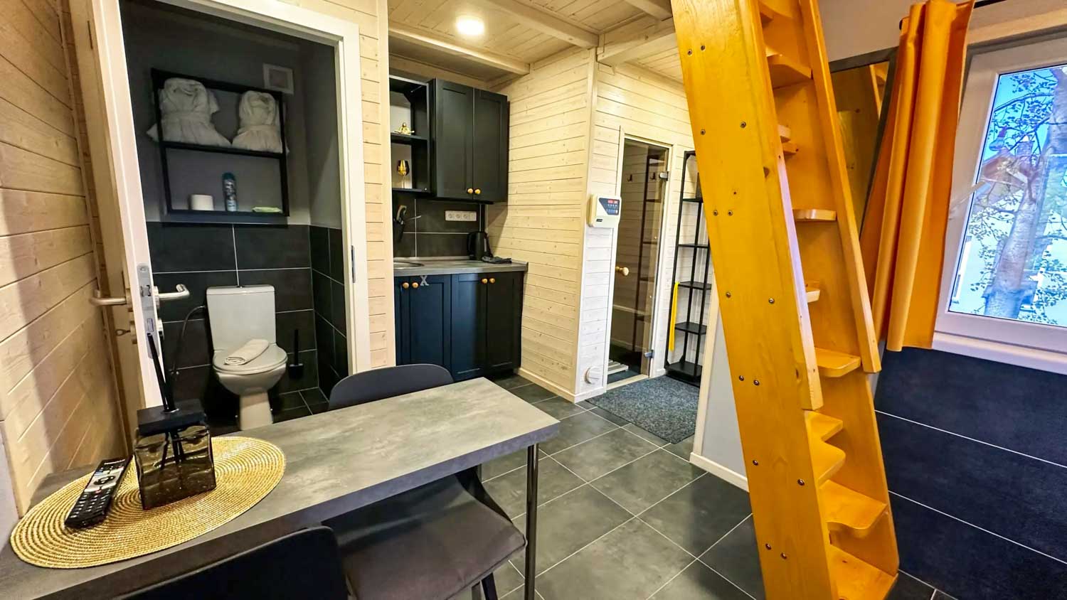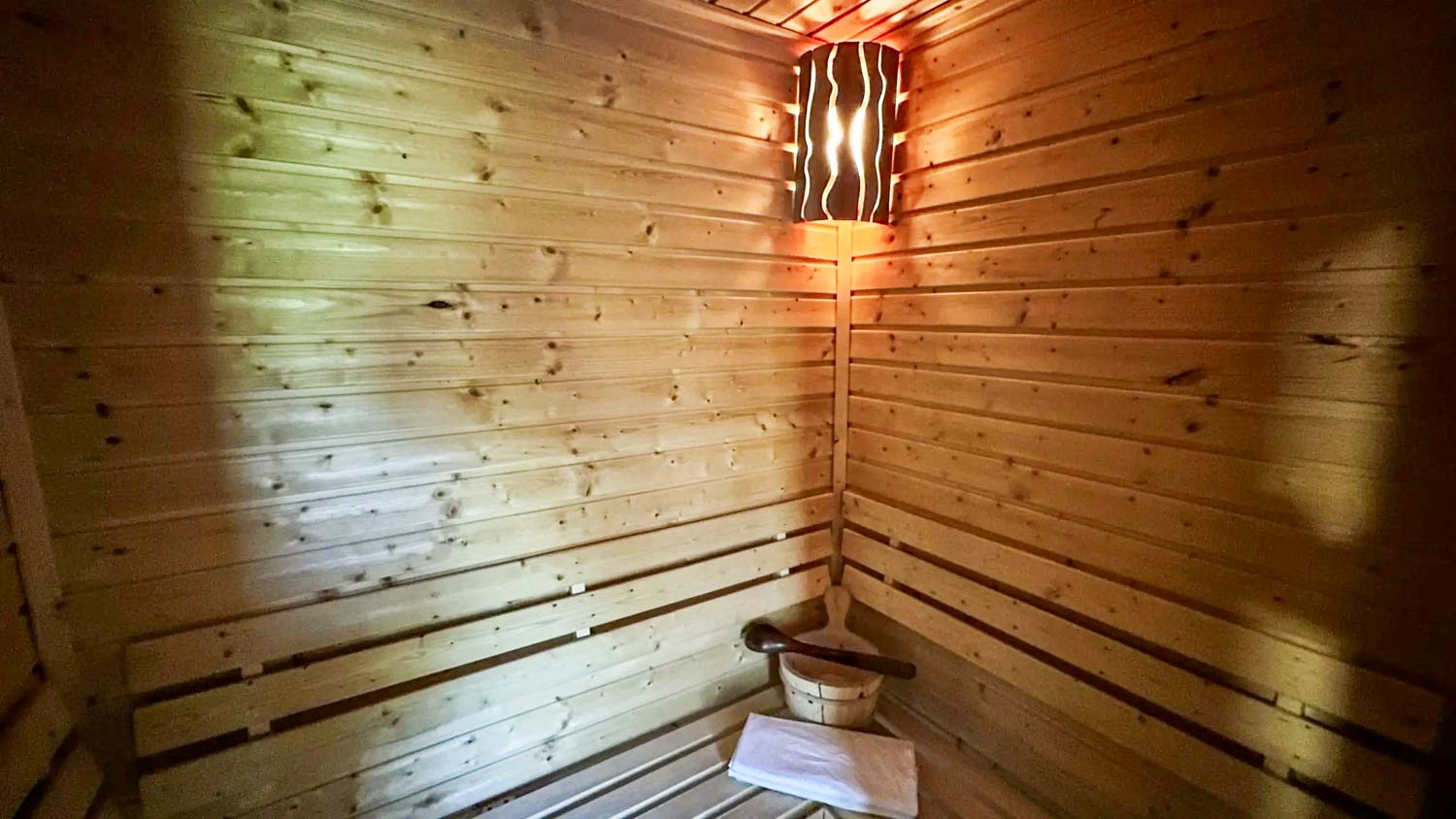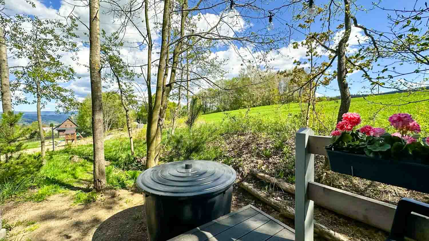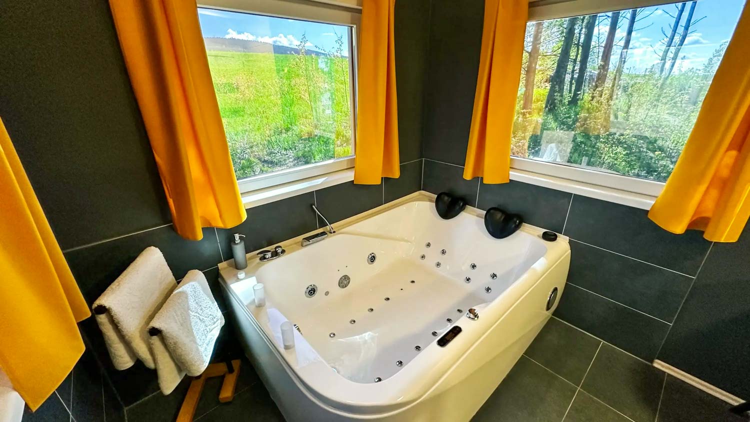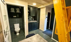 Hlavní roli zde hraje wellness vybavení, které je součástí každého domečku. Hosté mají k dispozici finskou saunu pro důkladné prohřátí těla a vířivou vanu s vytahovací sprchou. Nechybí ani kompletní textilní vybavení včetně ručníků, prostěradel a županů, stejně jako hygienické zázemí se sprchovým gelem a fénem. Prostor je navržen tak, aby podporoval klidnou atmosféru a ničím nerušený odpočinek.