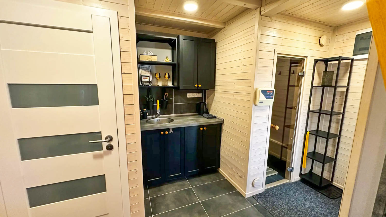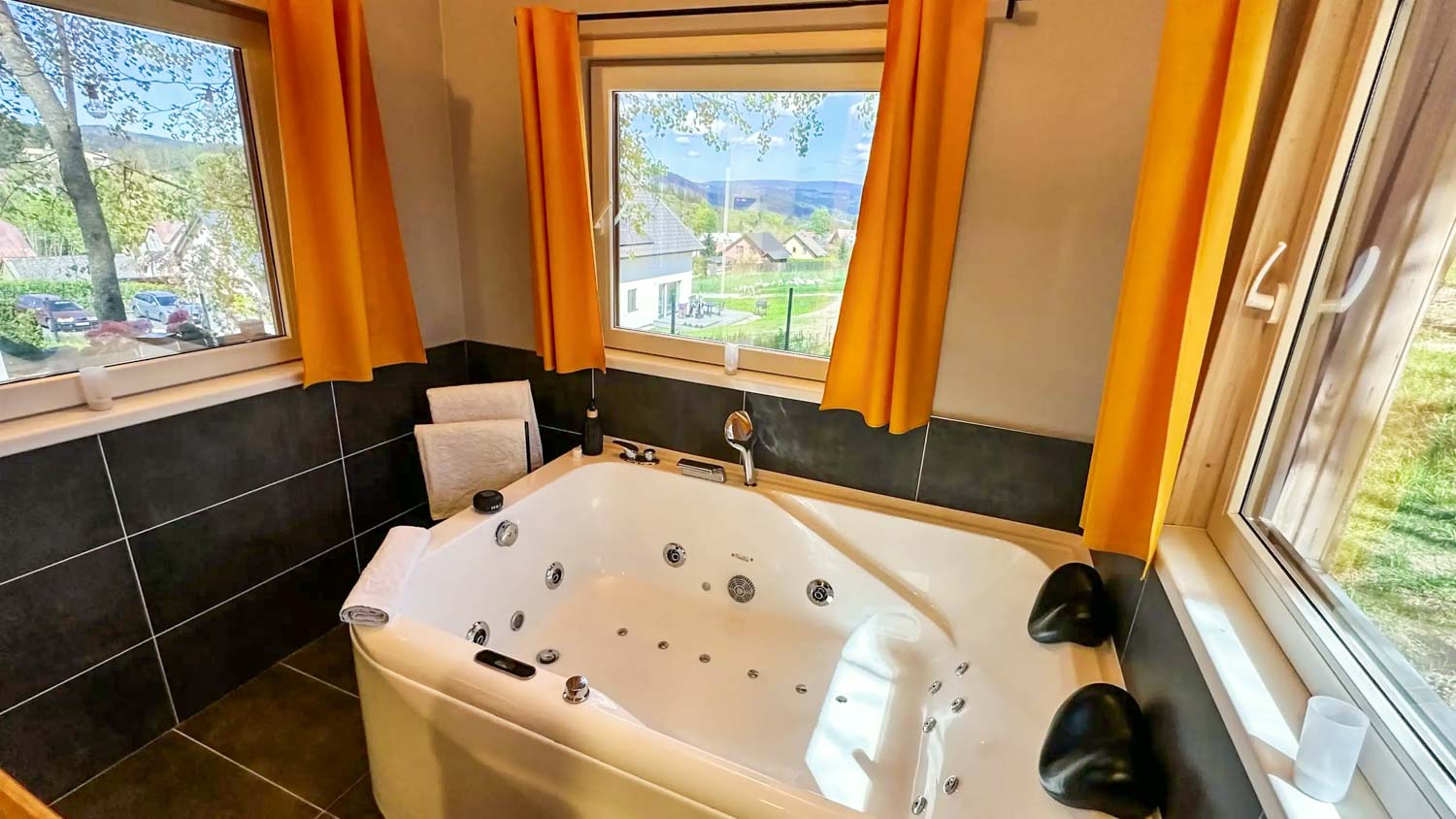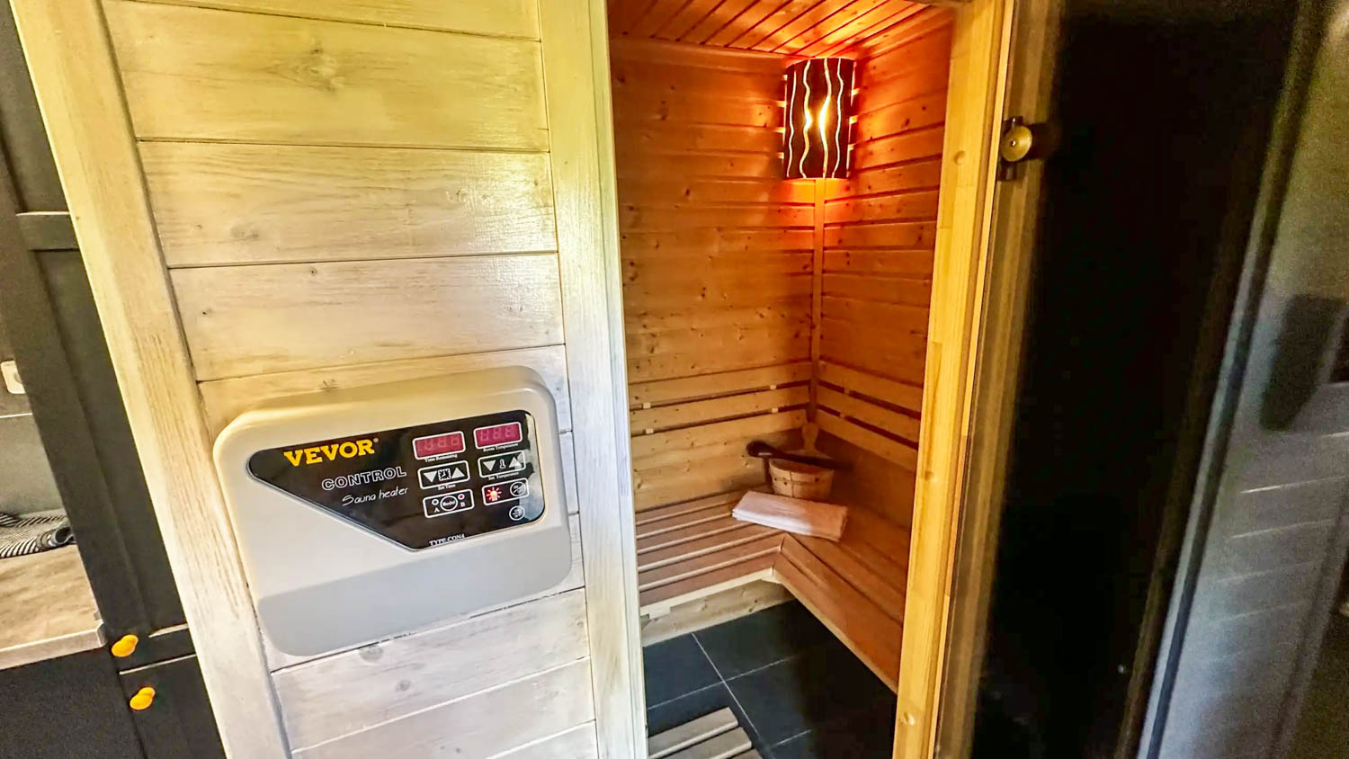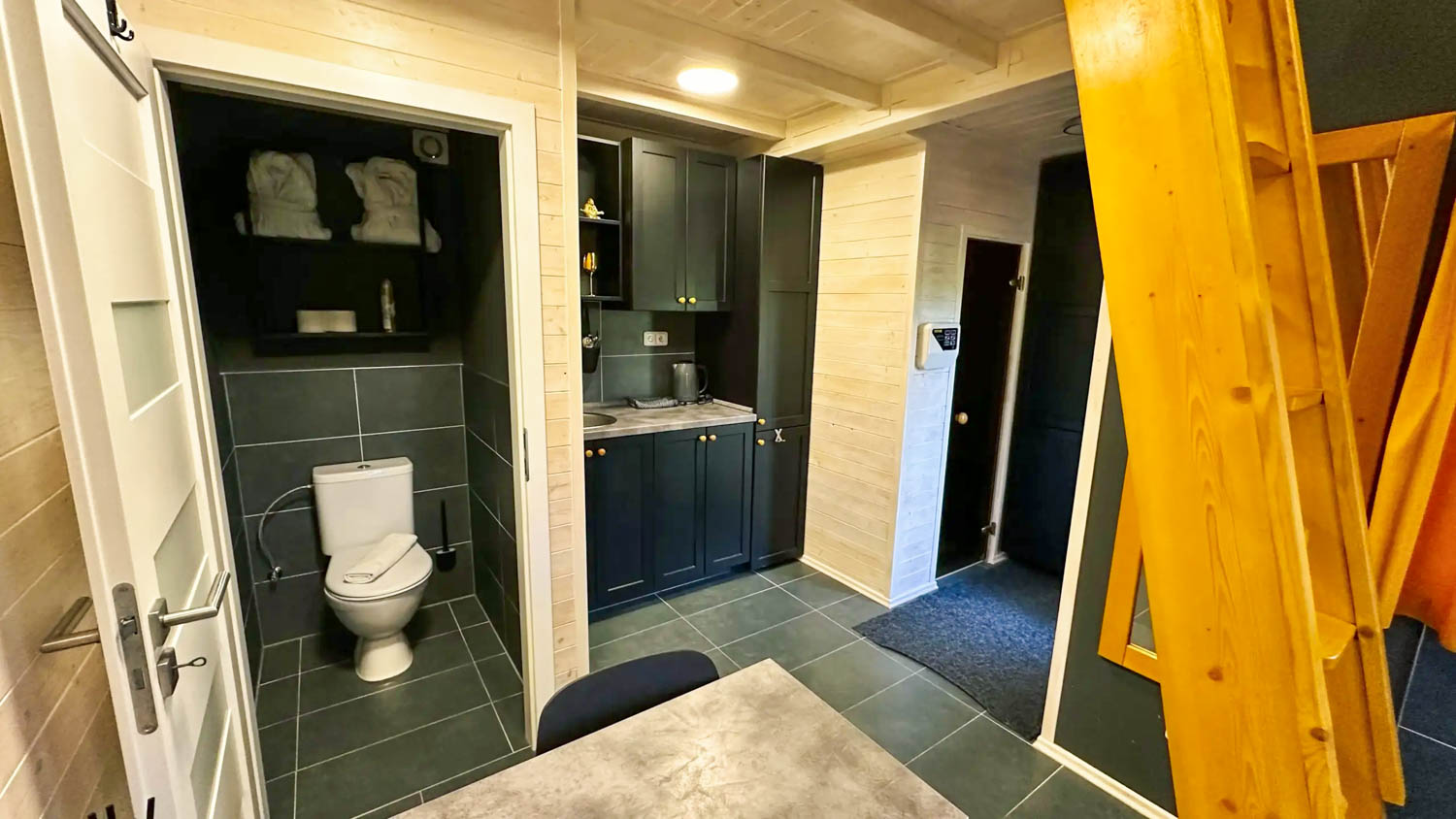 Hlavní roli zde hraje wellness vybavení, které je součástí každého domečku. Hosté mají k dispozici finskou saunu pro důkladné prohřátí těla a vířivou vanu s vytahovací sprchou. Nechybí ani kompletní textilní vybavení včetně ručníků, prostěradel a županů, stejně jako hygienické zázemí se sprchovým gelem a fénem. Prostor je navržen tak, aby podporoval klidnou atmosféru a ničím nerušený odpočinek.
