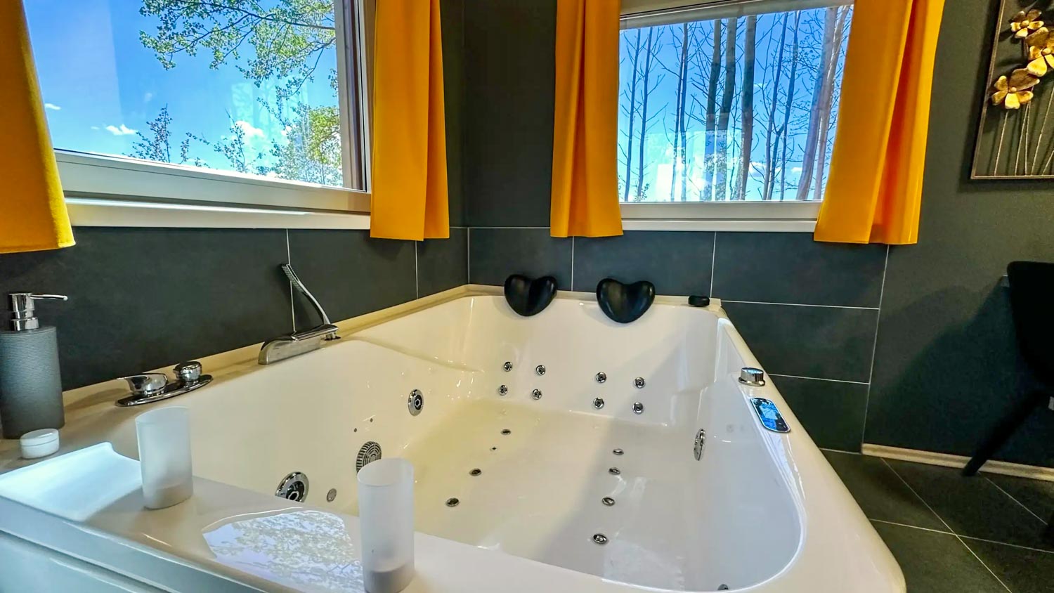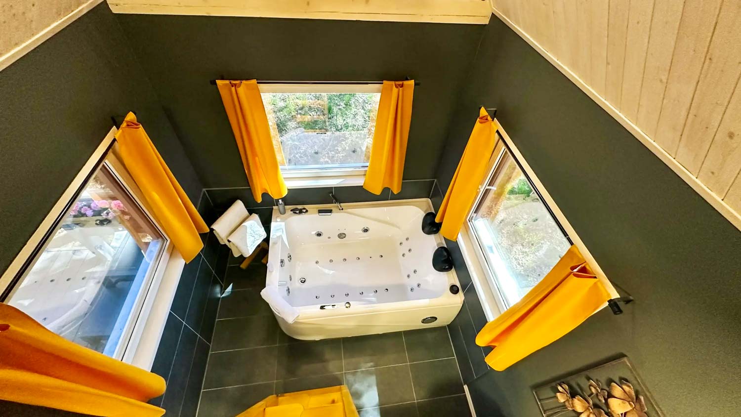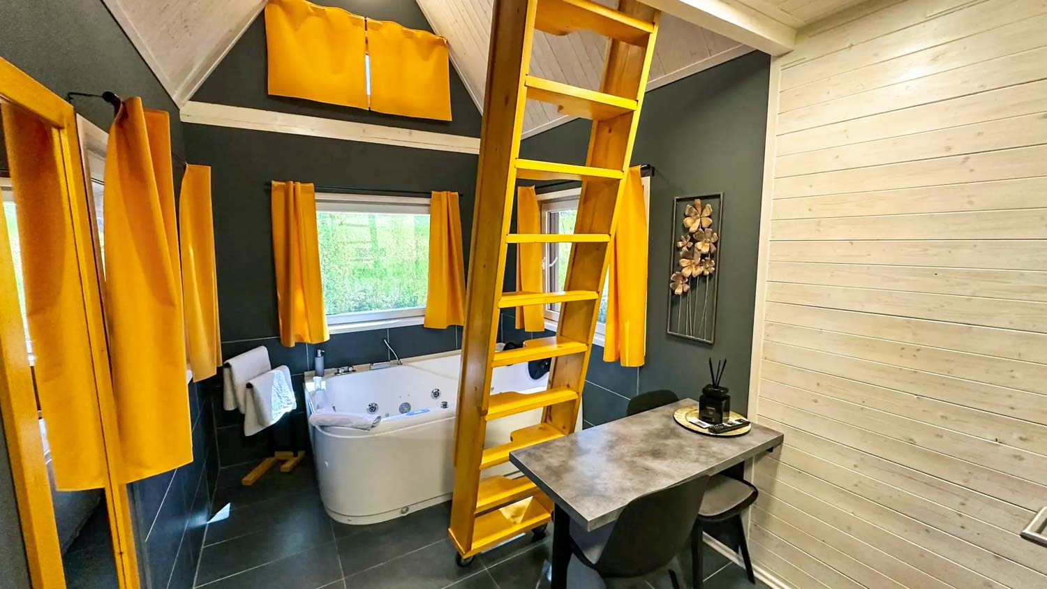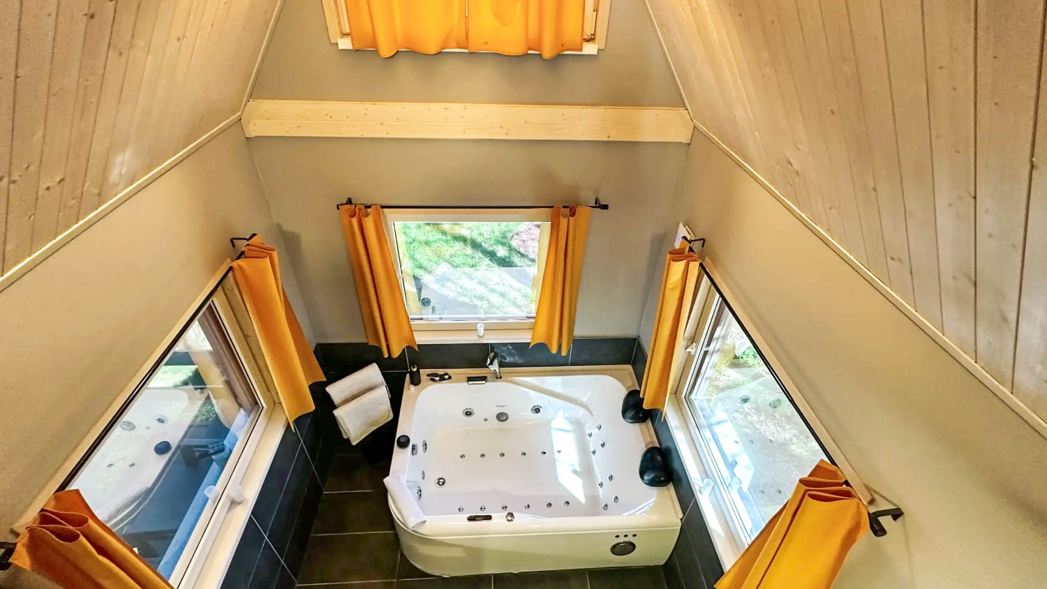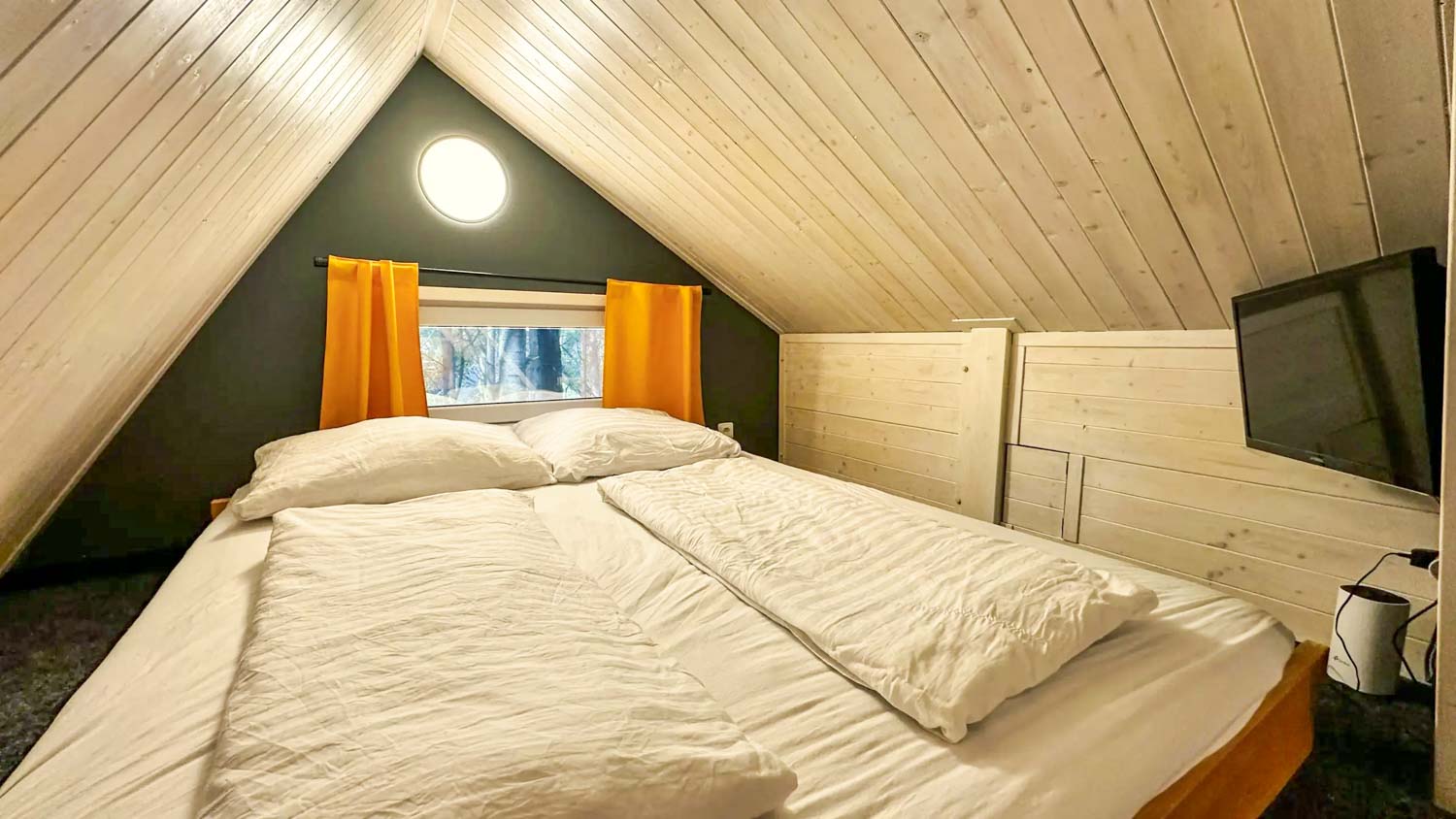 Hlavní roli zde hraje wellness vybavení, které je součástí každého domečku. Hosté mají k dispozici finskou saunu pro důkladné prohřátí těla a vířivou vanu s vytahovací sprchou. Nechybí ani kompletní textilní vybavení včetně ručníků, prostěradel a županů, stejně jako hygienické zázemí se sprchovým gelem a fénem. Prostor je navržen tak, aby podporoval klidnou atmosféru a ničím nerušený odpočinek.