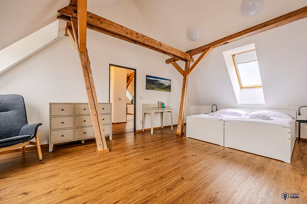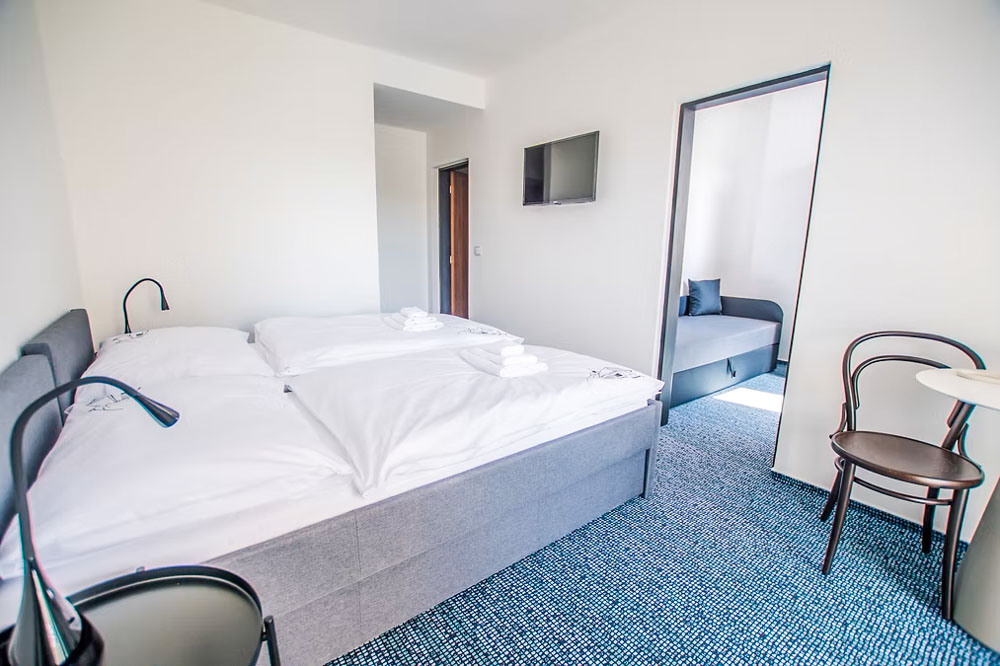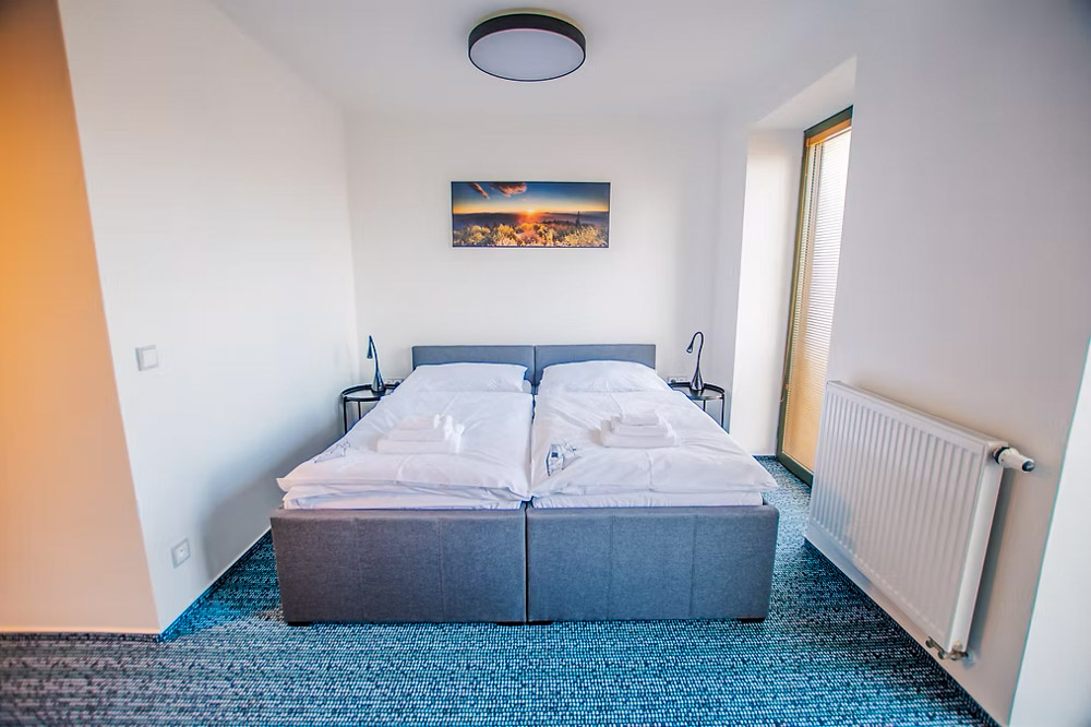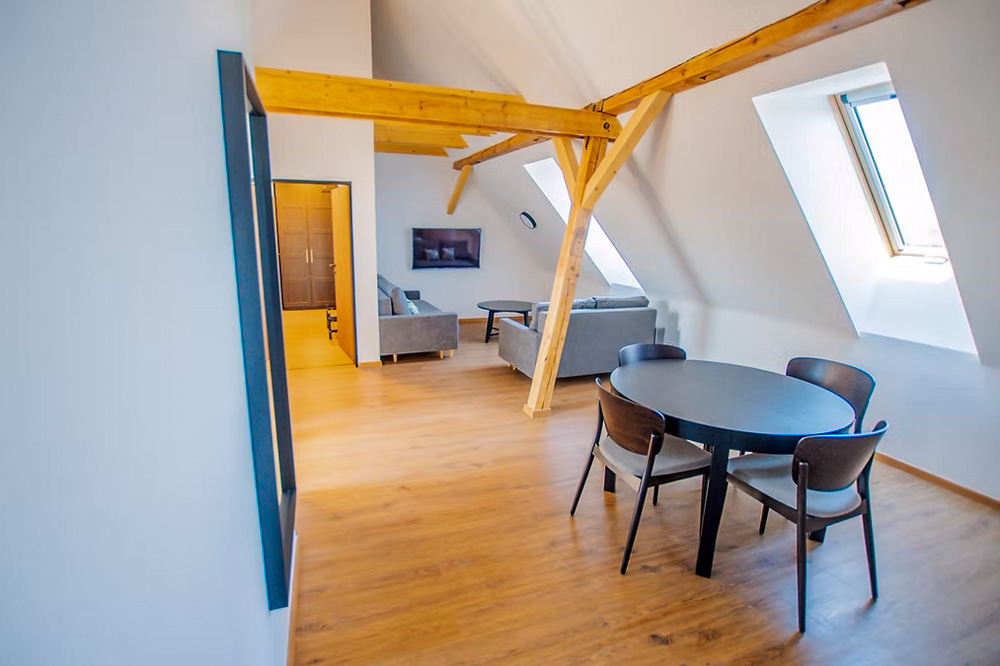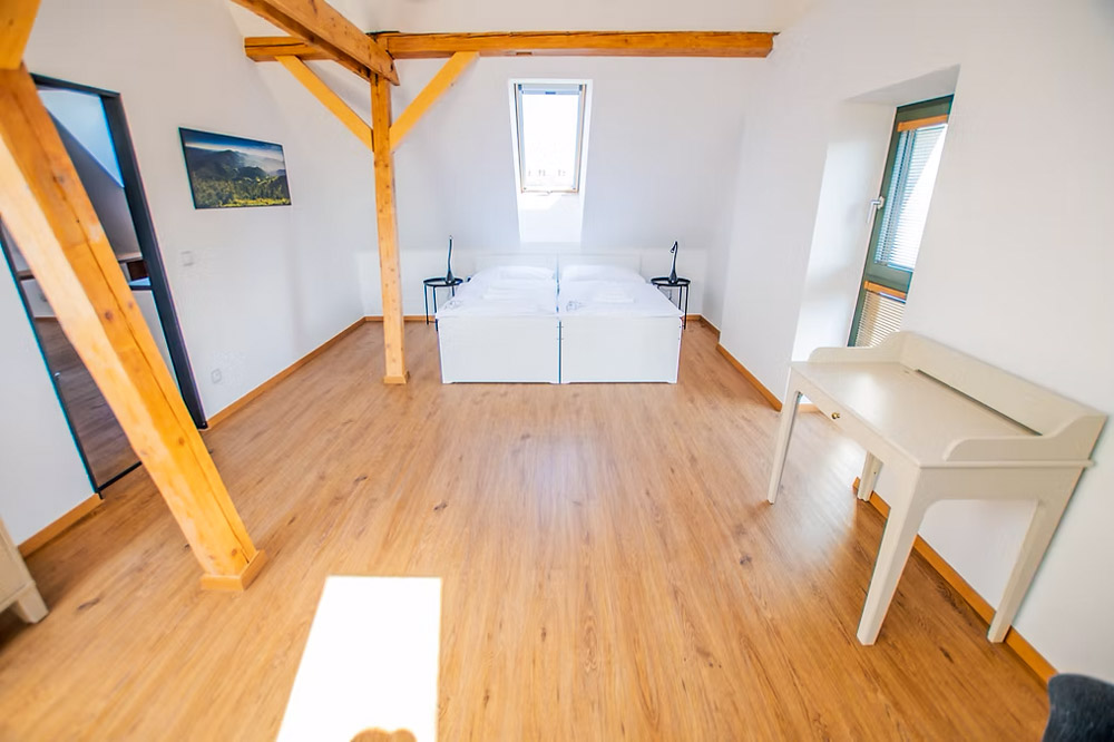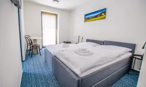 Hosté mají na výběr dva jednolůžkové pokoje, ideální pro klidný pobyt jednotlivce, čtyři dvoulůžkové pokoje poskytující pohodlné zázemí pro páry a jeden čtyřlůžkový pokoj se dvěma samostatnými ložnicemi, který je vhodný pro rodiny nebo menší skupiny přátel. Nejluxusnější částí ubytování je prostorný apartmán, jenž disponuje dvěma ložnicemi – v jedné se nachází manželská postel, ve druhé samostatné lůžko – a dále velkorysým obývacím pokojem. Ten je vybaven televizorem, sedacími soupravami, křeslem a jídelním koutem a navazuje na plně vybavenou kuchyni, která umožňuje pohodlné vlastní stravování i při delších pobytech.