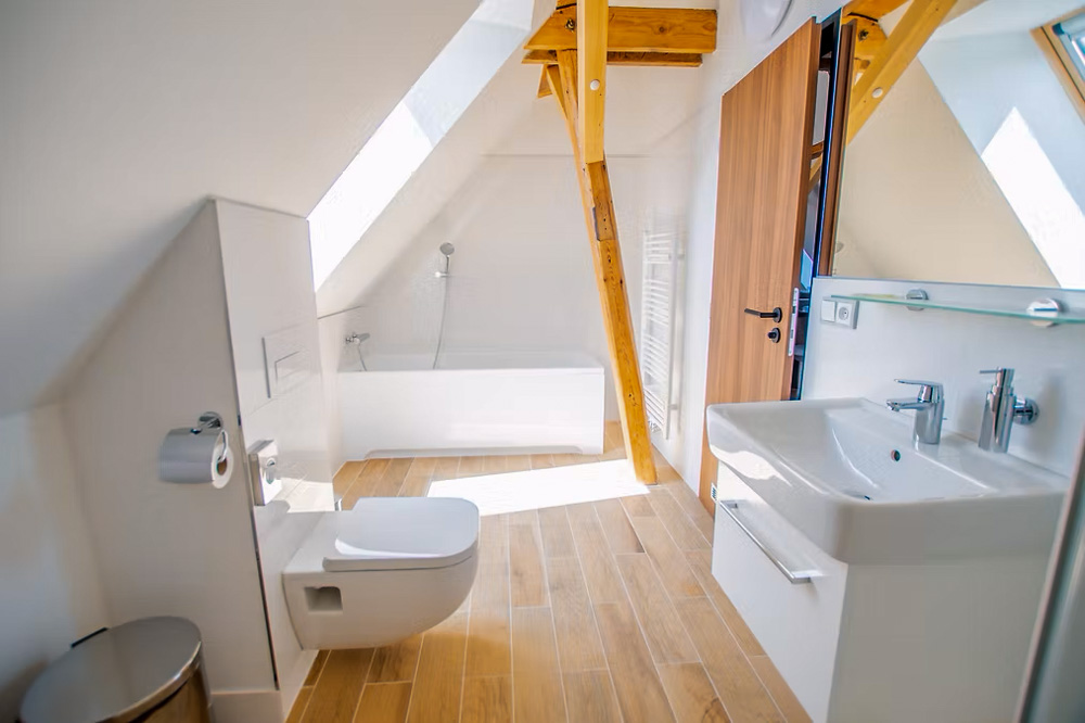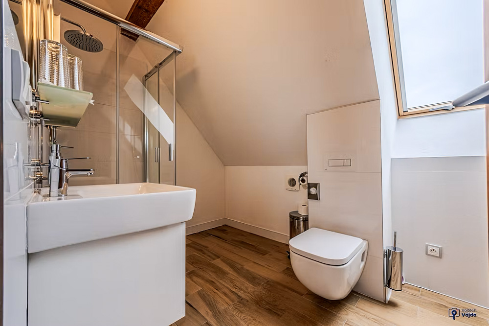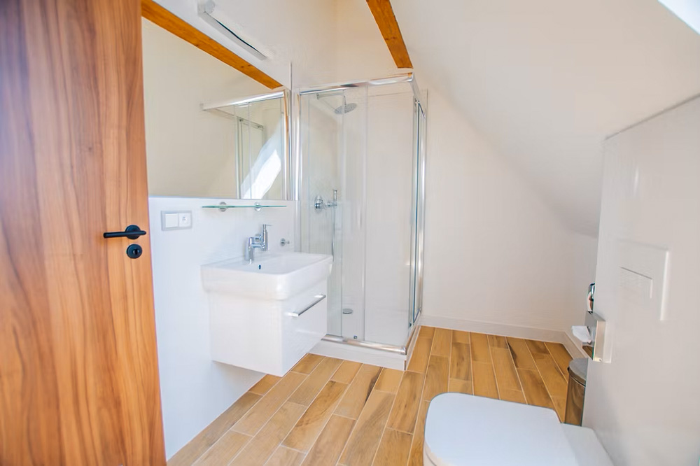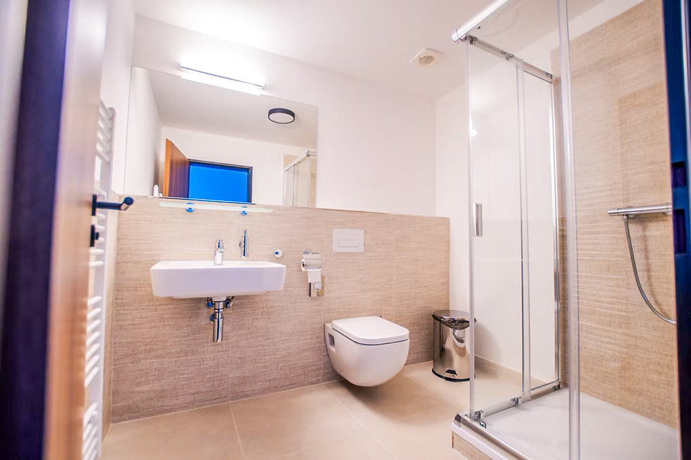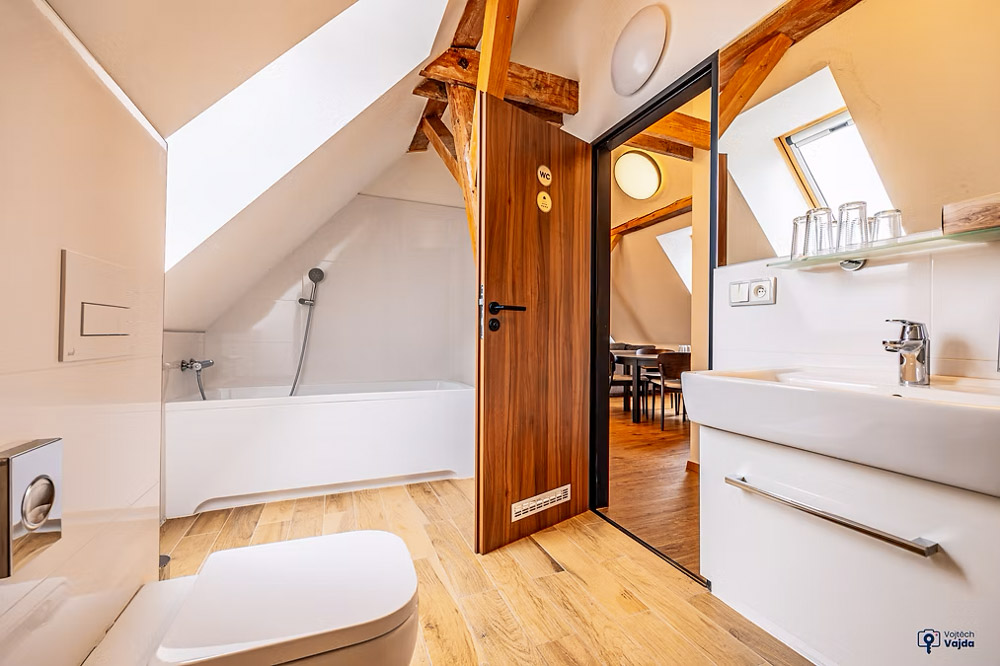 Všechny pokoje i apartmán mají vlastní koupelnu se sprchovým koutem, toaletou, umyvadlem a zrcadlem, přičemž apartmán je navíc vybaven relaxační vanou. Samozřejmostí každé ubytovací jednotky je dostatek úložného prostoru, televizor, pracovní stůl a posezení, což ocení jak rekreační, tak pracovně cestující hosté.