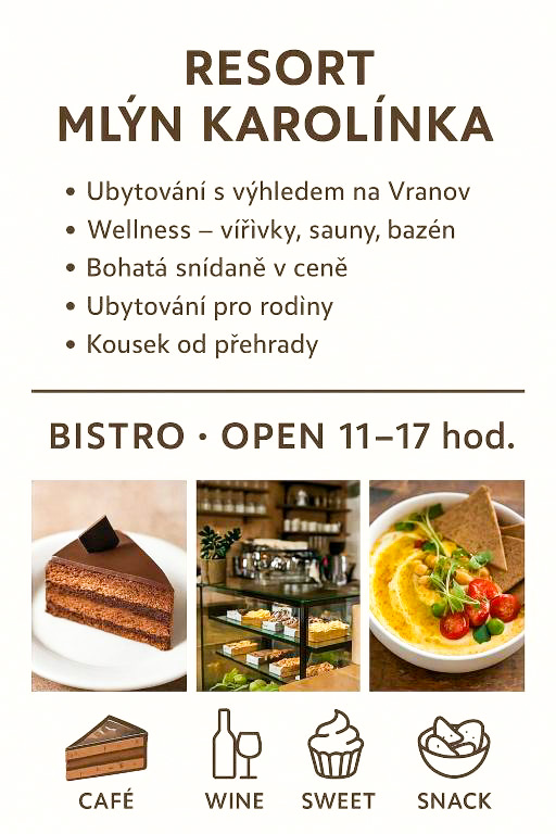 Okolí Resortu Mlýn Karolinka ve Vranově nad Dyjí nabízí bohatou směsici historie, technických památek a přírodních krás. Dominantou, kterou můžete obdivovat přímo z oken resortu, je majestátní státní zámek Vranov nad Dyjí, tyčící se na skalním ostrohu nad řekou. Jen kousek od ubytování se nachází monumentální Vranovská přehrada. Pro milovníky přírody a turistiky je ideálním cílem Národní park Podyjí s hustou sítí stezek vedoucích k vyhlídkám na meandry řeky Dyje, nebo nedaleká zřícenina hradu Cornštejn a historický hrad Bítov.