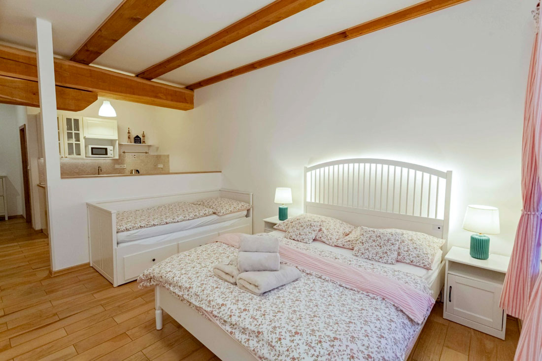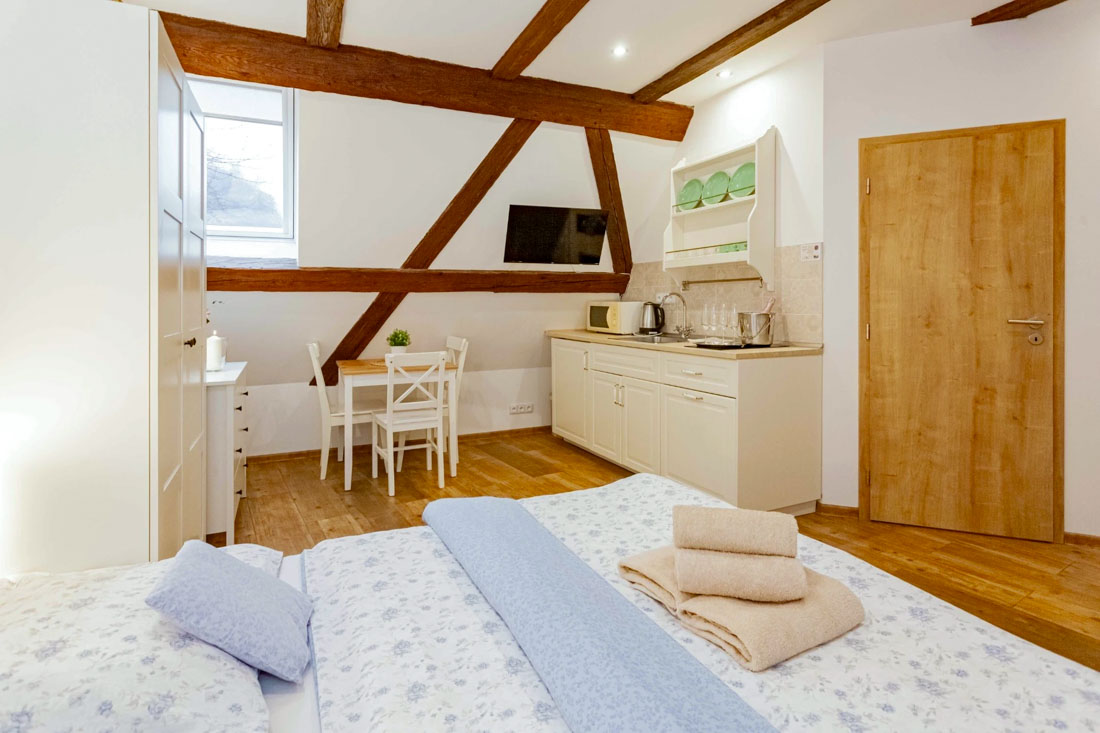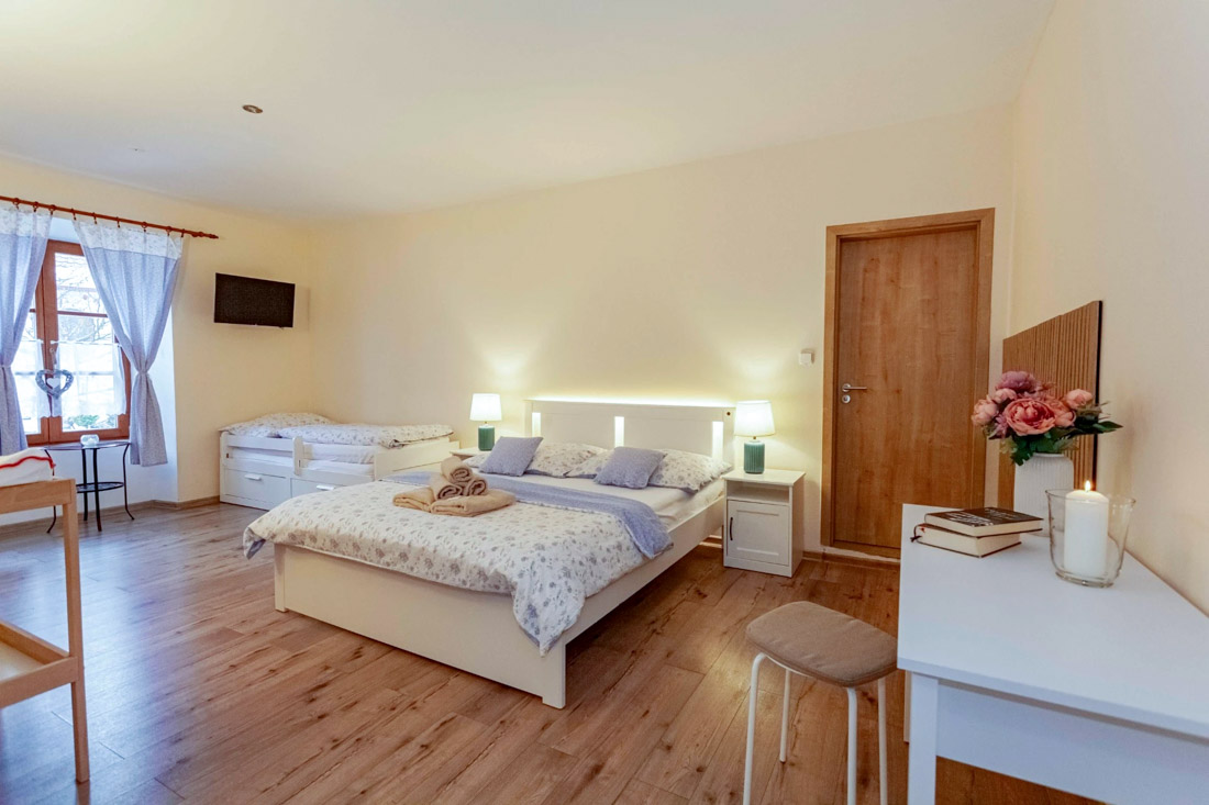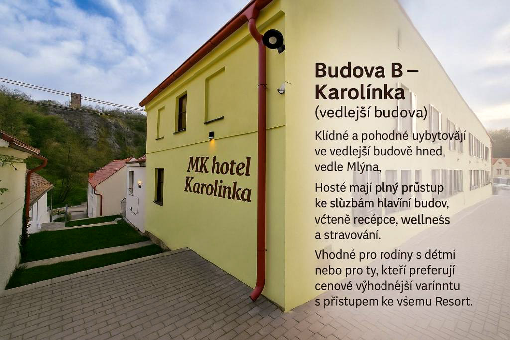 Resort Mlýn Karolínka se nachází v krásné přírodě Vranova nad Dyjí, v historicky a krajinářsky zajímavém regionu u meandru řeky Dyje. Ubytování je situováno ve dvou propojených budovách – v historickém Mlýně A a přilehlé budově B – Karolínka – a nabízí komfortní pokoje i prostorné apartmány s plně vybaveným sociálním zázemím, vlastní koupelnou a často i kuchyňkou s elektrickou varnou deskou, mikrovlnnou troubou, lednicí a rychlovarnou konvicí. Hosté si mohou vybrat pohodlné rodinné pokoje nebo větší apartmány s výhledem na okolní krajinu či zámek.