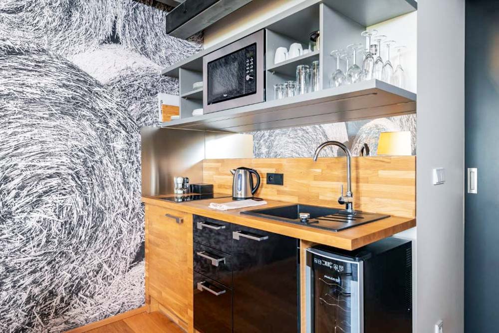 Všechny suite a apartmány jsou koncipovány s důrazem na soběstačnost a moderní komfort. Standardem je klimatizace, vysokorychlostní Wi-Fi a kávovar Nespresso. Kuchyňské kouty jsou vybaveny indukční varnou deskou, lednicí, mikrovlnnou troubou, rychlovarnou konvicí a základním nádobím. Přestože resort není plně bezbariérový, většina koupelen je řešena v bezbariérovém provedení, což zvyšuje komfort pobytu.