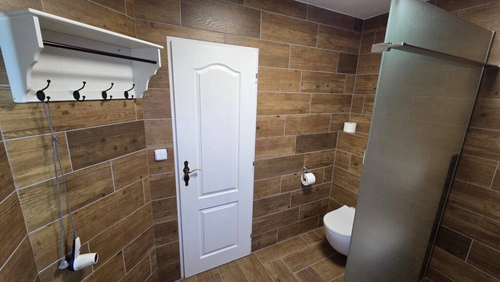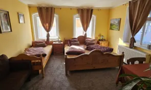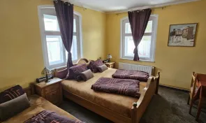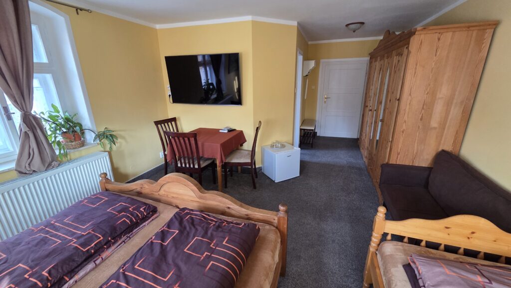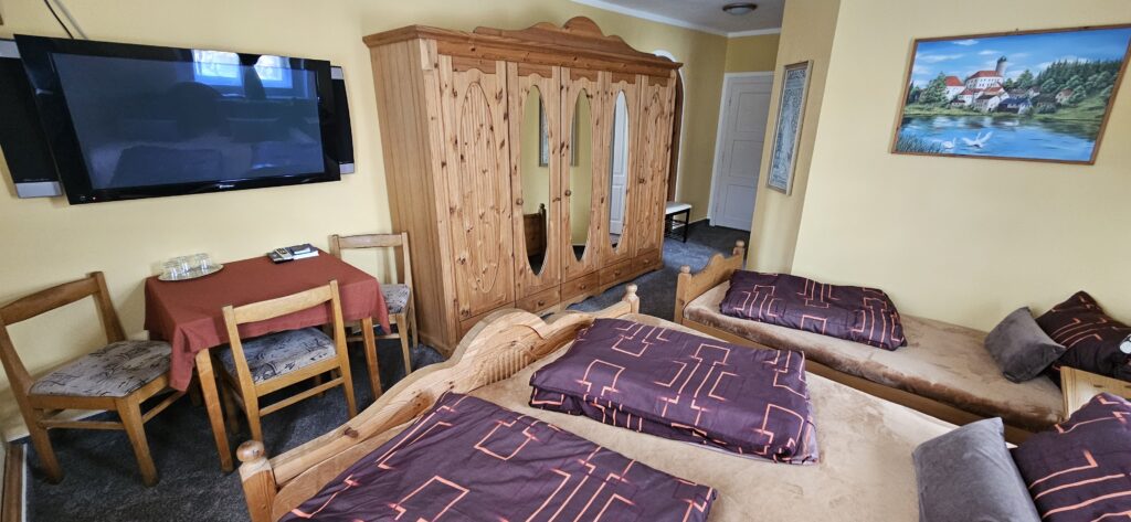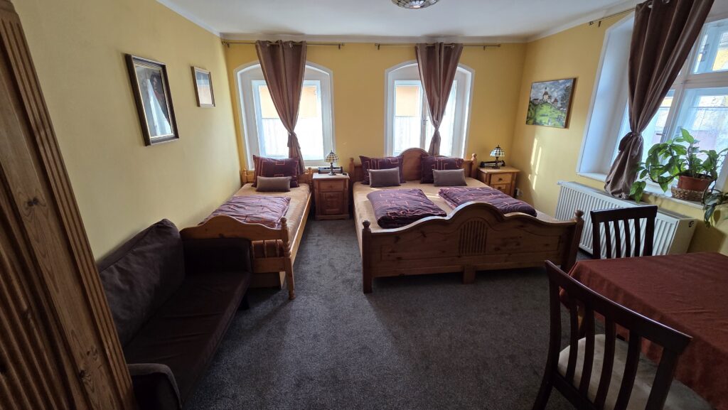 Ubytování je zajištěno ve třech komfortně zařízených pokojích s vlastním sociálním zařízením, které zahrnuje koupelnu se sprchou a toaletou. Součástí vybavení pokojů je také televize, lednička a trezor. Interiéry jsou světlé, čisté a laděné do klidných tónů, které podporují pocit pohody a domácí atmosféry. K dispozici je 2x třílůžkový a 1x čtyřlůžkový pokoj.