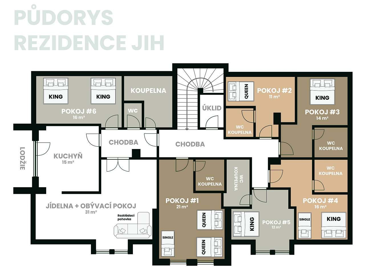 Rezidence Jih disponuje celkem 6 ložnicemi s kapacitou až 18 lůžek. V přízemí se nachází velkorysý prostor bývalé restaurace, který slouží jako společenská místnost s kapacitou až 30 osob. Součástí je bar s profesionálním chlazením a možnost zapůjčení výčepního zařízení, nechybí ani samostatný salonek. Objekt je vhodný jak pro rekreační pobyty, tak pro oslavy nebo setkání větších skupin.