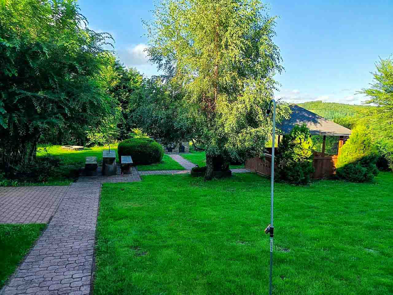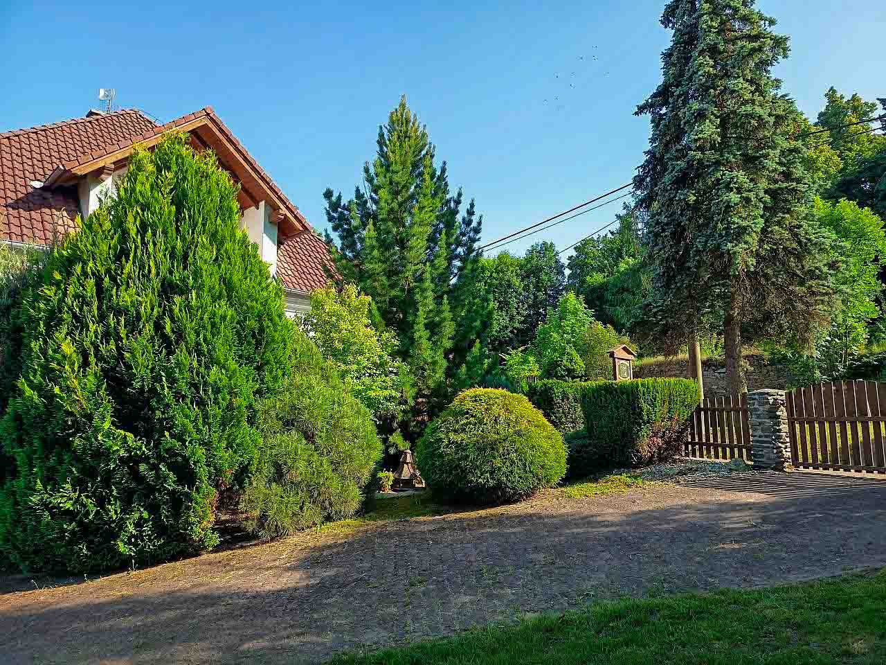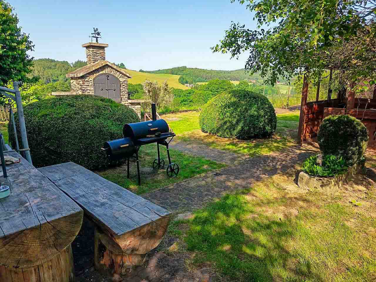 K domu náleží rozlehlá zahrada o velikosti téměř 4000 m², která nabízí venkovní i kryté posezení, ohniště, gril s udírnou a altán. Nechybí dětské hřiště s pískovištěm ani studna. Sportovní vyžití zajišťuje multifunkční kurt vhodný pro tenis, nohejbal, volejbal, badminton či přehazovanou a nově také venkovní ping-pong. Zahrada je oplocena směrem k silnici, směrem do louky je oplocení částečné.