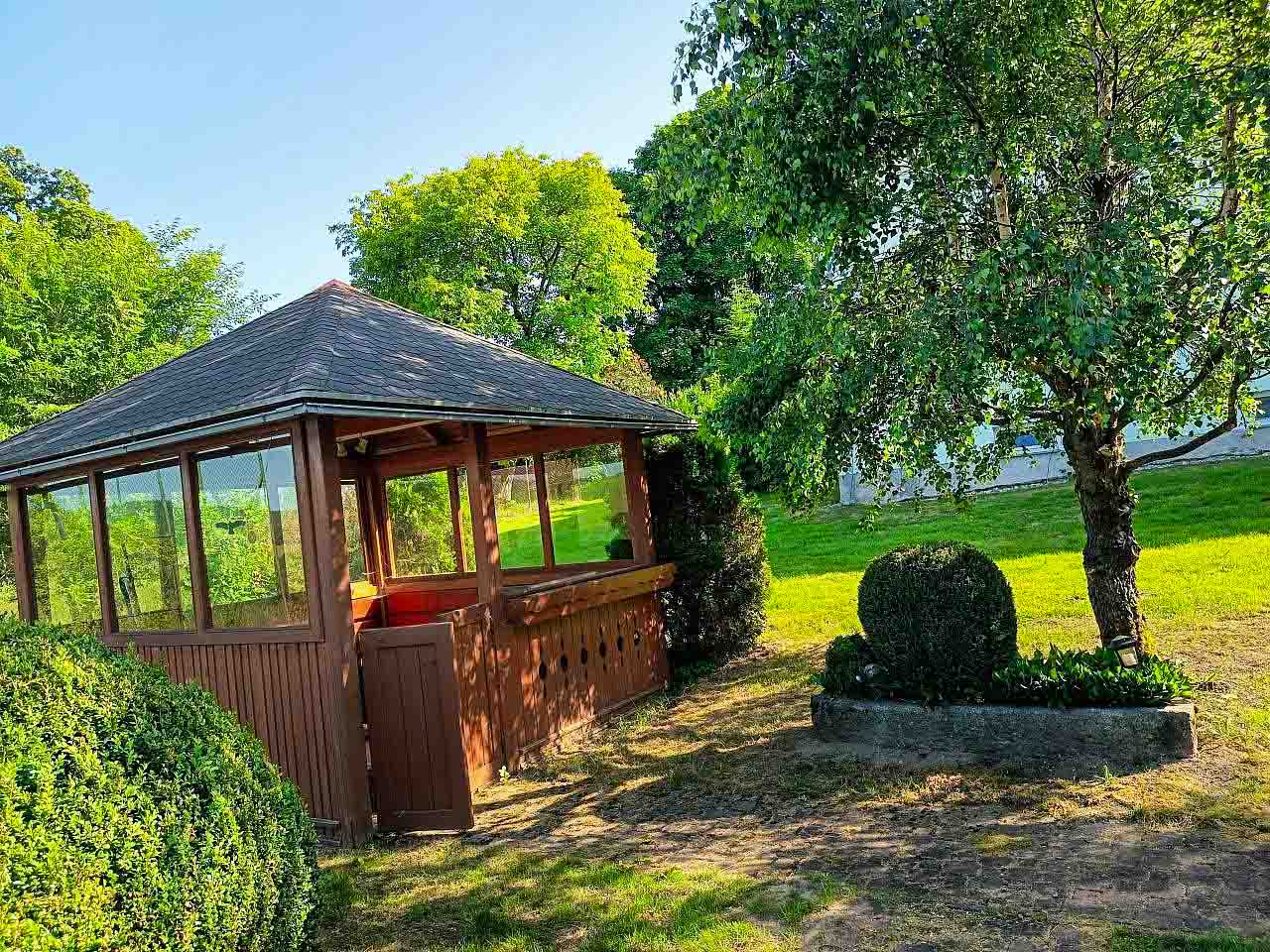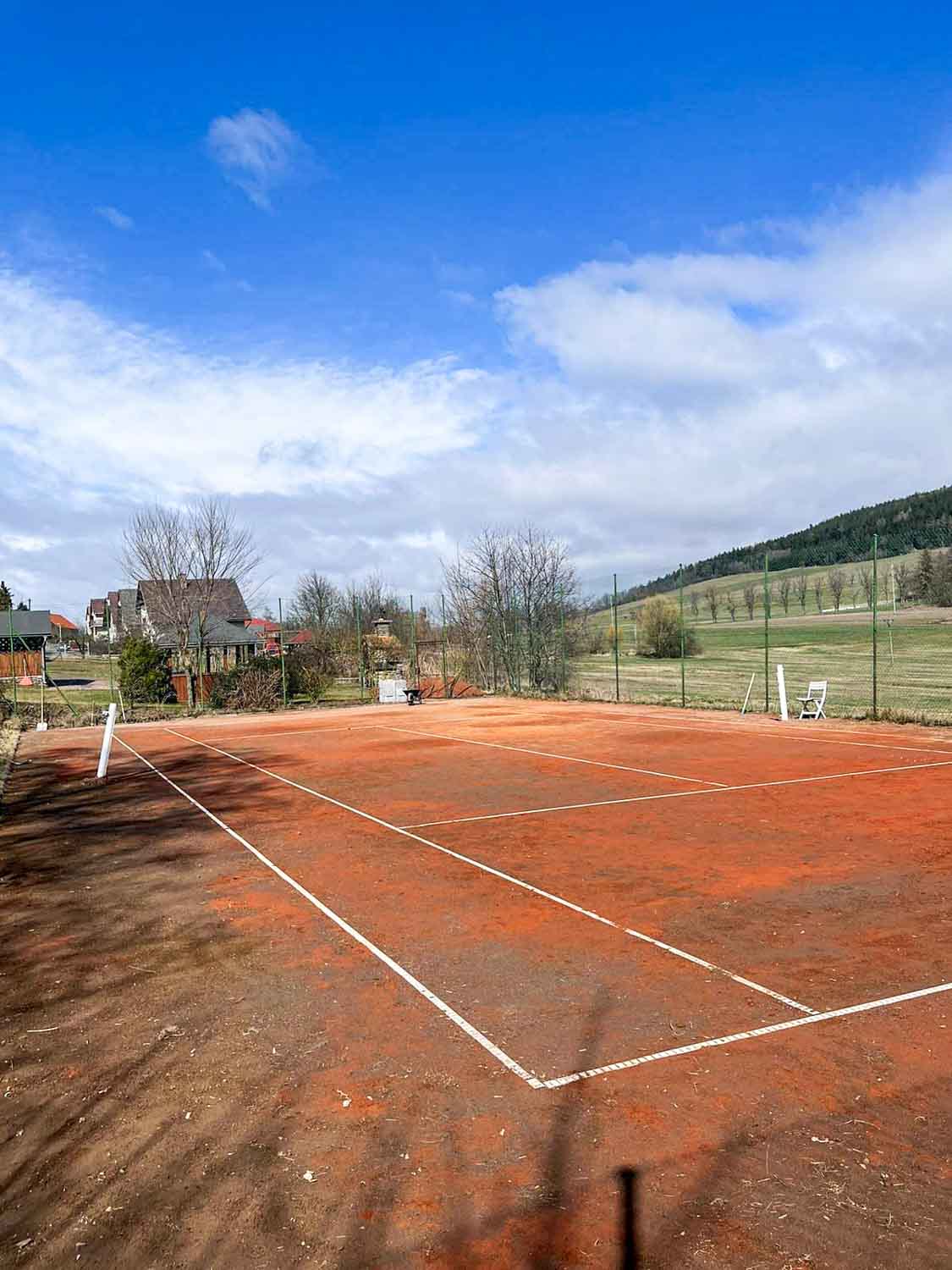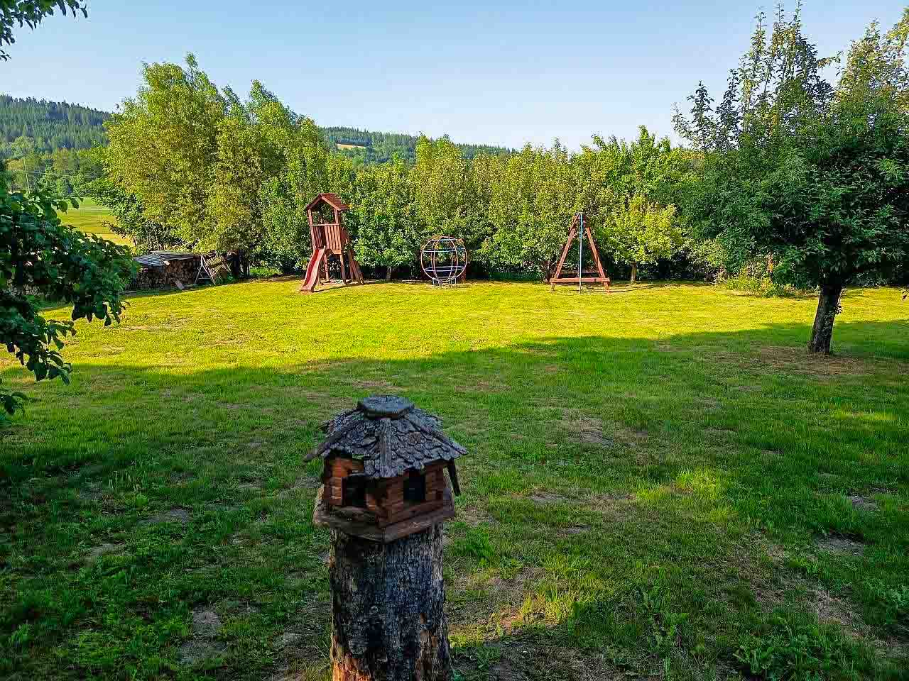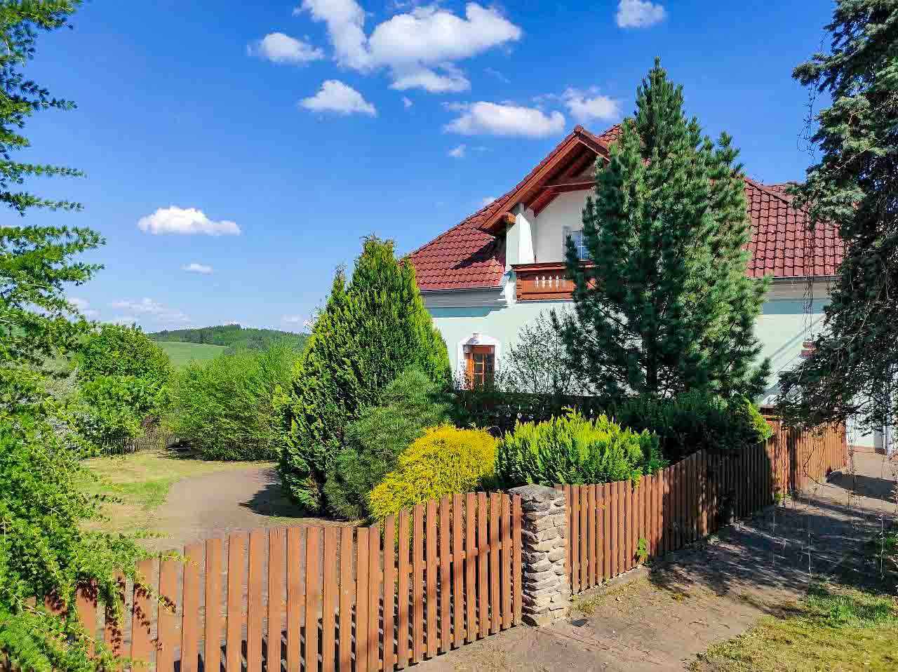K domu náleží rozlehlá zahrada o velikosti téměř 4000 m², která nabízí venkovní i kryté posezení, ohniště, gril s udírnou a altán. Nechybí dětské hřiště s pískovištěm ani studna. Sportovní vyžití zajišťuje multifunkční kurt vhodný pro tenis, nohejbal, volejbal, badminton či přehazovanou a nově také venkovní ping-pong. Zahrada je oplocena směrem k silnici, směrem do louky je oplocení částečné.