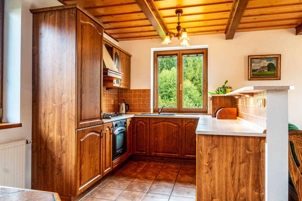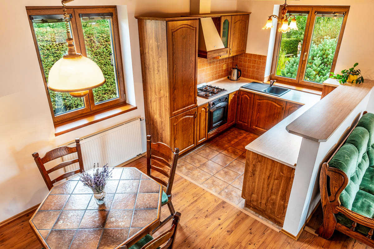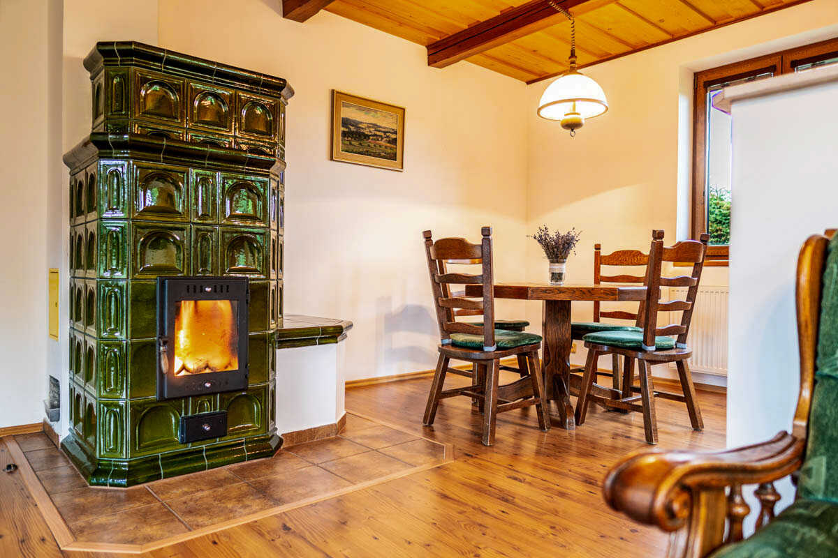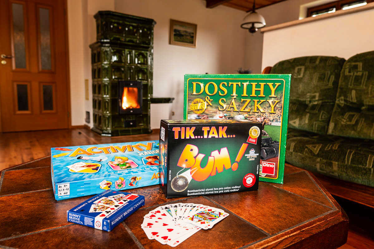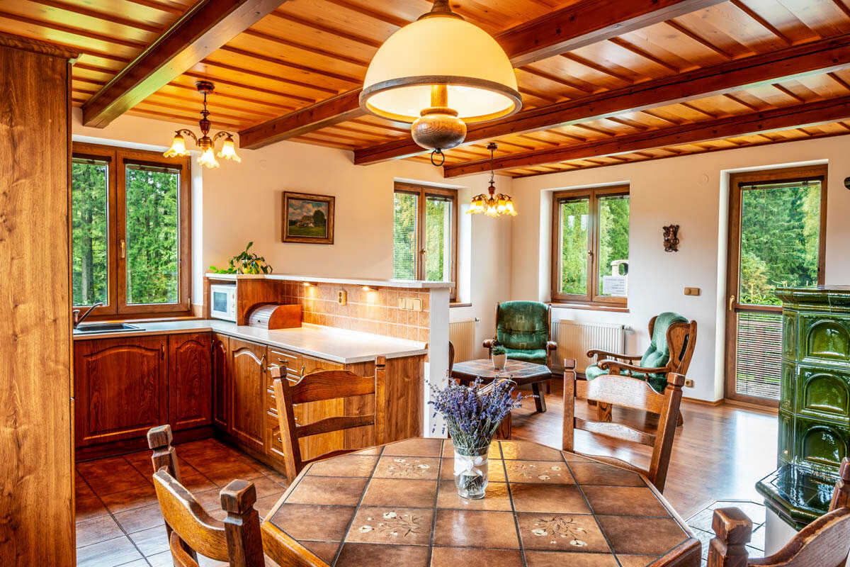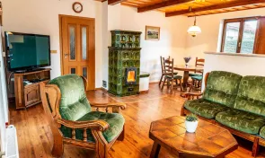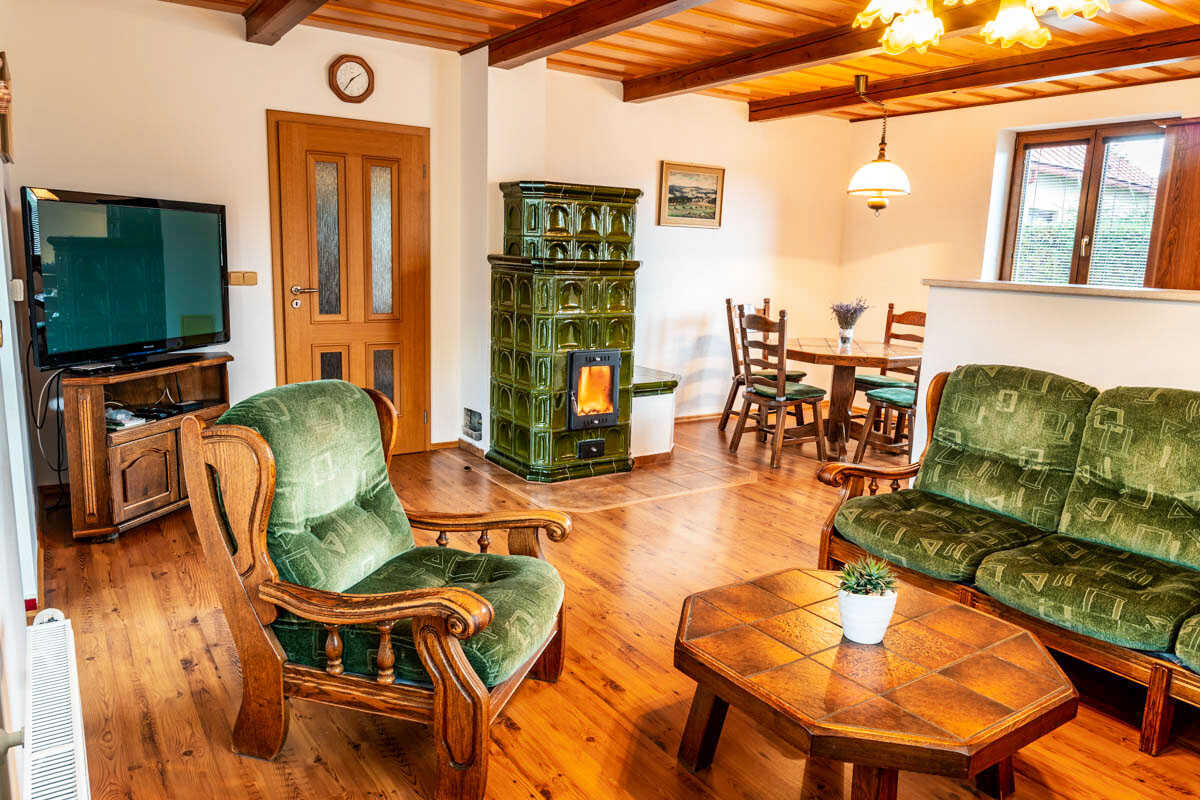 V přízemí se rozprostírá společenský prostor s obývacím pokojem a plně vybavenou kuchyní, kde nechybí lednice, mikrovlnná trouba, rychlovarná konvice, myčka nádobí ani základní kuchyňské nádobí. Obývací část je zařízena pohodlným sezením, televizí se satelitním příjmem a kachlovými kamny, které vytvářejí příjemnou atmosféru zejména v zimních měsících.