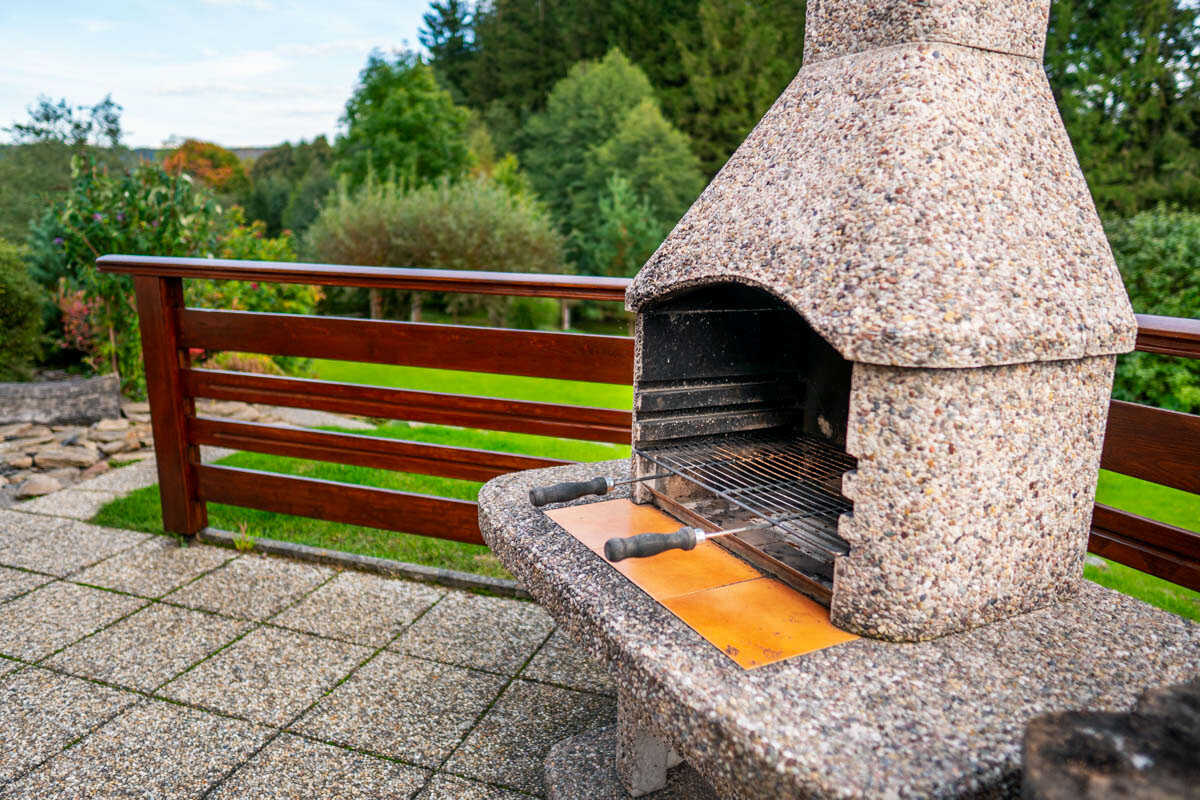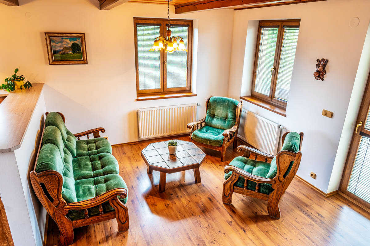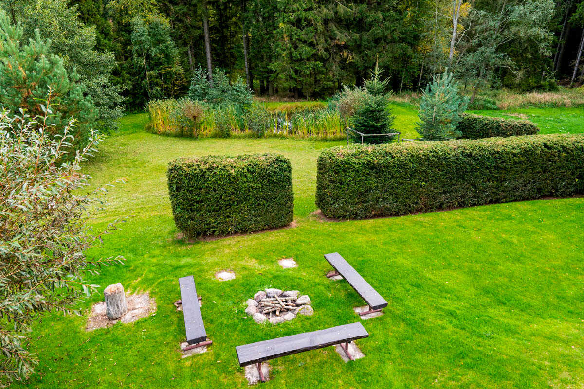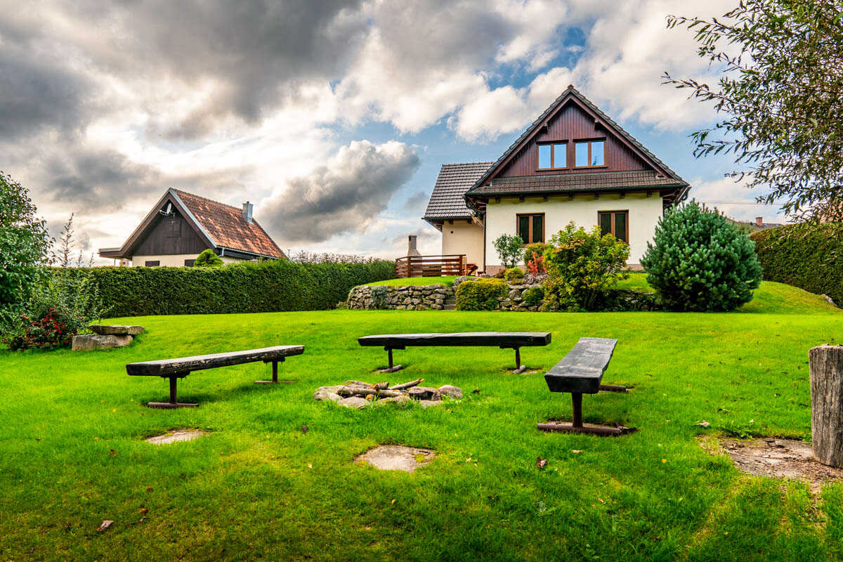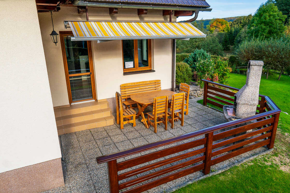 Z obývacího pokoje je přímý vstup na terasu s venkovním posezením, grilem a krbem, kde si hosté mohou vychutnat snídani na čerstvém vzduchu nebo večerní grilování při západu slunce. Na zahradě najdete také ohniště pro opékání buřtů, travnatou plochu vhodnou pro relaxaci nebo hry dětí a krásný výhled do okolní přírody.