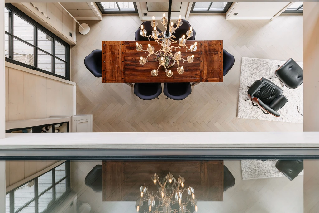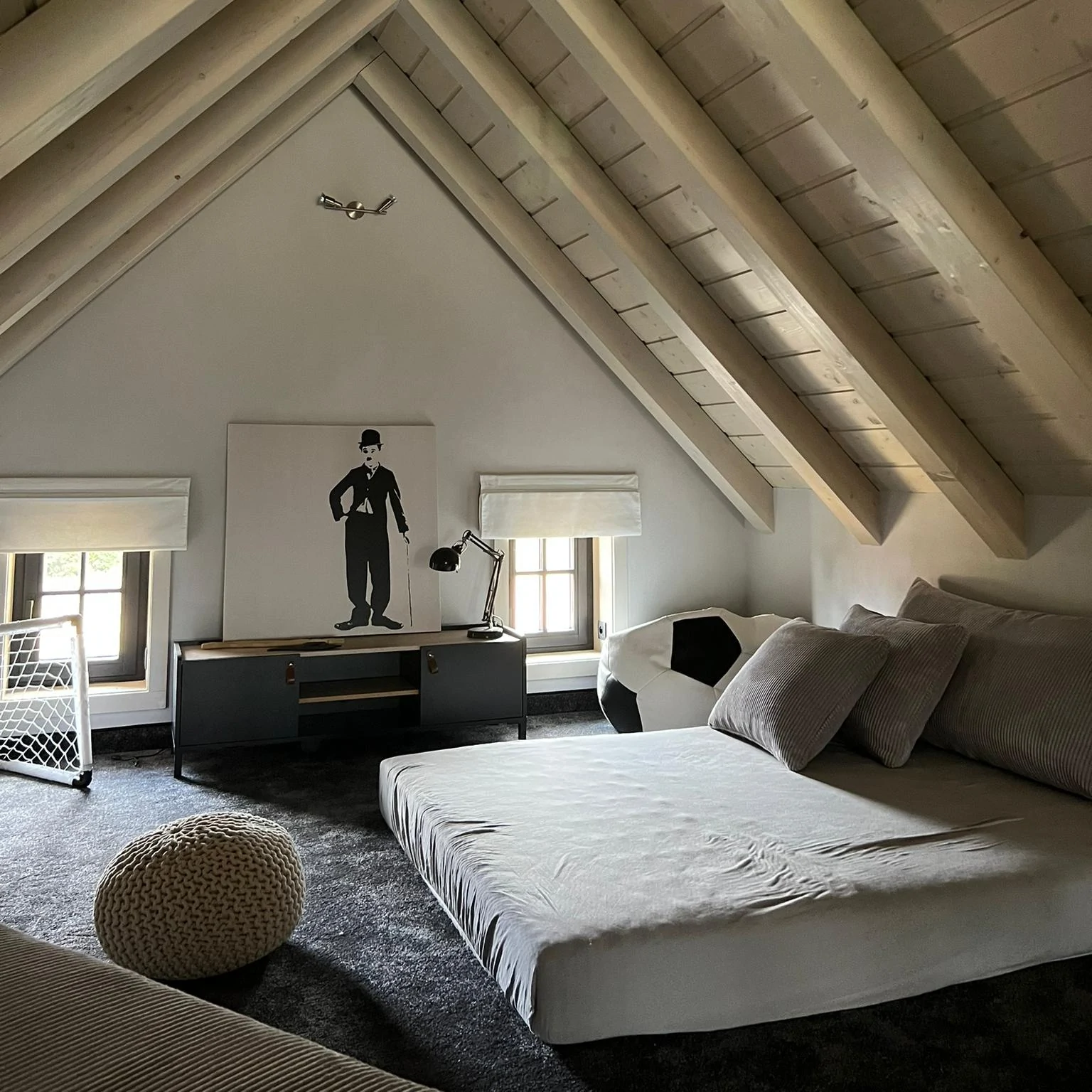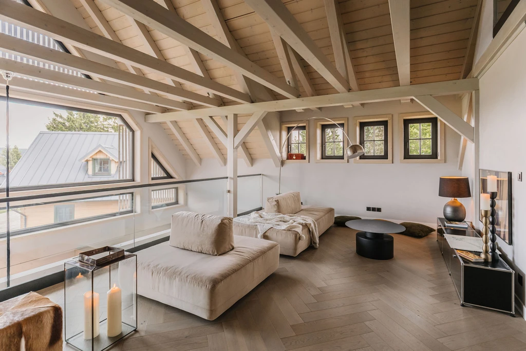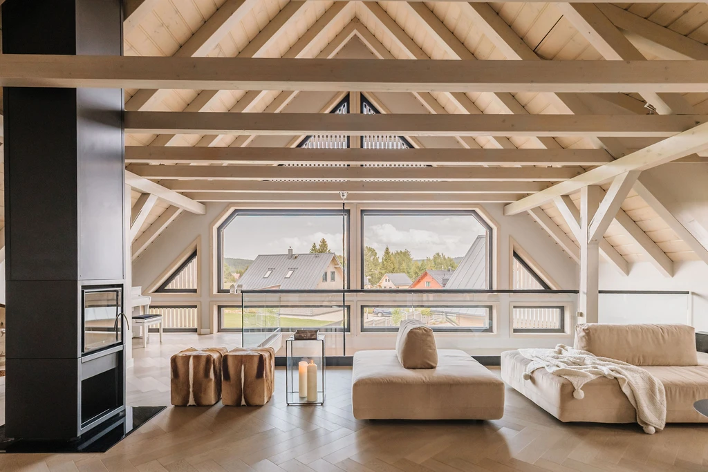 V patře se nachází lounge prostor s pohodlným posezením, televizí a krbem, který slouží jako klidné místo pro odpočinek a večerní relaxaci.