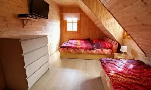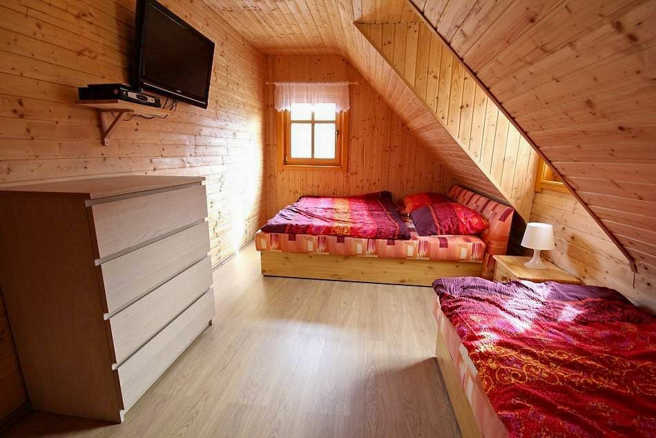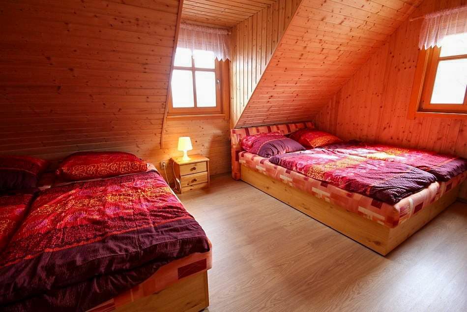 V podkroví se nacházejí tři čtyřlůžkové ložnice, z nichž dvě jsou vybaveny televizí. Jedna ložnice disponuje manželskou postelí a palandou, ostatní kombinují manželské a samostatné postele. K dispozici je také dětská postýlka. Další dvě lůžka nabízí rozkládací pohovku ve společenské místnosti.
