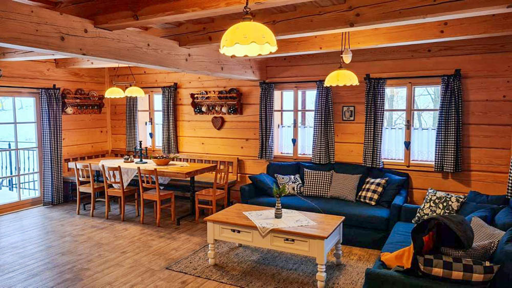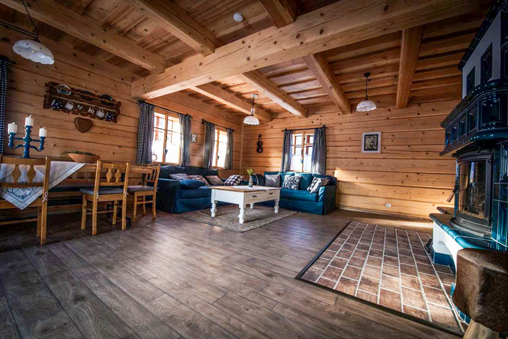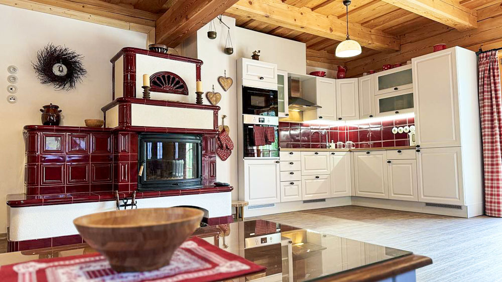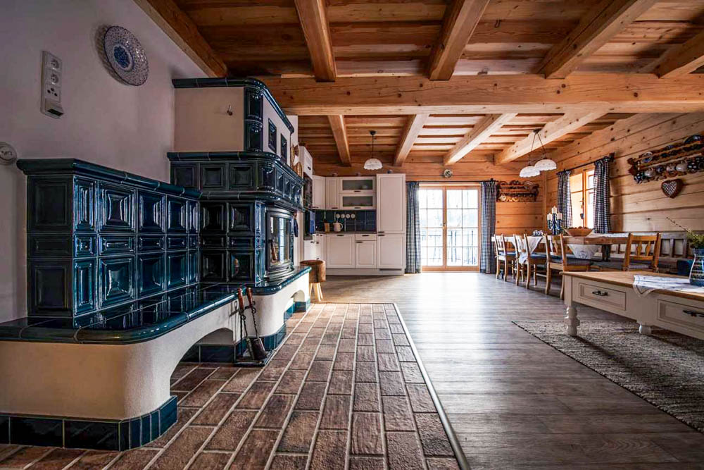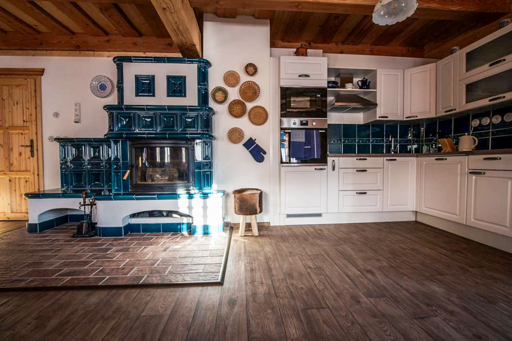 V přízemí se nachází velký obývací prostor propojený s kuchyní, který tvoří srdce celé roubenky. Hosté zde najdou plně vybavenou kuchyň s veškerými spotřebiči (trouba, varná deska, myčka, lednice s mrazákem, mikrovlnka, rychlovarná konvice) i dostatek nádobí pro pohodlné vaření. Obývací část s krbem a pohodlným posezením je ideální pro společné večery, kdy si lze užít teplo kachlových kamen a výhled na okolní hory.