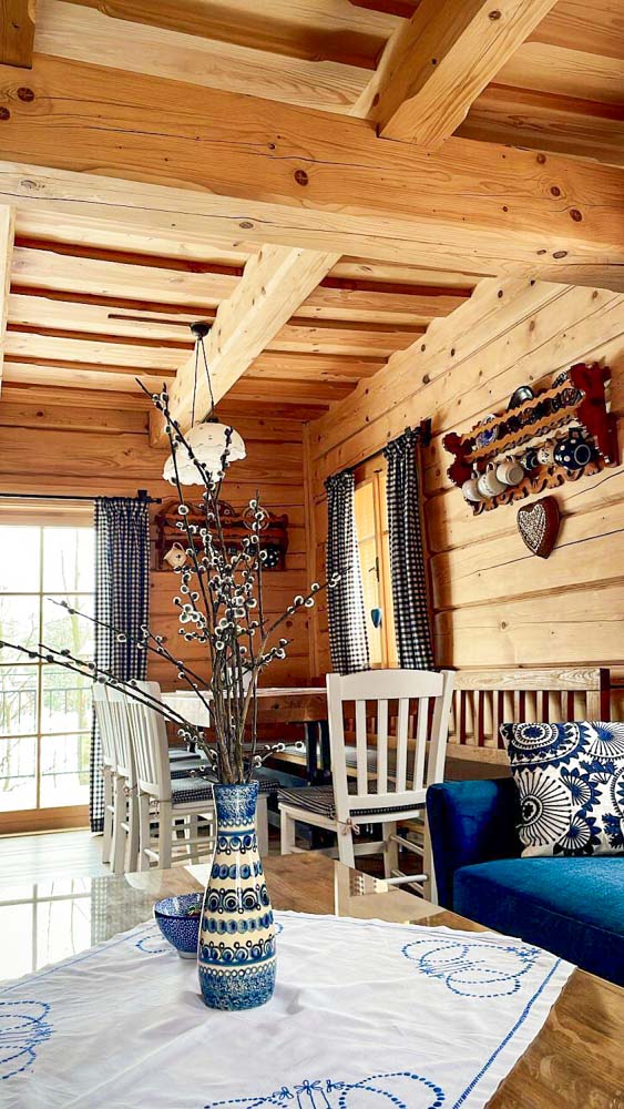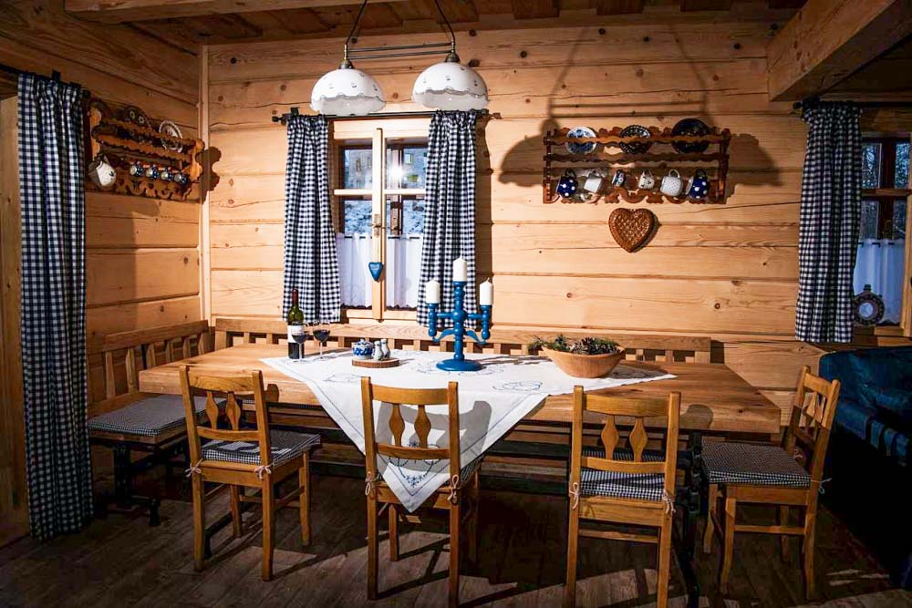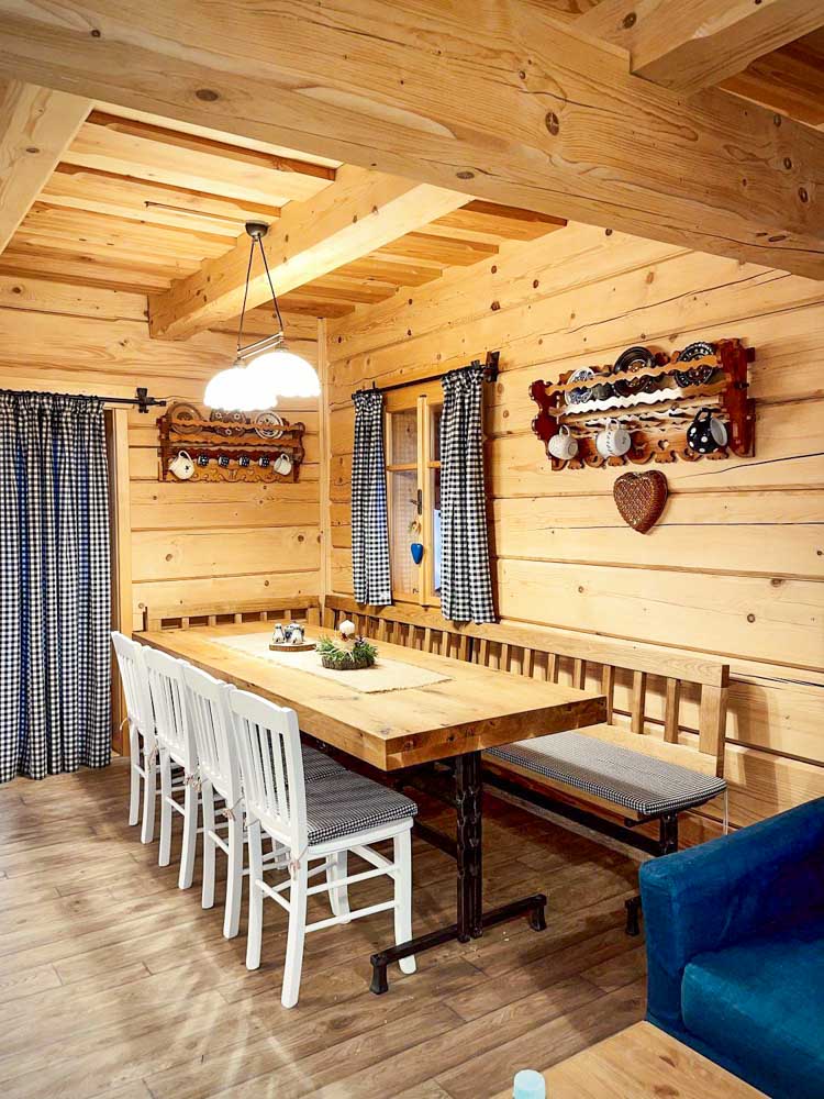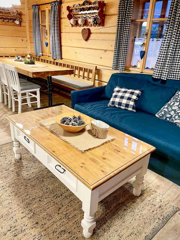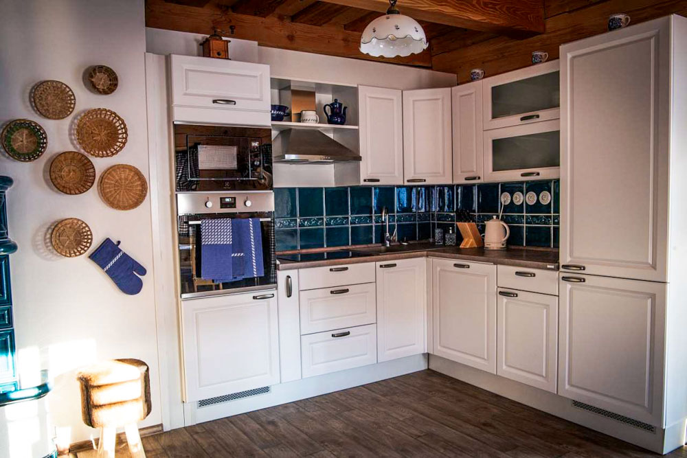 V přízemí se nachází velký obývací prostor propojený s kuchyní, který tvoří srdce celé roubenky. Hosté zde najdou plně vybavenou kuchyň s veškerými spotřebiči (trouba, varná deska, myčka, lednice s mrazákem, mikrovlnka, rychlovarná konvice) i dostatek nádobí pro pohodlné vaření. Obývací část s krbem a pohodlným posezením je ideální pro společné večery, kdy si lze užít teplo kachlových kamen a výhled na okolní hory.