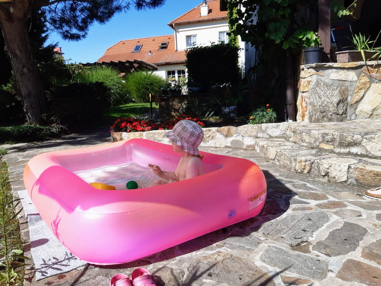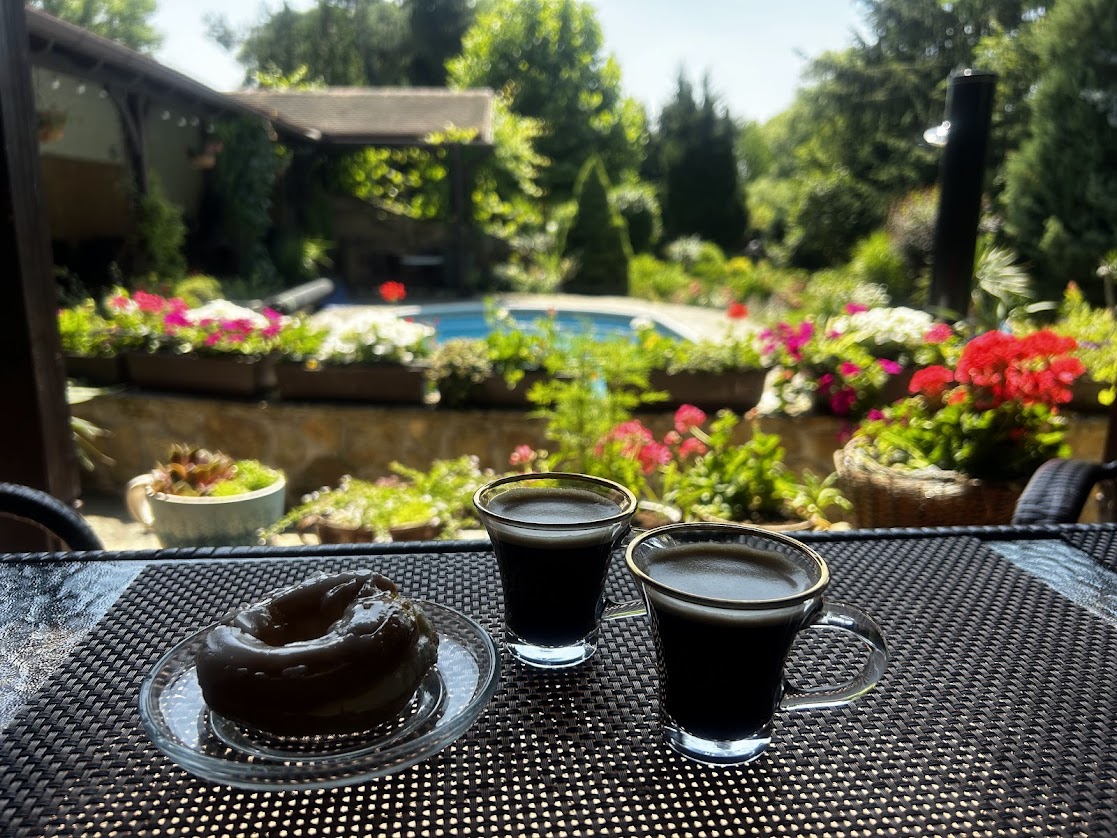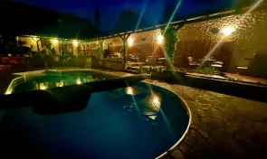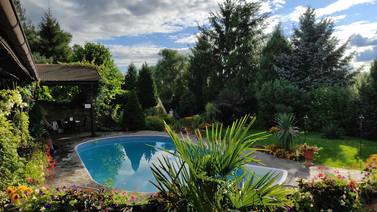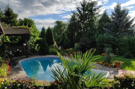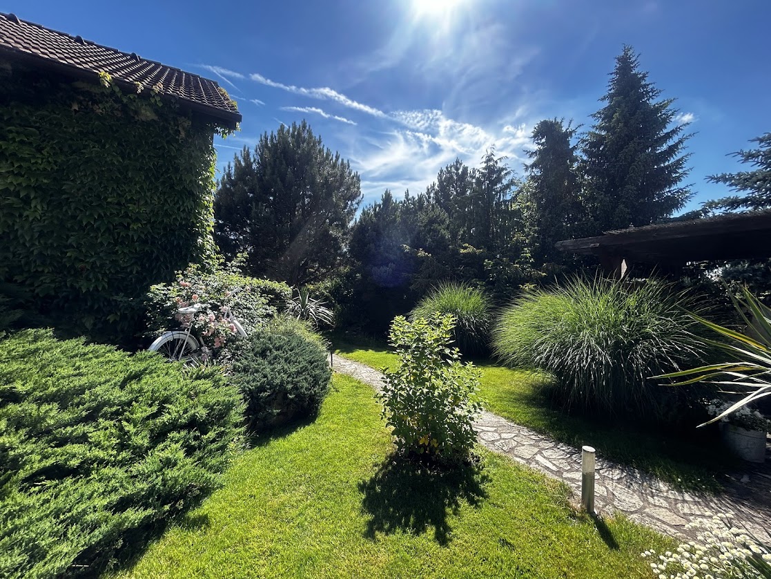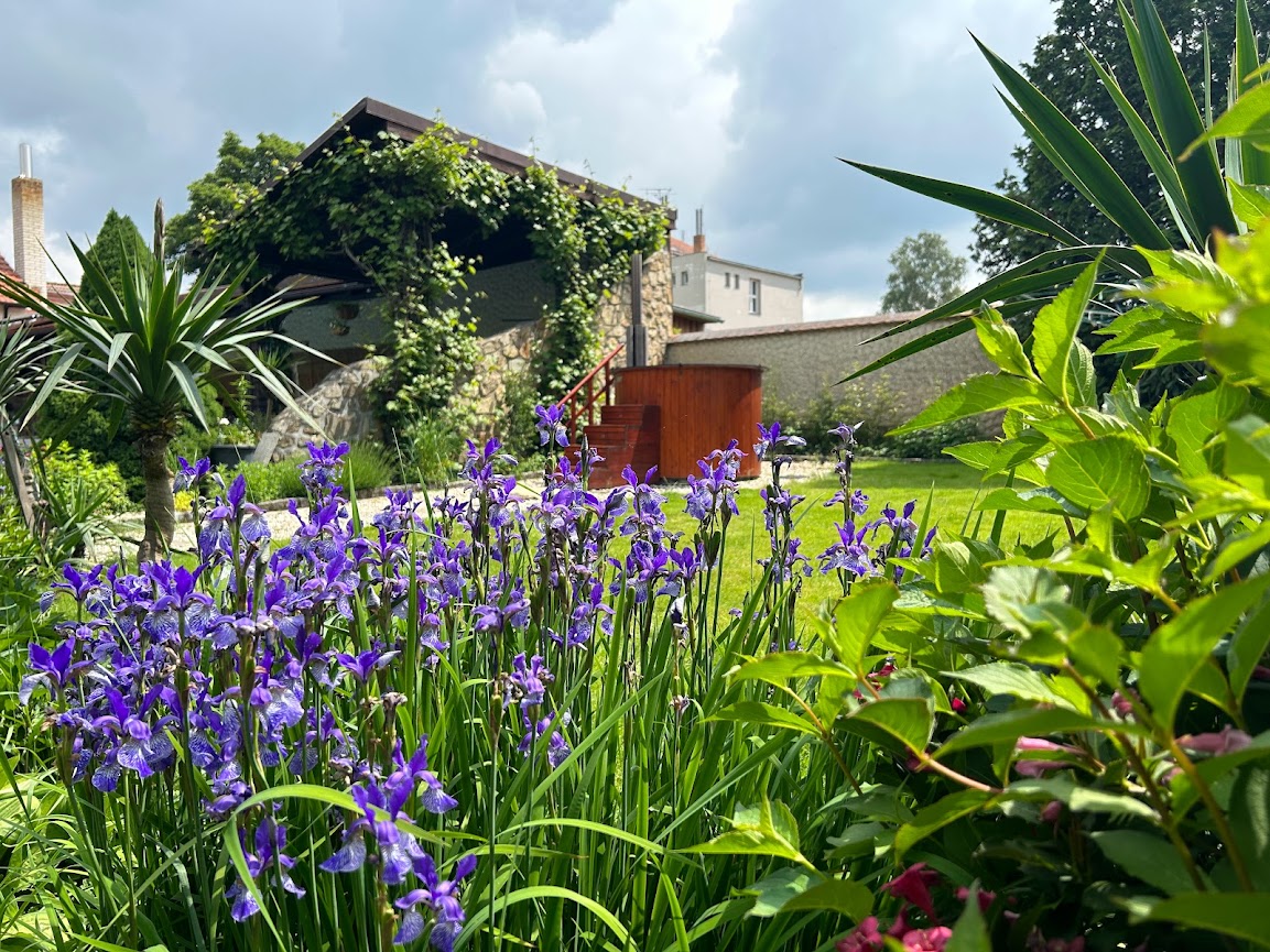 Celý objekt je zasazen do zahrady s pečlivě udržovanou zelení, květinovými záhony a klidnou atmosférou. Nachází se zde i solárně vyhřívaný venkovní bazén, ideální pro letní osvěžení. Nechybí ani koupací sud, infrasauna, lehátka, venkovní bar a posezení s grilem a ohništěm, kde si můžete užít večery u sklenky vína nebo s přáteli u ohně.