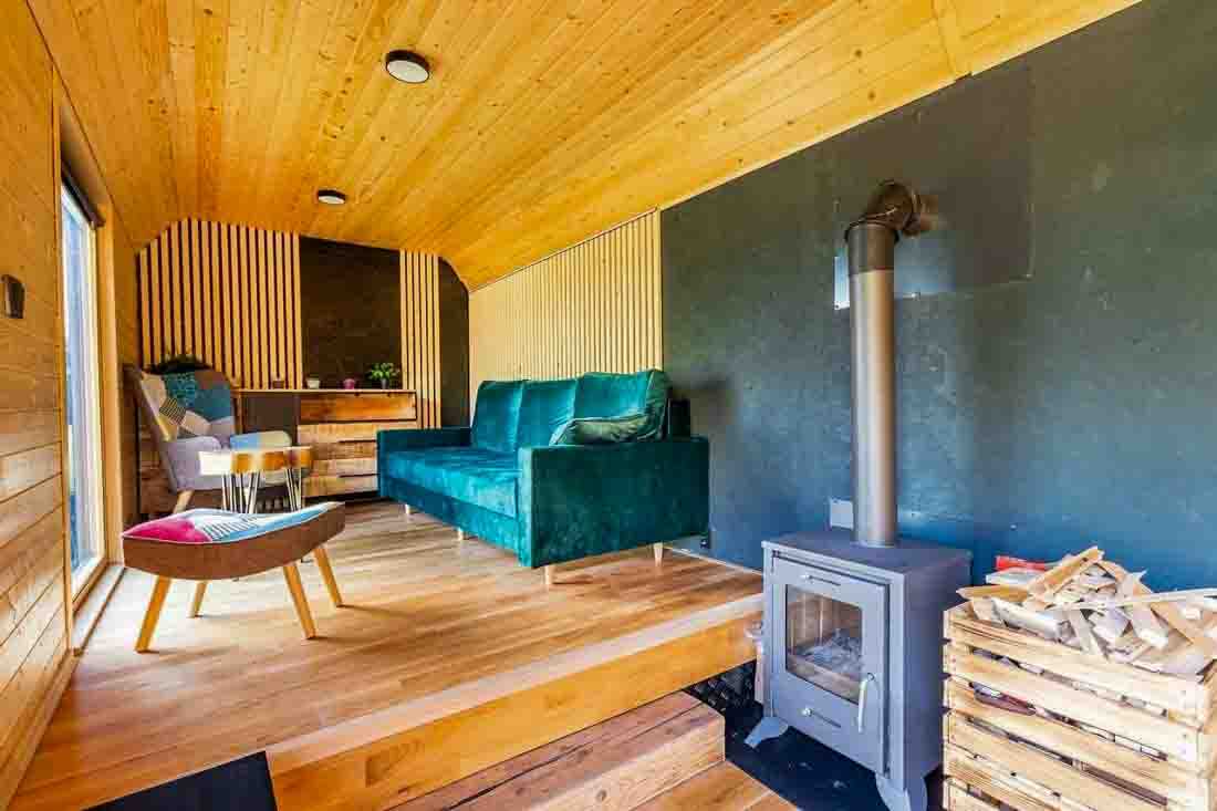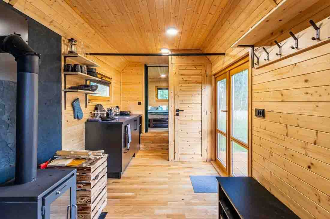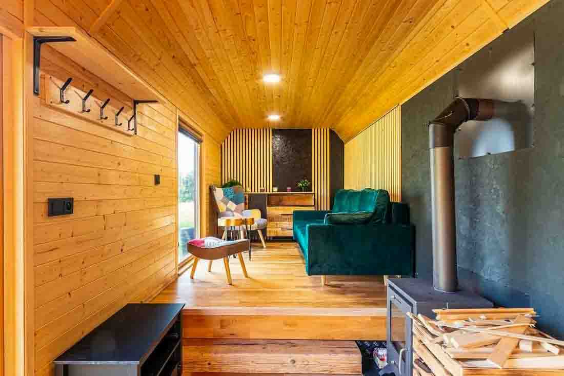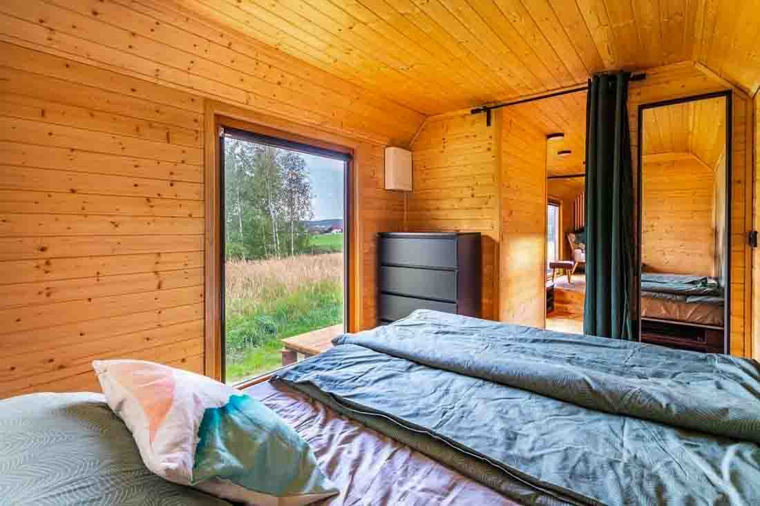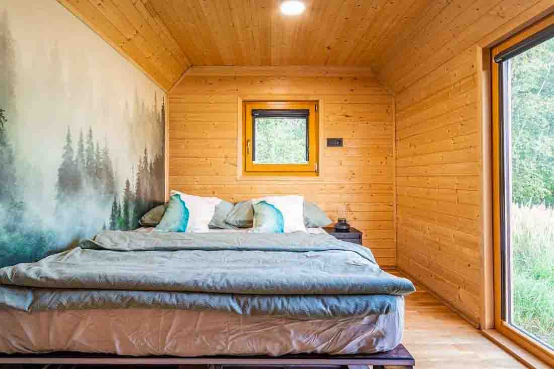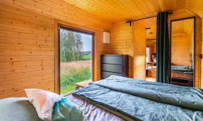 Ubytování je určeno pro 2 osoby, rozkládací gauč umožňuje pobyt až 4 hostů. K dispozici je ložnice se zatemňujícími látkovými roletami pro nerušený spánek a obývací část s posezením. V chladnějších dnech prostor vyhřejí kamna (dřevo za příplatek).
