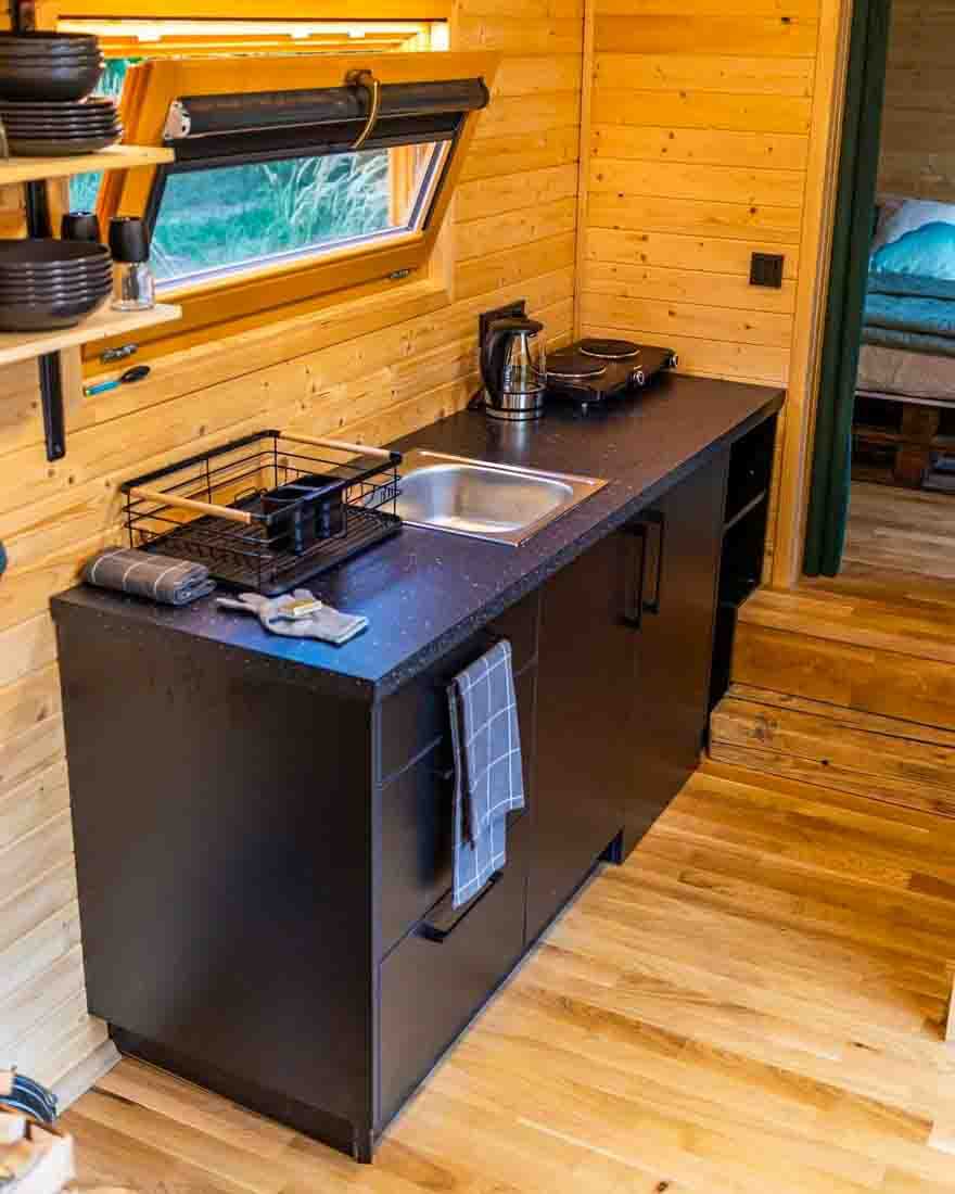 Součástí vybavení je stylová kuchyňka s elektrickým vařičem, rychlovarnou konvicí, menší lednicí a základními ingrediencemi (sůl, pepř, olivový olej). Nechybí nádobí, skleničky ani příbory. Samotka je plně připojena na elektřinu a disponuje Wi-Fi připojením a bezdrátovým bluetooth reproduktorem.