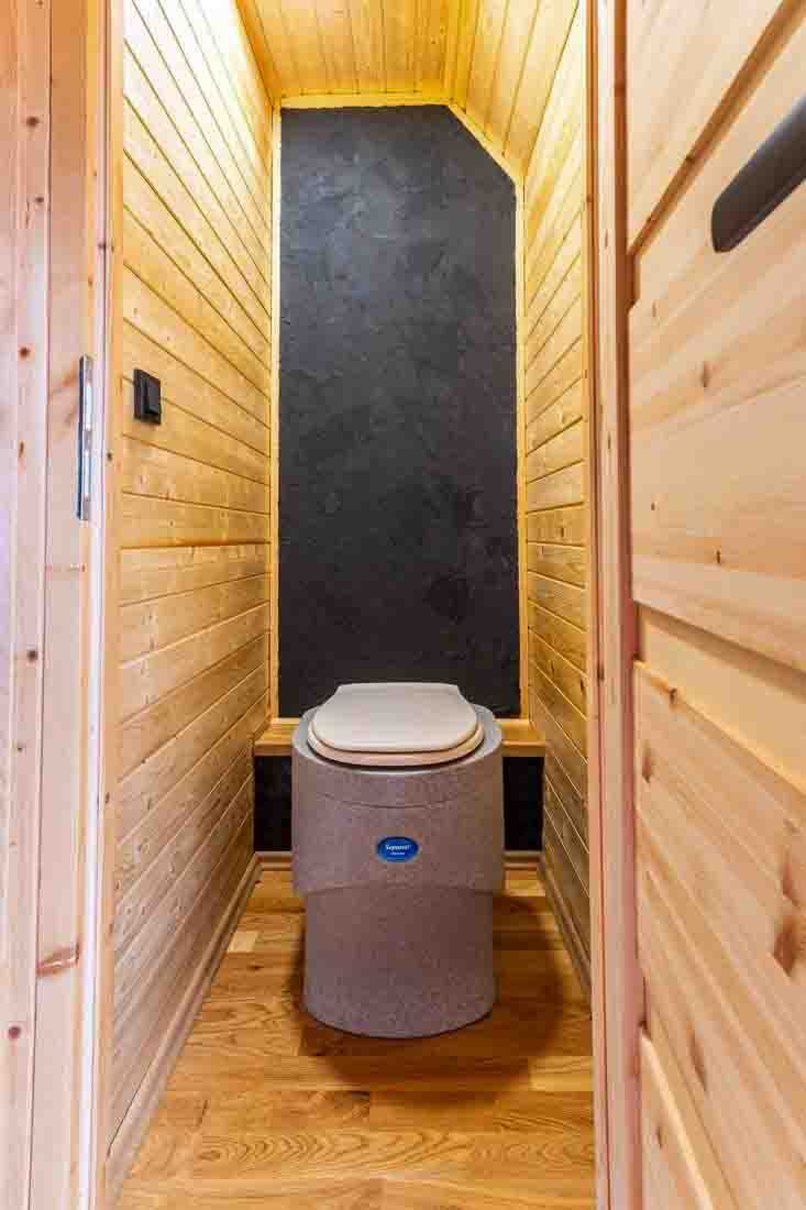 Uvnitř se nachází separační WC. Sprcha není k dispozici – k opláchnutí slouží kanystry s pitnou vodou a nádrž s dešťovou vodou. Hosté mají připravené ručníky i hygienické ubrousky.