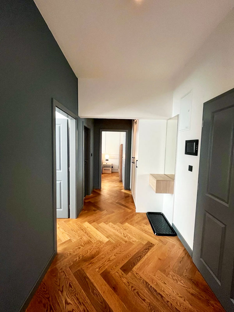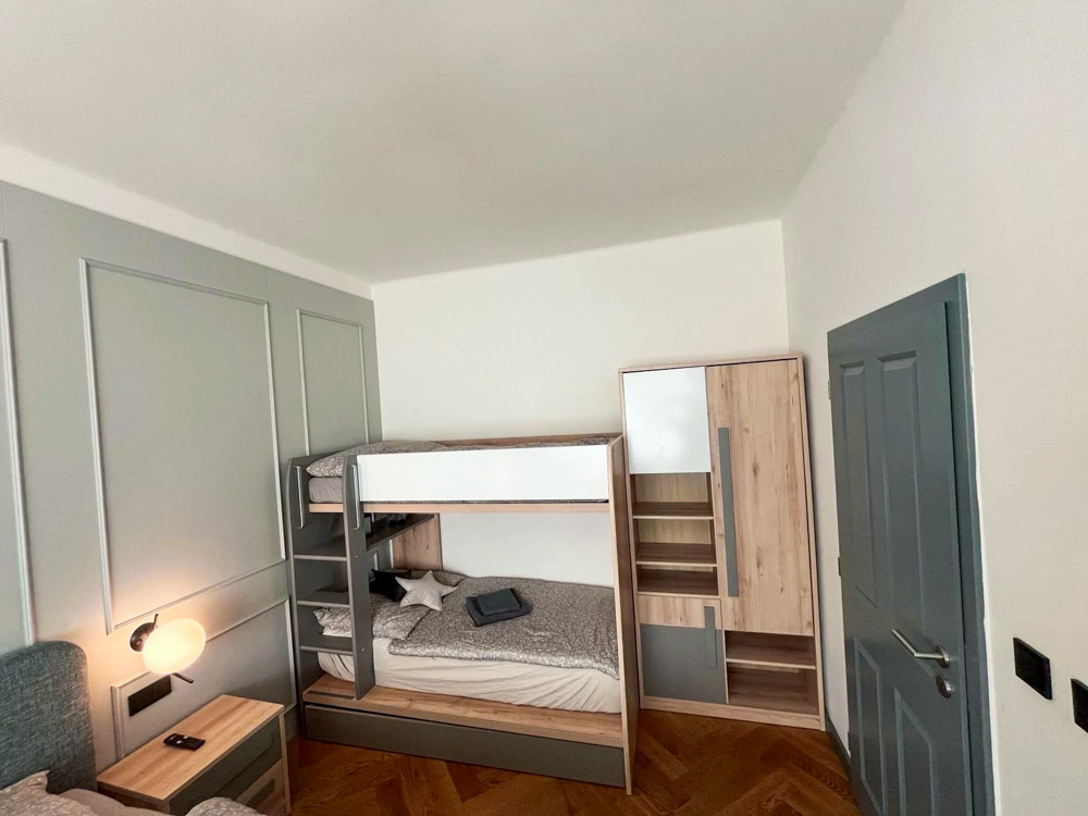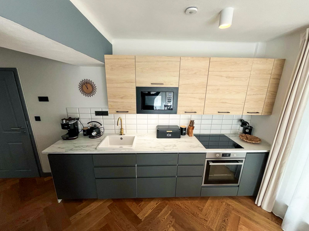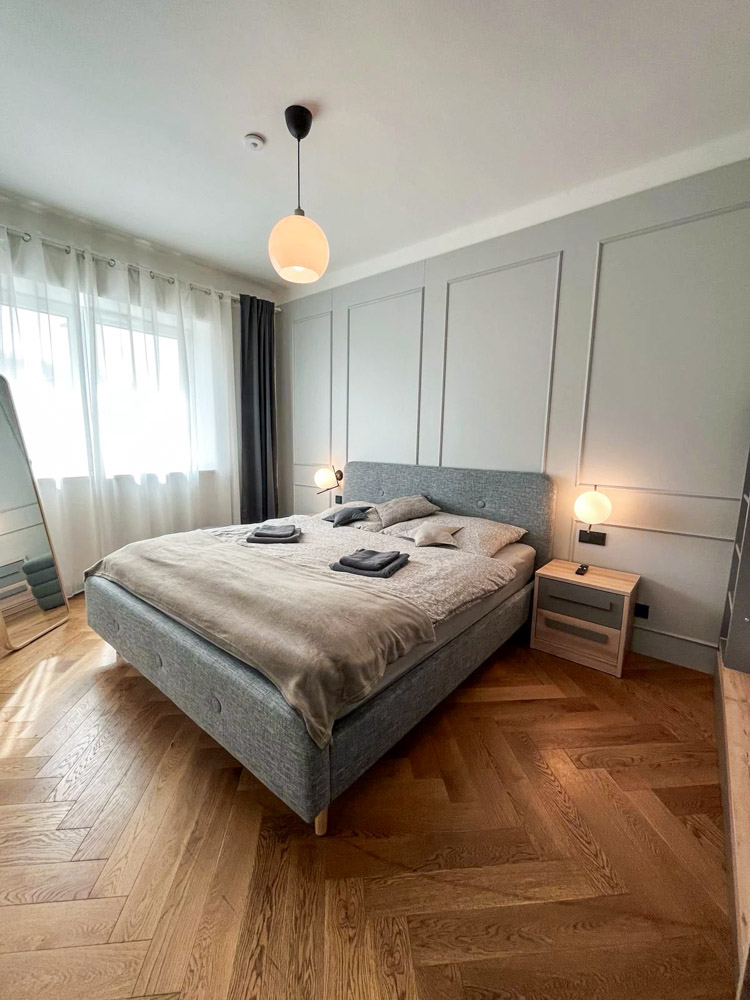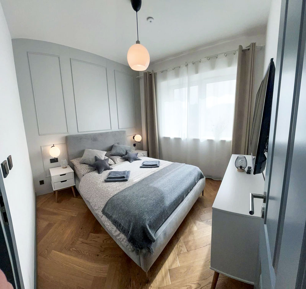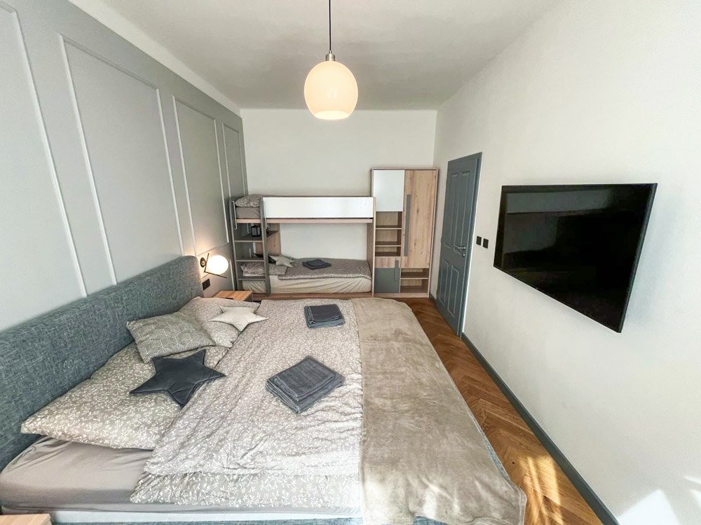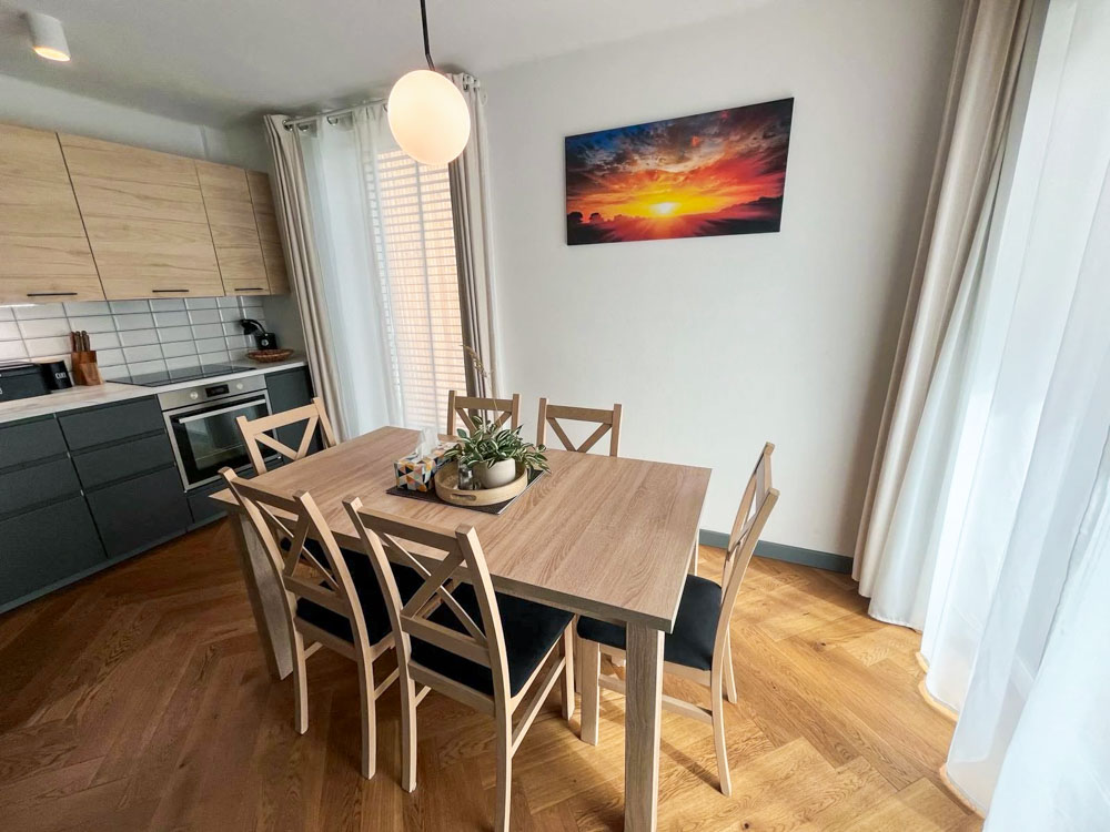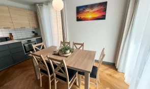 Slunečný apartmán je moderní a prostorné ubytování s kapacitou až 6 osob (ideálně 4 dospělí a 2 děti). Nachází se v přízemí vily a disponuje dvěma ložnicemi – v každé je manželská postel, v jedné navíc palanda. Součástí apartmánu je plně vybavená kuchyň s lednicí, mikrovlnkou, troubou, kávovarem, toustovačem a indukční varnou deskou. Nechybí ani jídelní kout, obývací prostor s TV a Wi-Fi připojením, elegantní koupelna a přímý vstup na terasou se zahradou.
