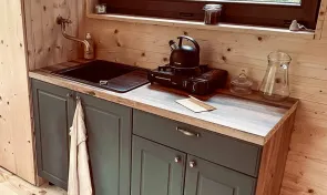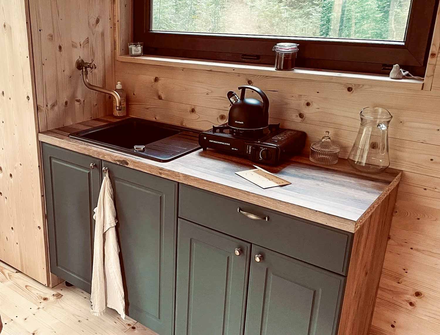 K dispozici je kuchyňský koutek s plynovým vařičem, konvicí, nádobím, příbory, hrncem a pánví. Nechybí malá lednice, přenosný venkovní gril ani možnost přípravy kávy. Voda je zajištěna s ohledem na šetrné hospodaření. Hygienický koutek tvoří pozinkovaný lavor, mýdlo, ručníky, osušky a základní hygienické potřeby. U objektu se nachází suché WC nazývané „Komnata odevzdání“. Elektřina je řešena pomocí fotovoltaiky, k dispozici je nabíjení přes USB. Parkování probíhá u nedalekého rybníku, k samotnému domku se dochází pěšky nebo po domluvě odvozem.